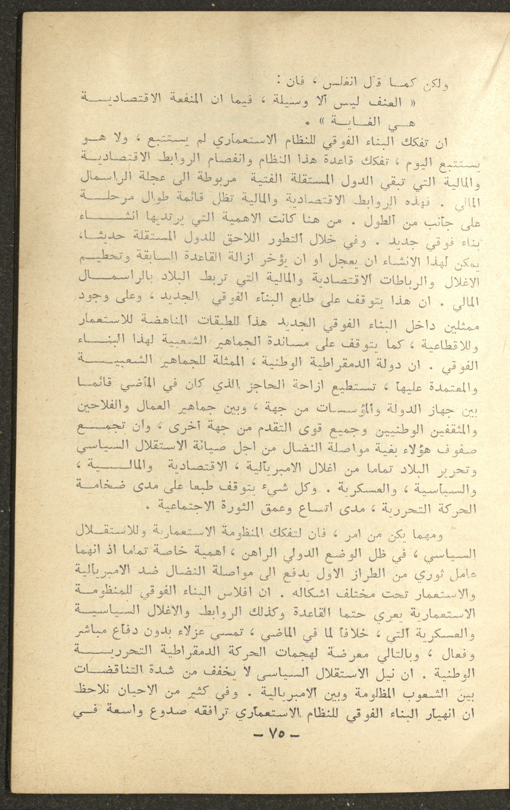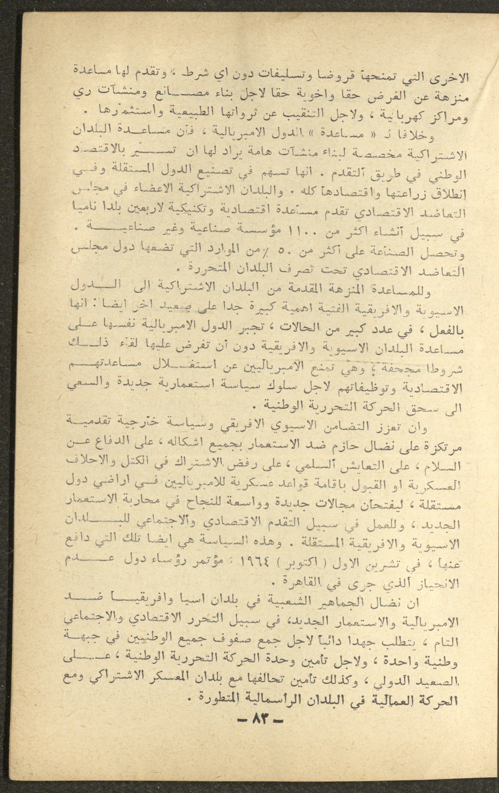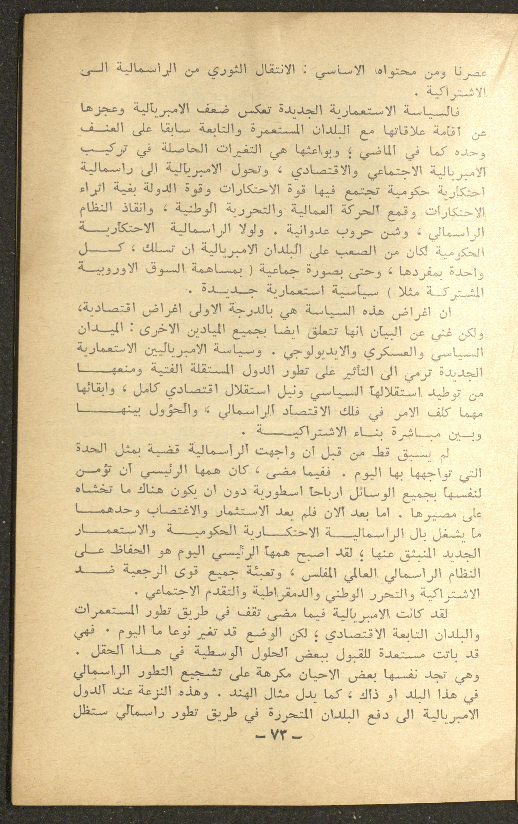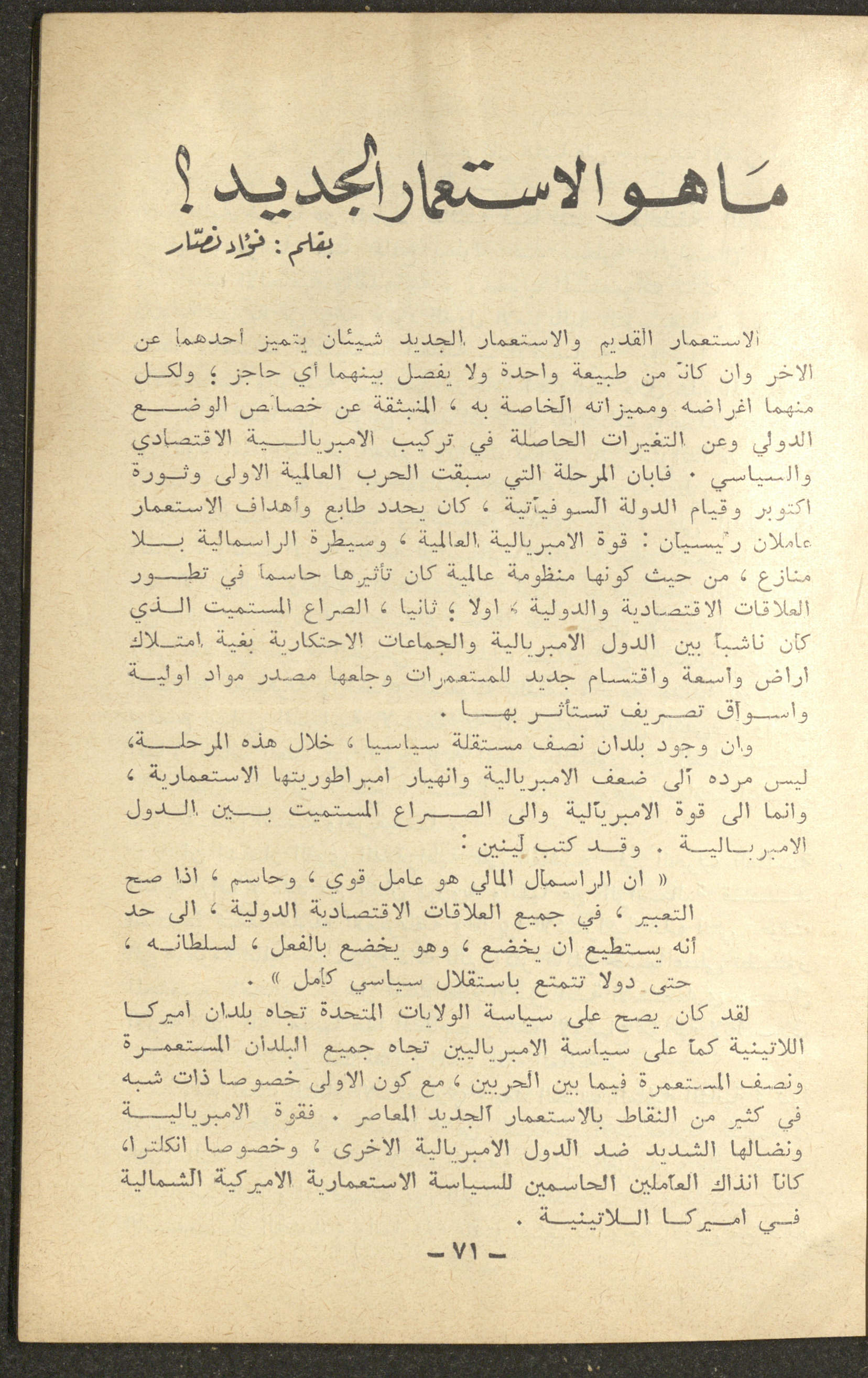 Issued in January 1965, this document shows a section of the 1st issue of al-Waqt Magazine, which is a monthly literary and political magazine published in Beirut. It included news and articles about the communist movement in the world. The issue contained an article by Palestinian political leader Fu'ad Nassar, titled "What Is Neo-Colonialism?".