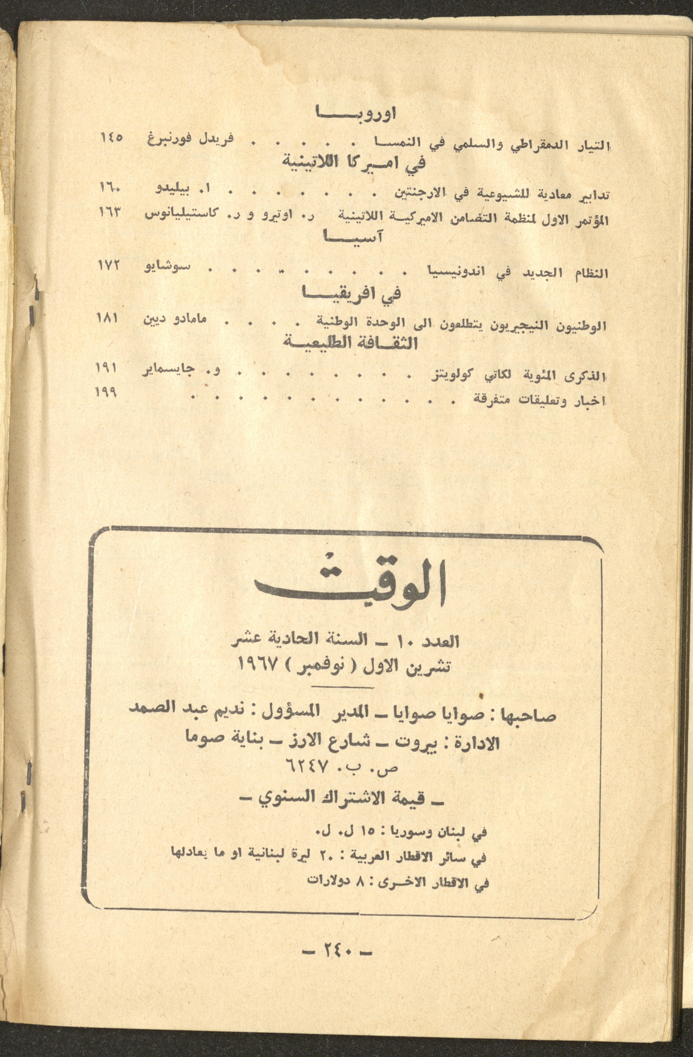 Issued in October 1967, this document shows a section of the 10th issue of al-Waqt Magazine, which is a monthly literary and political magazine published in Beirut. It included news and articles about the communist movement in the world.