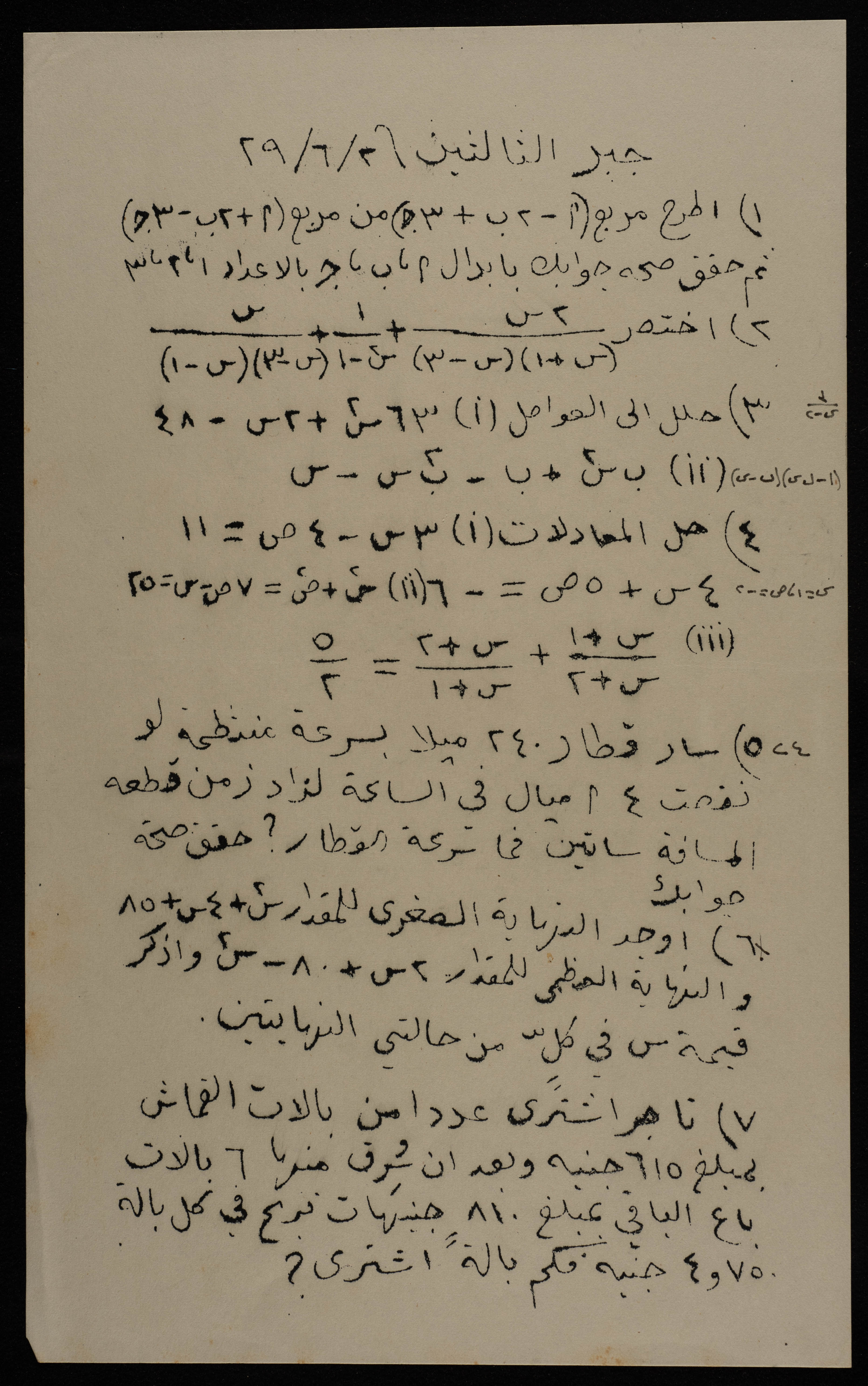 Found in the Sakher al-Khatib Collection and dated 2 June 1929, this document shows an algebra exam, which belonged to a member of the al-Khatib Family who studied at the Arab College in Jerusalem.