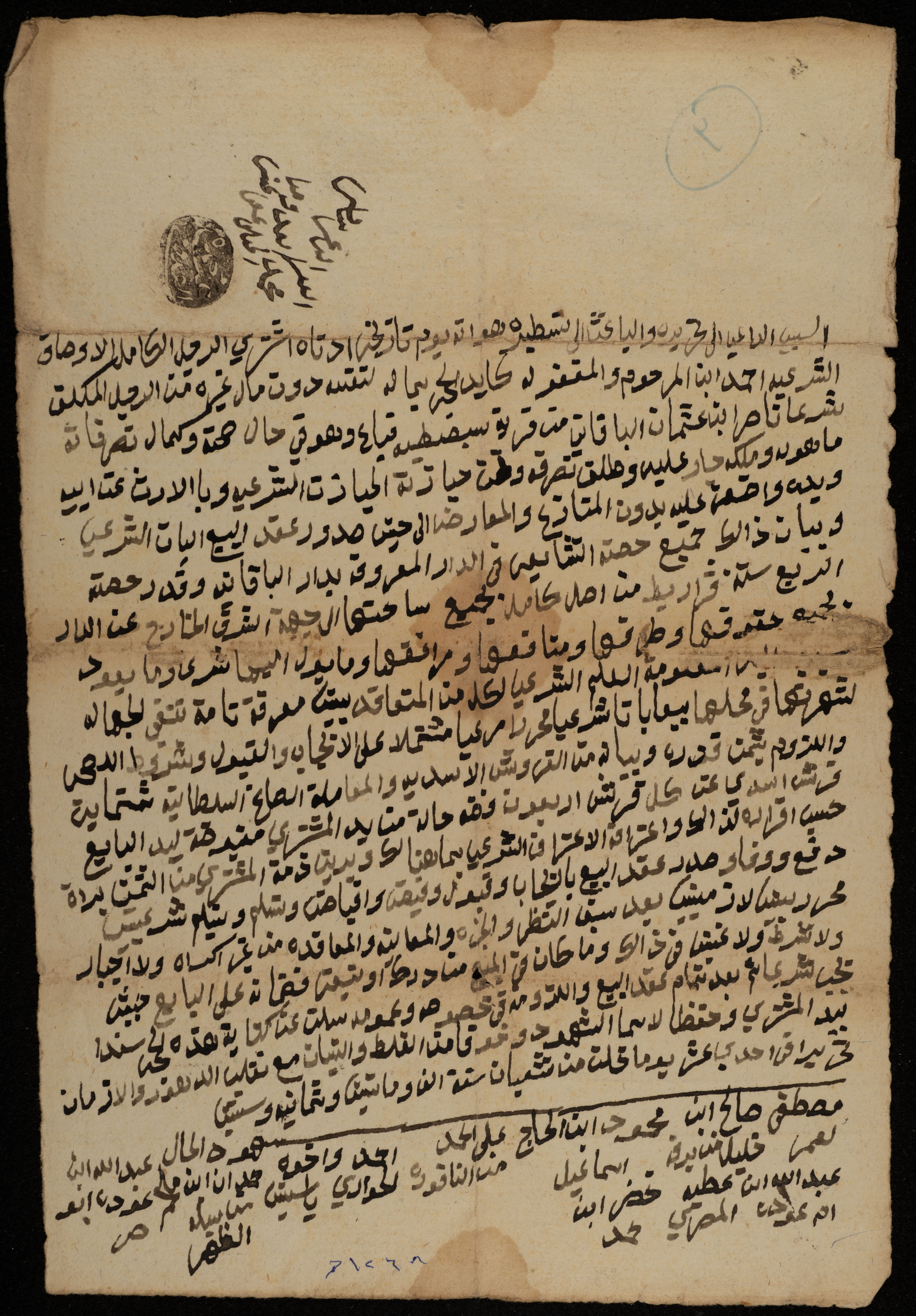 Issued on 11 Shaʻban 1268 AH, corresponding to 31 May 1852 AD, this document shows a "land" sale deed in Ijnisinya from Naser Othman to Ahmad al-Kayed from the village of Sebastia, signed by the witnesses.