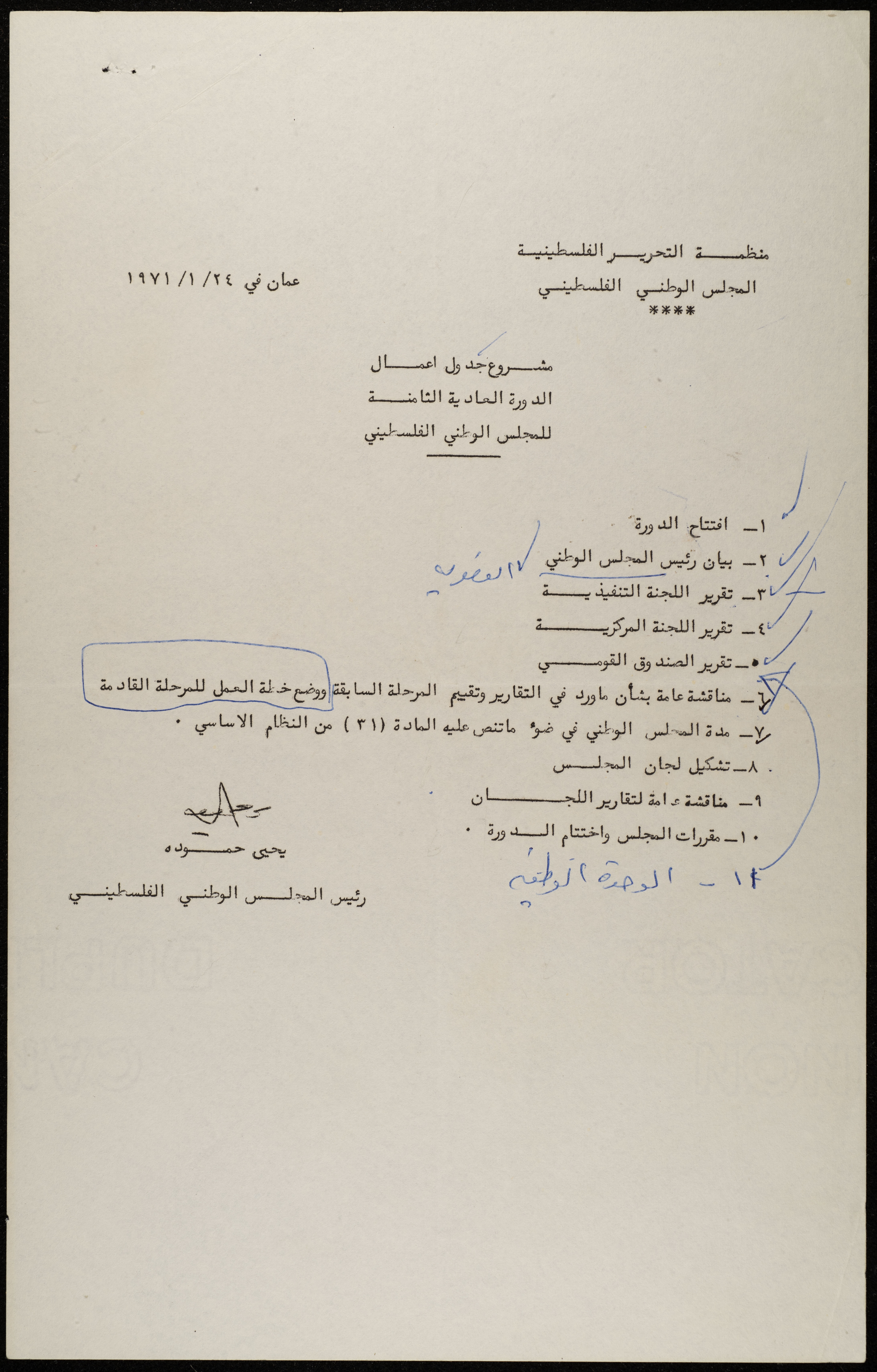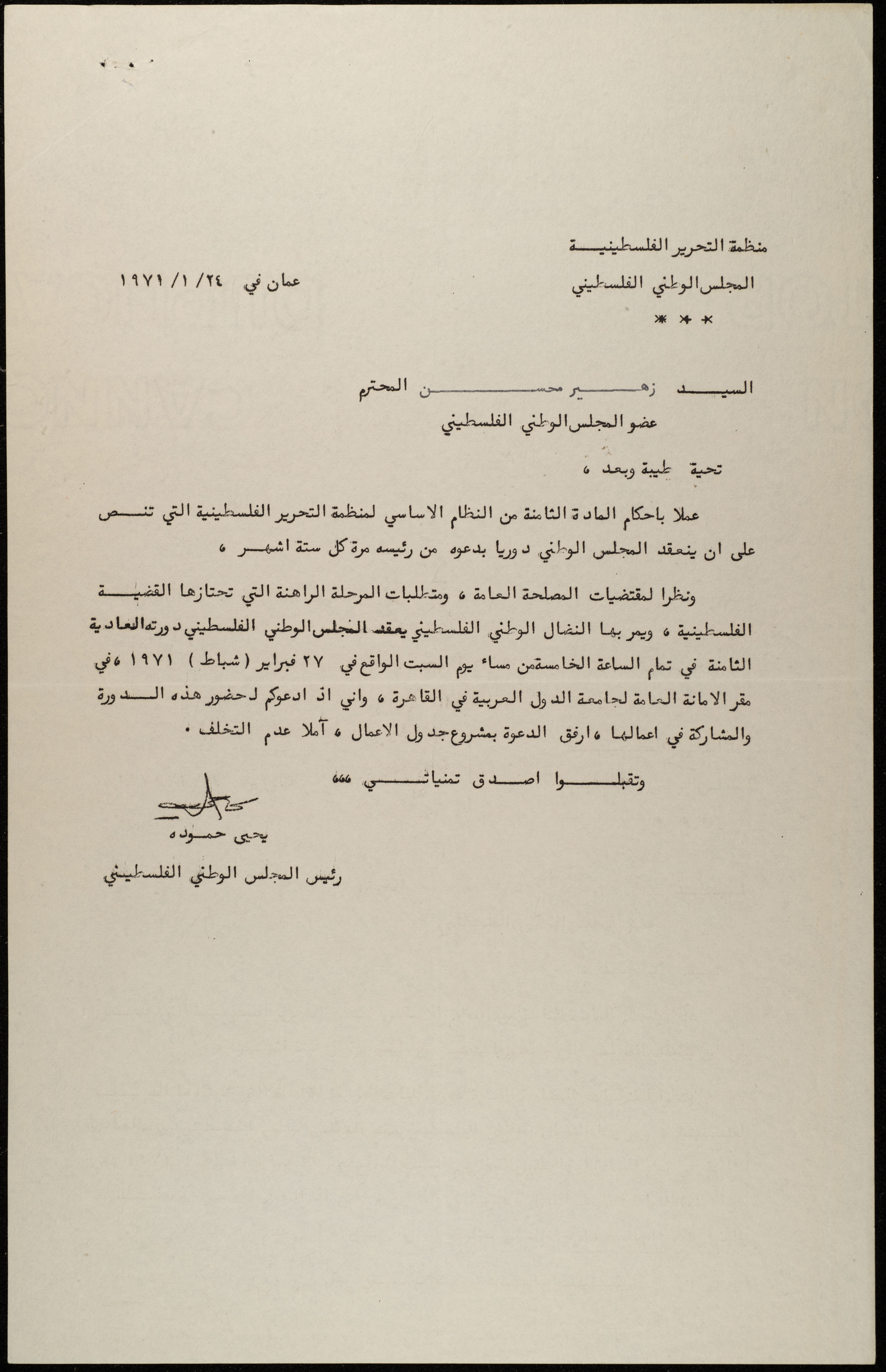 رسالة مؤرخة في 24 كانون الثاني 1971، أرسلها يحيى حمودة، رئيس المجلس الوطني الفلسطيني في منظمة التحرير، إلى زهير محسن عضو المجلس، يدعوه فيها لحضور الدورة الثامنة الدورية التي ستعقد للمجلس في القاهرة بتاريخ 27 شباط 1971.