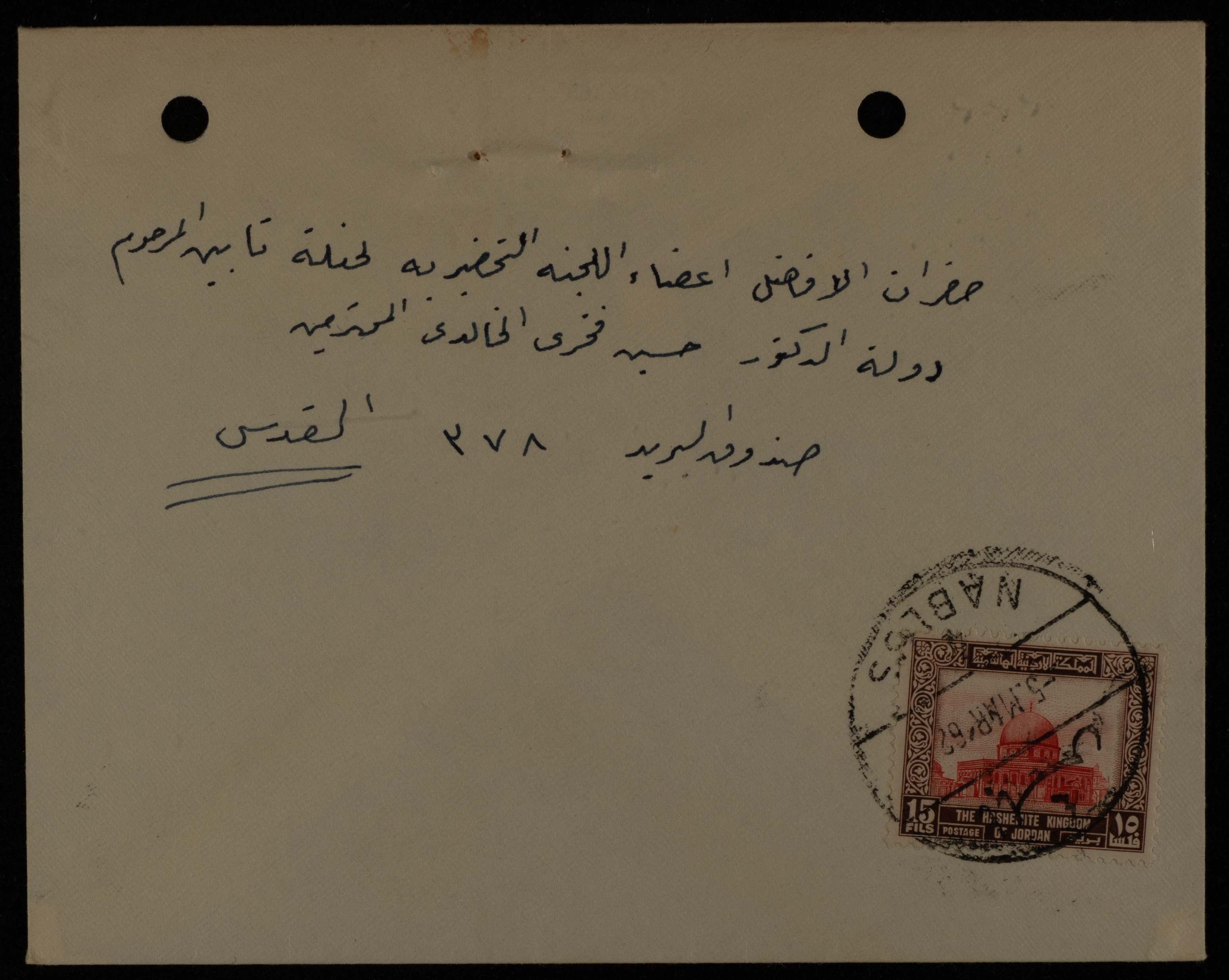 رسالة مؤرخة في 4 آذار 1962، أرسلها ماجد عبد الهادي إلى اللجنة التحضيرية لتأبين رئيس الوزراء الأردني السابق حسين فخري الخالدي في القدس، ليعلمهم بقبوله العضوية في اللجنة.