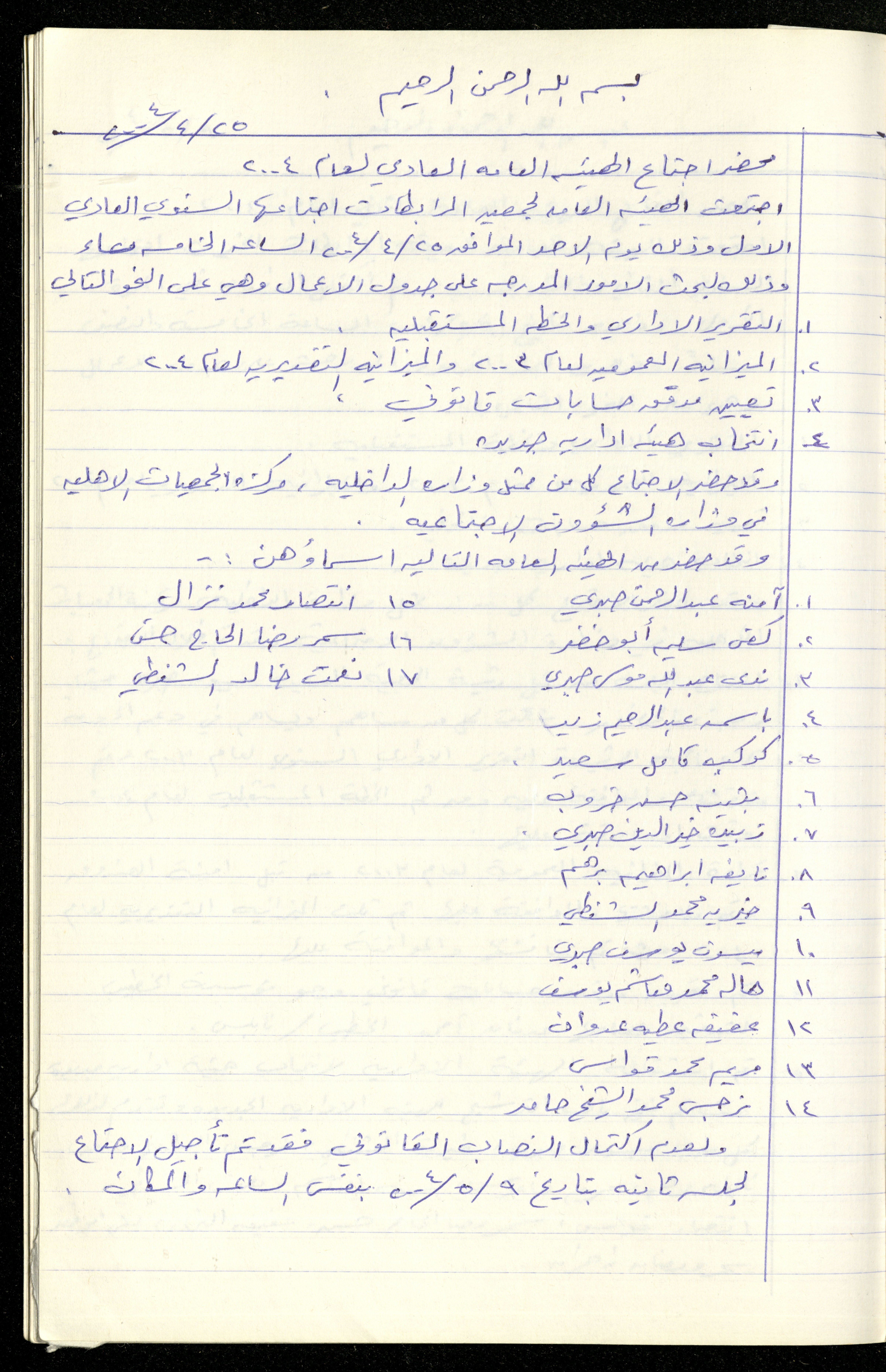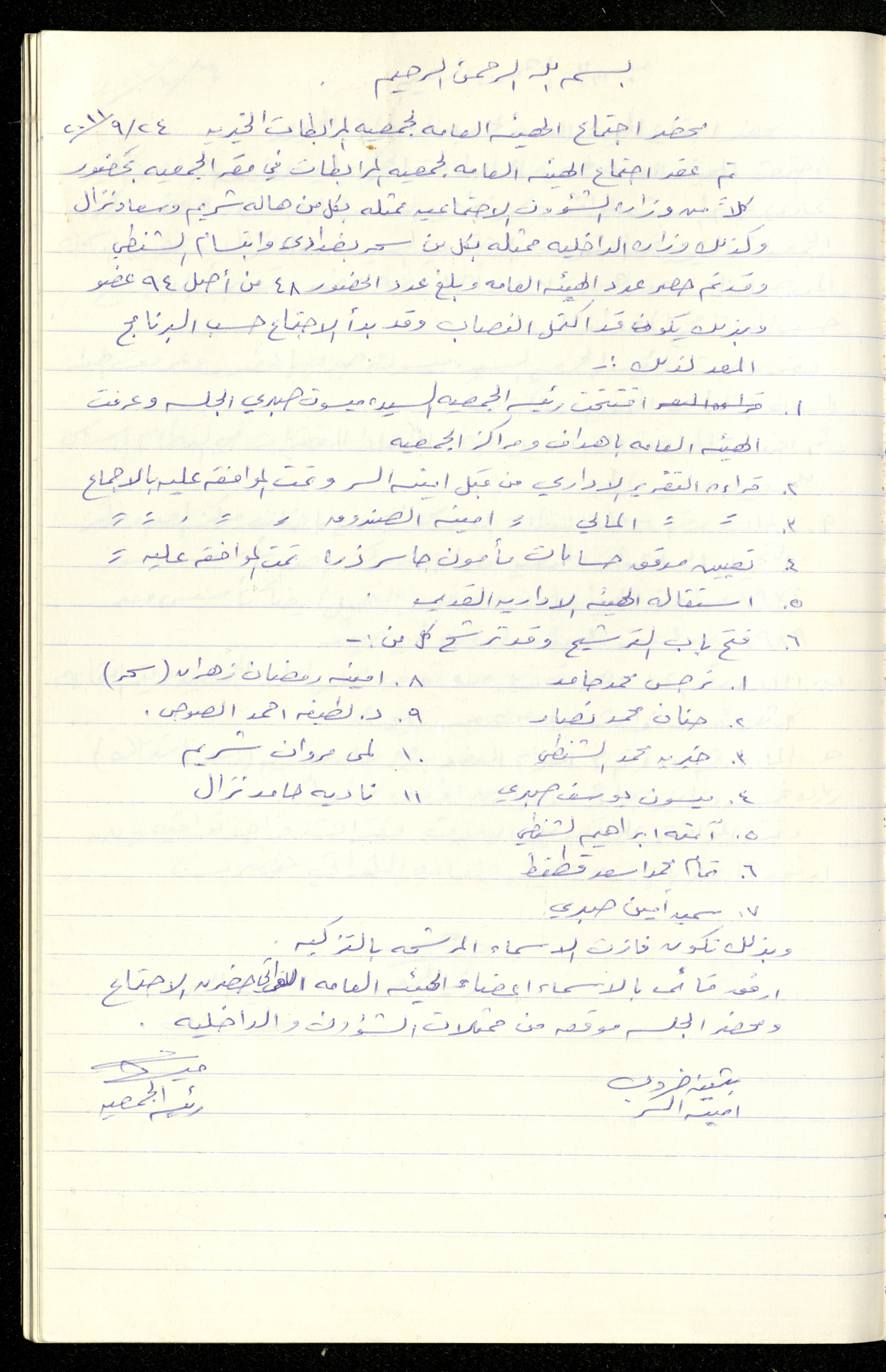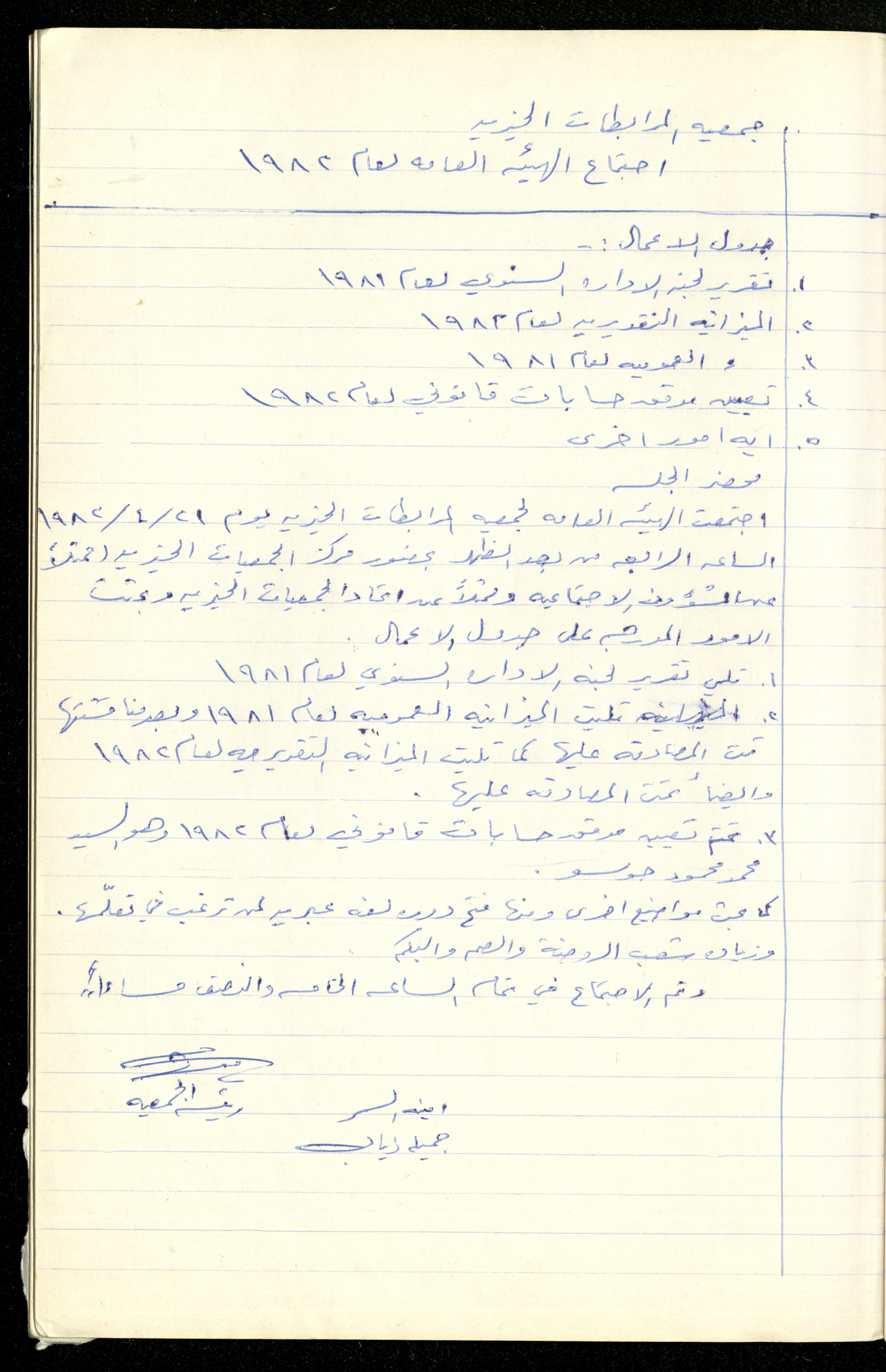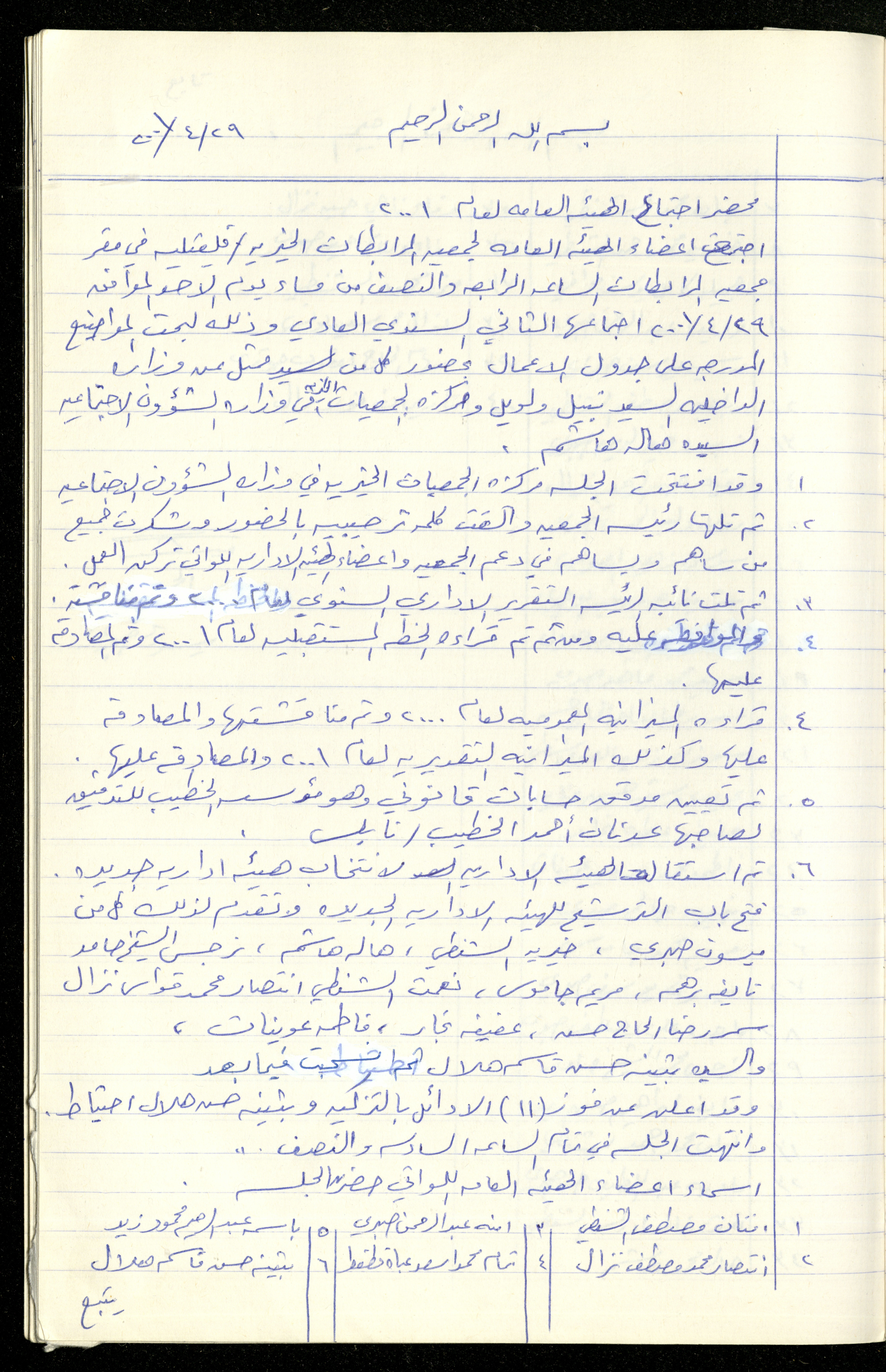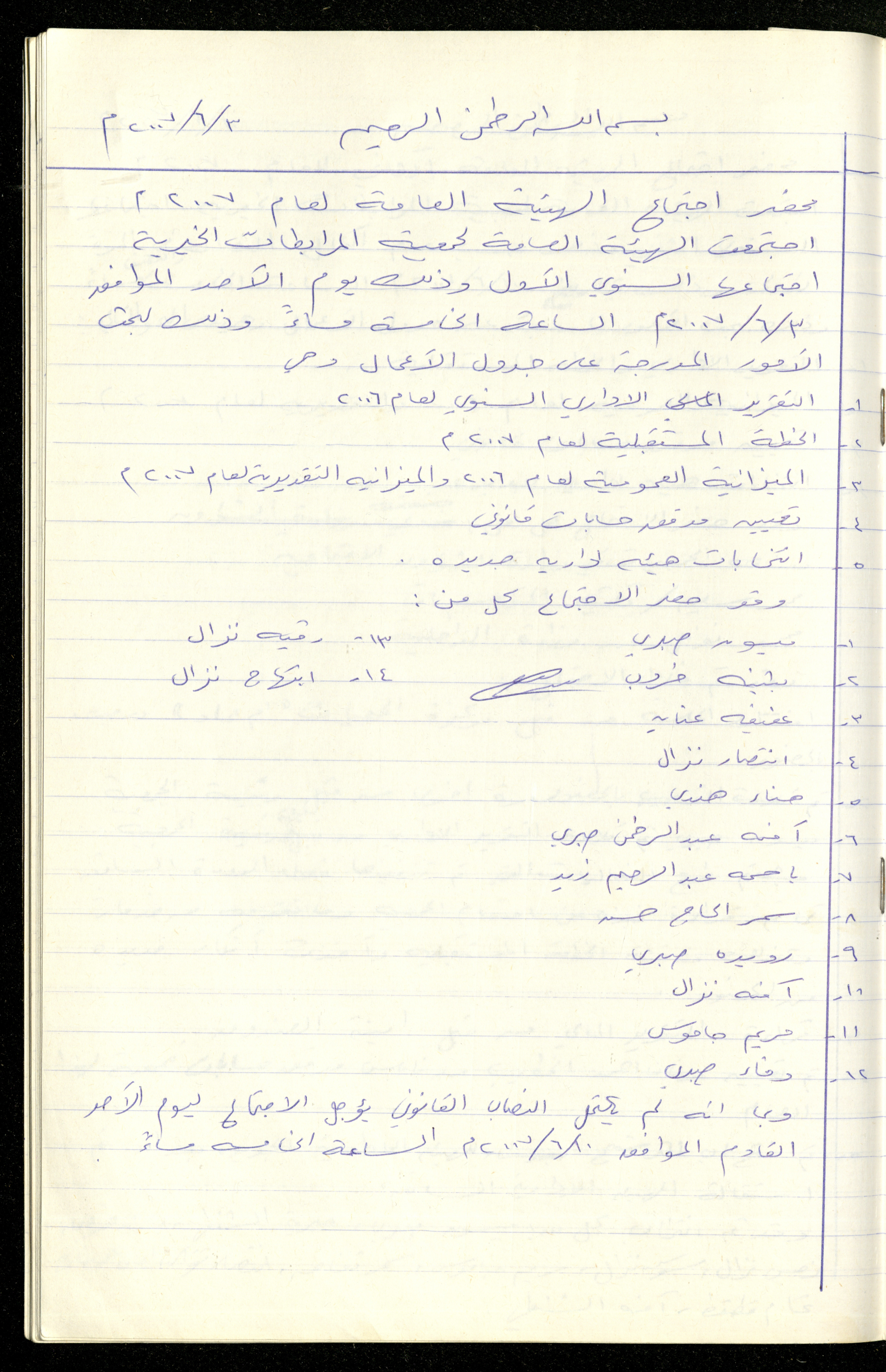 Handwritten, this 44-page document shows a record of the meetings' proceedings of the al-Murabitat Charitable Society's general assembly from 1981 to 2016. In each of them, the meeting's agenda, minutes, and the decisions resulting from it are recorded, and signed by the secretary and the president of the Society. In some meetings, the names of the members present were written down to check whether or not a quorum was complete.