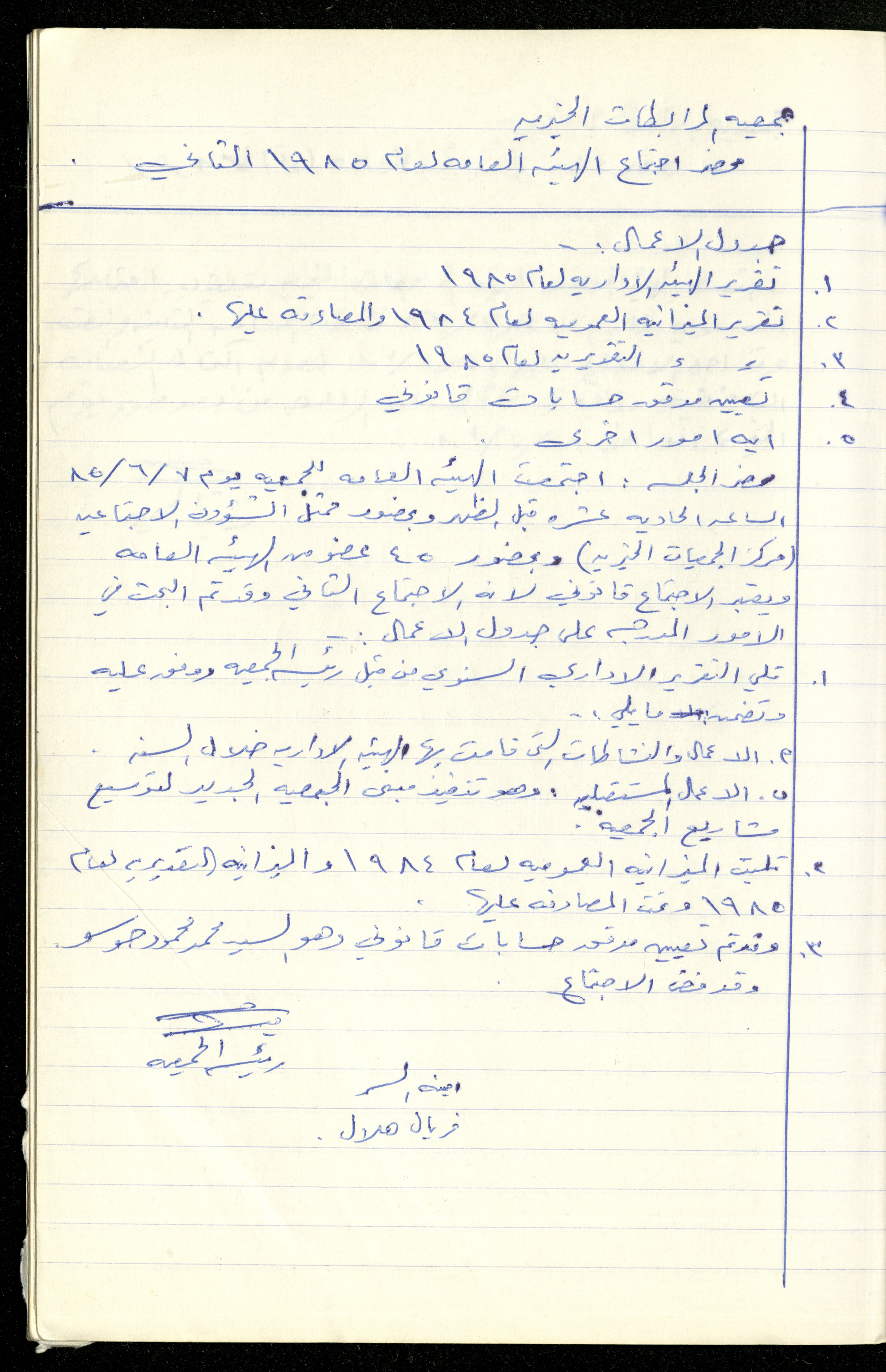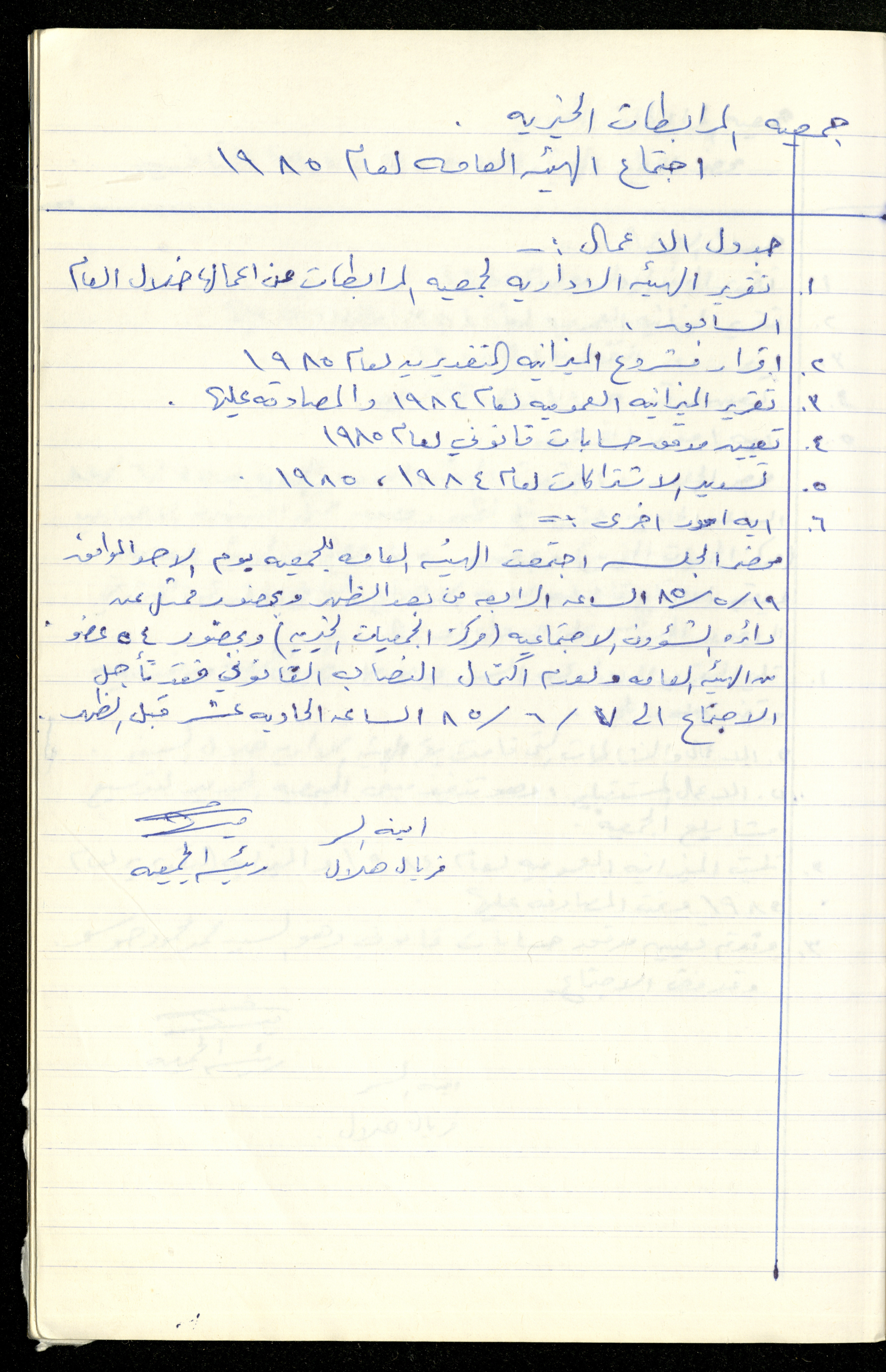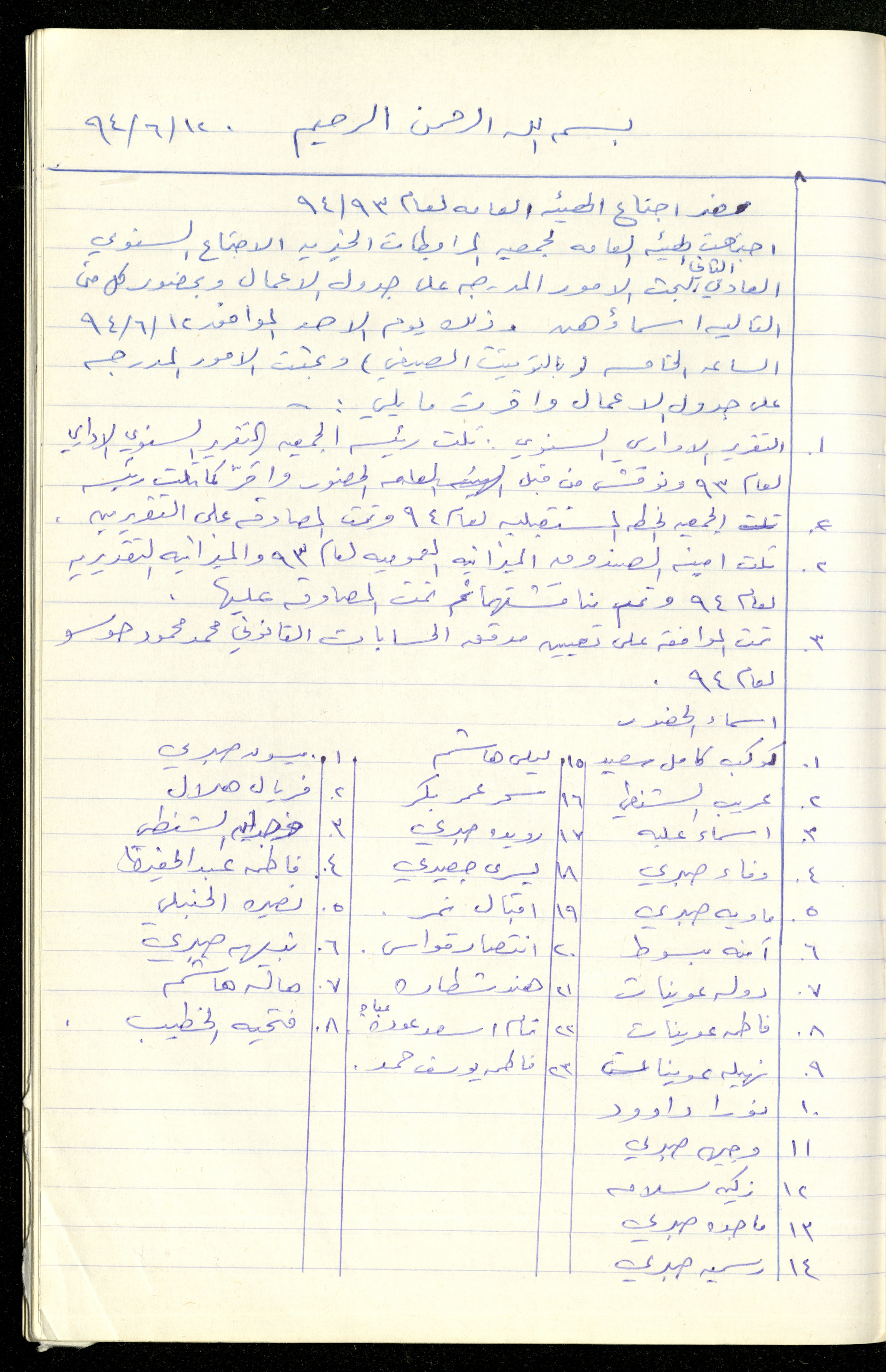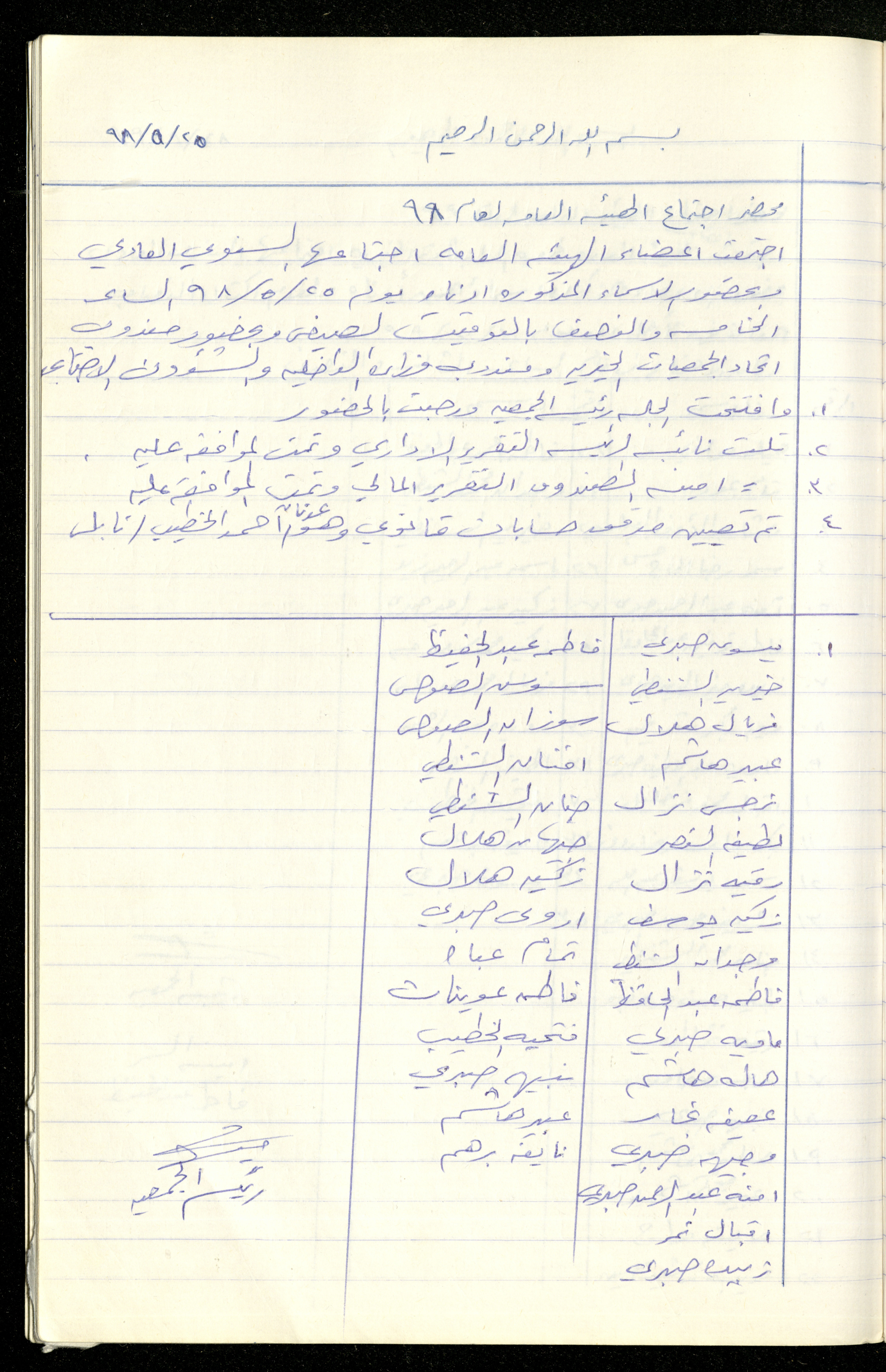 Handwritten, this 44-page document shows a record of the meetings' proceedings of the al-Murabitat Charitable Society's general assembly from 1981 to 2016. In each of them, the meeting's agenda, minutes, and the decisions resulting from it are recorded, and signed by the secretary and the president of the Society. In some meetings, the names of the members present were written down to check whether or not a quorum was complete.