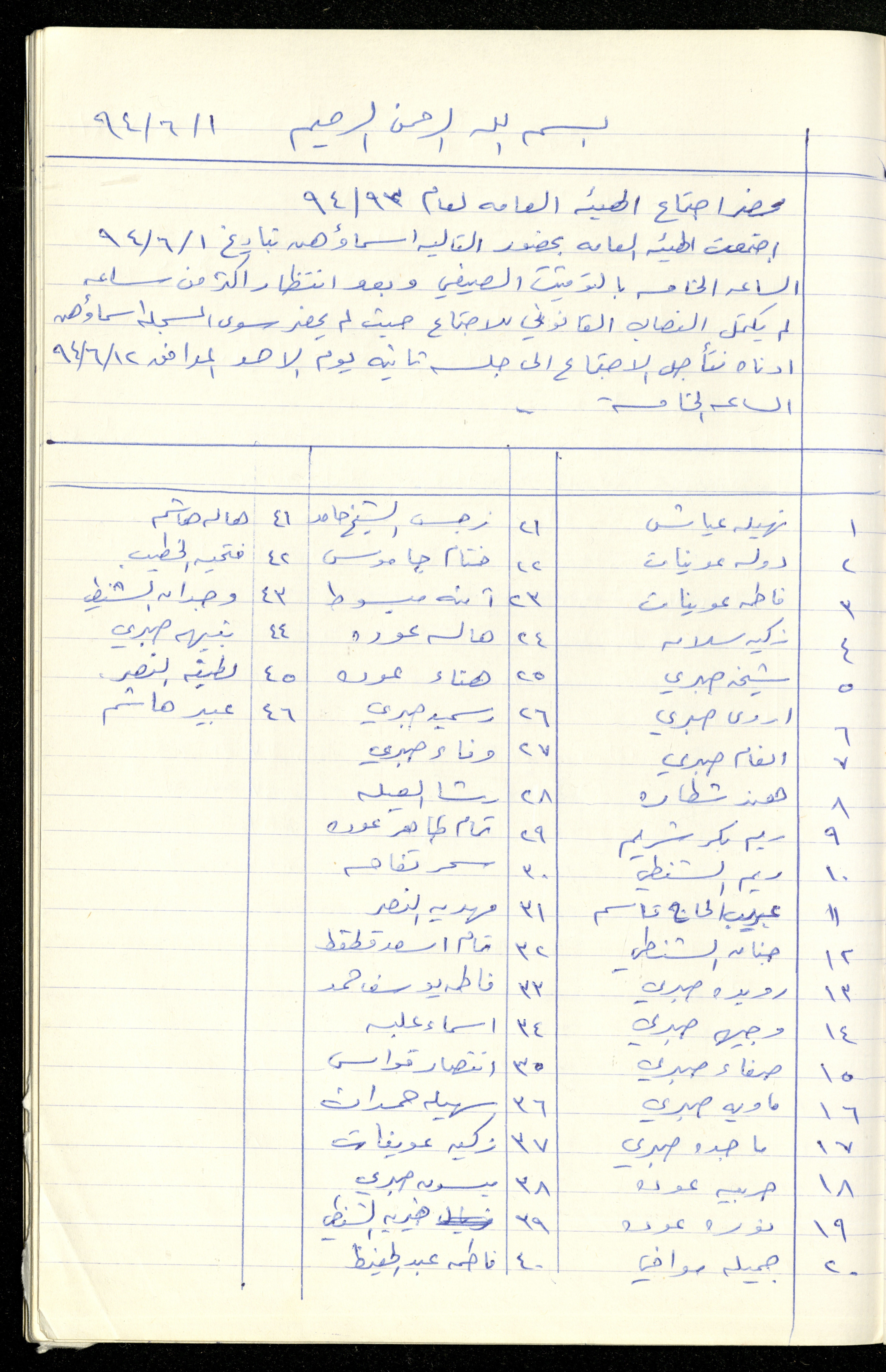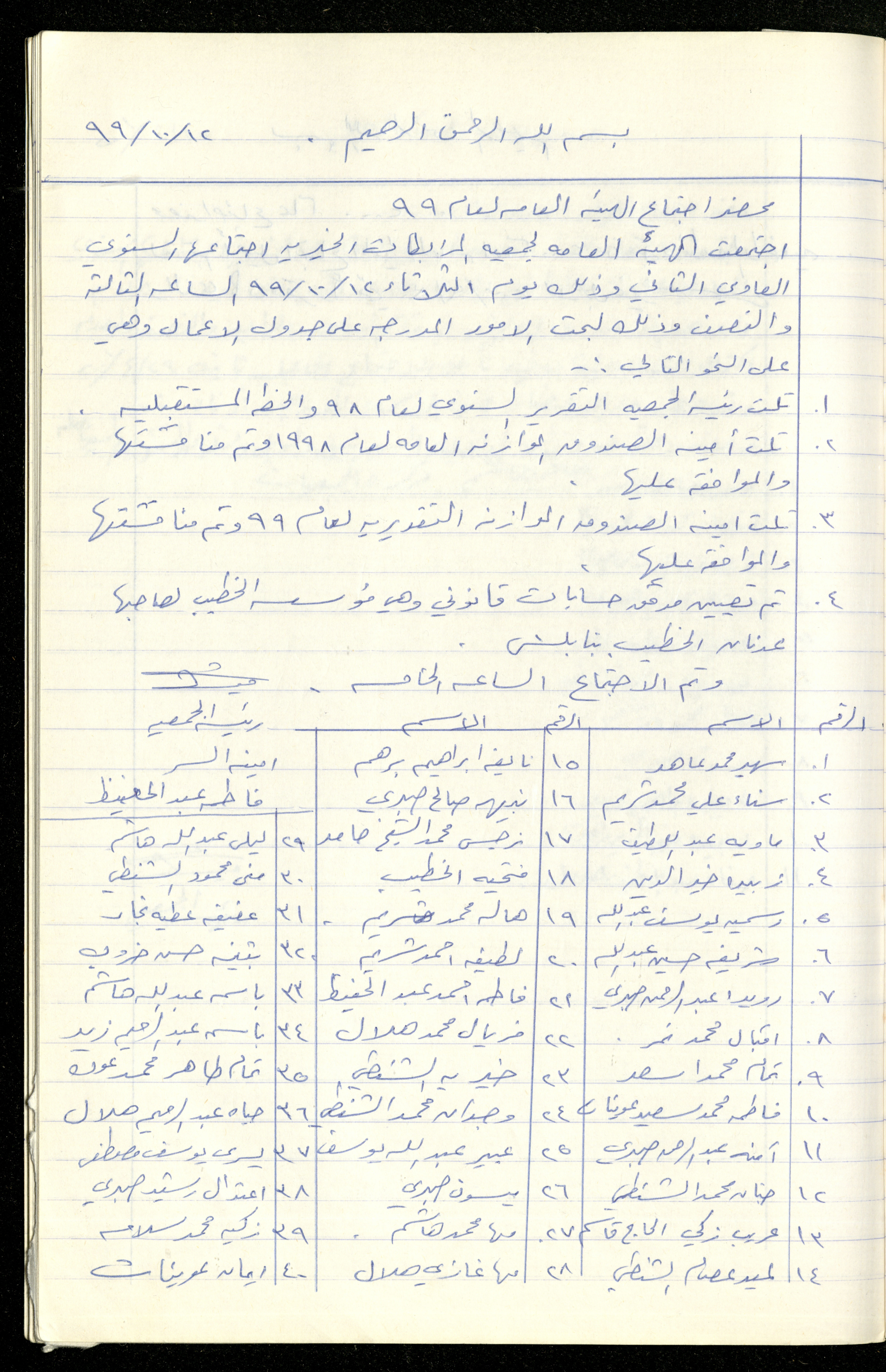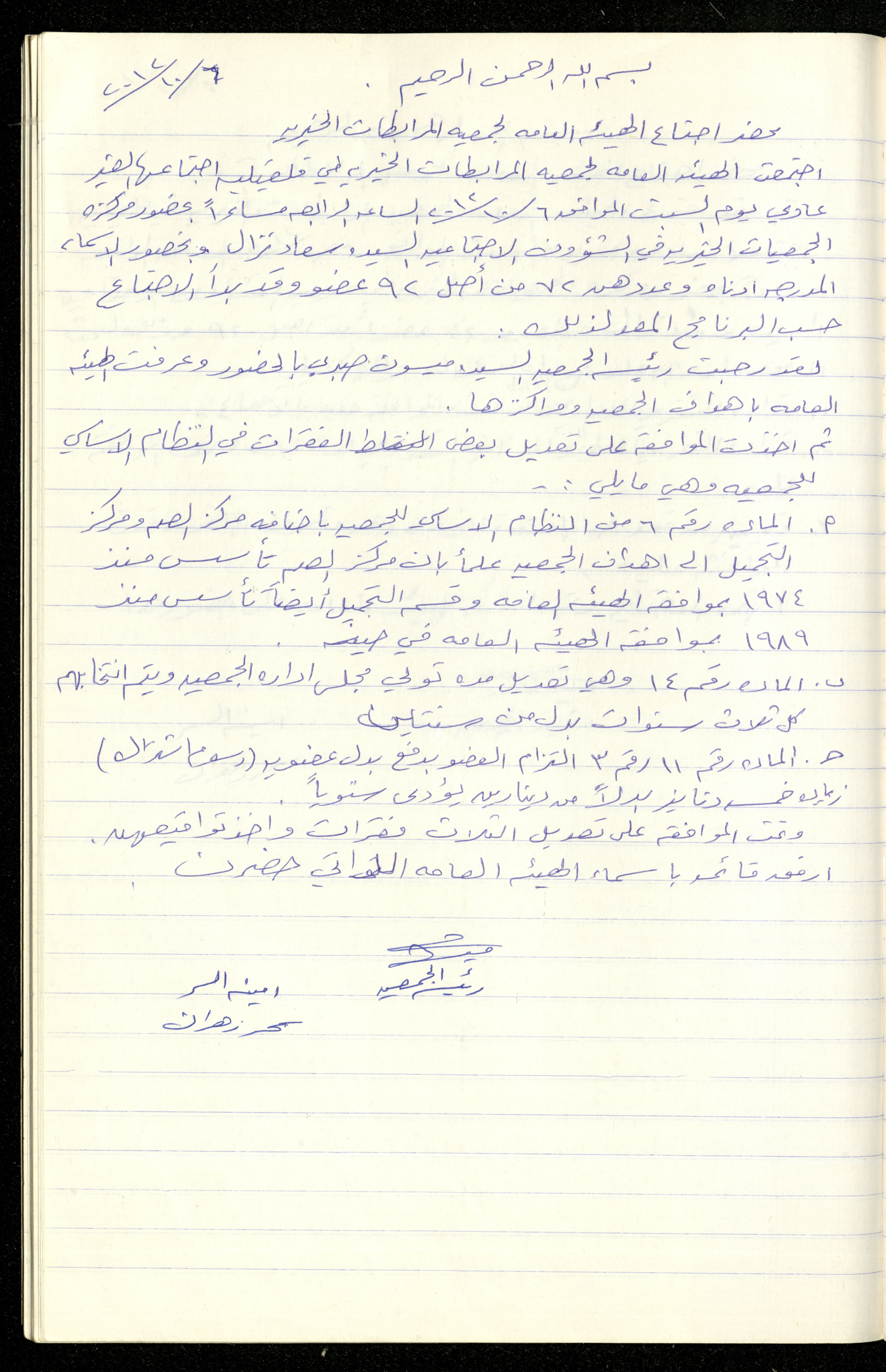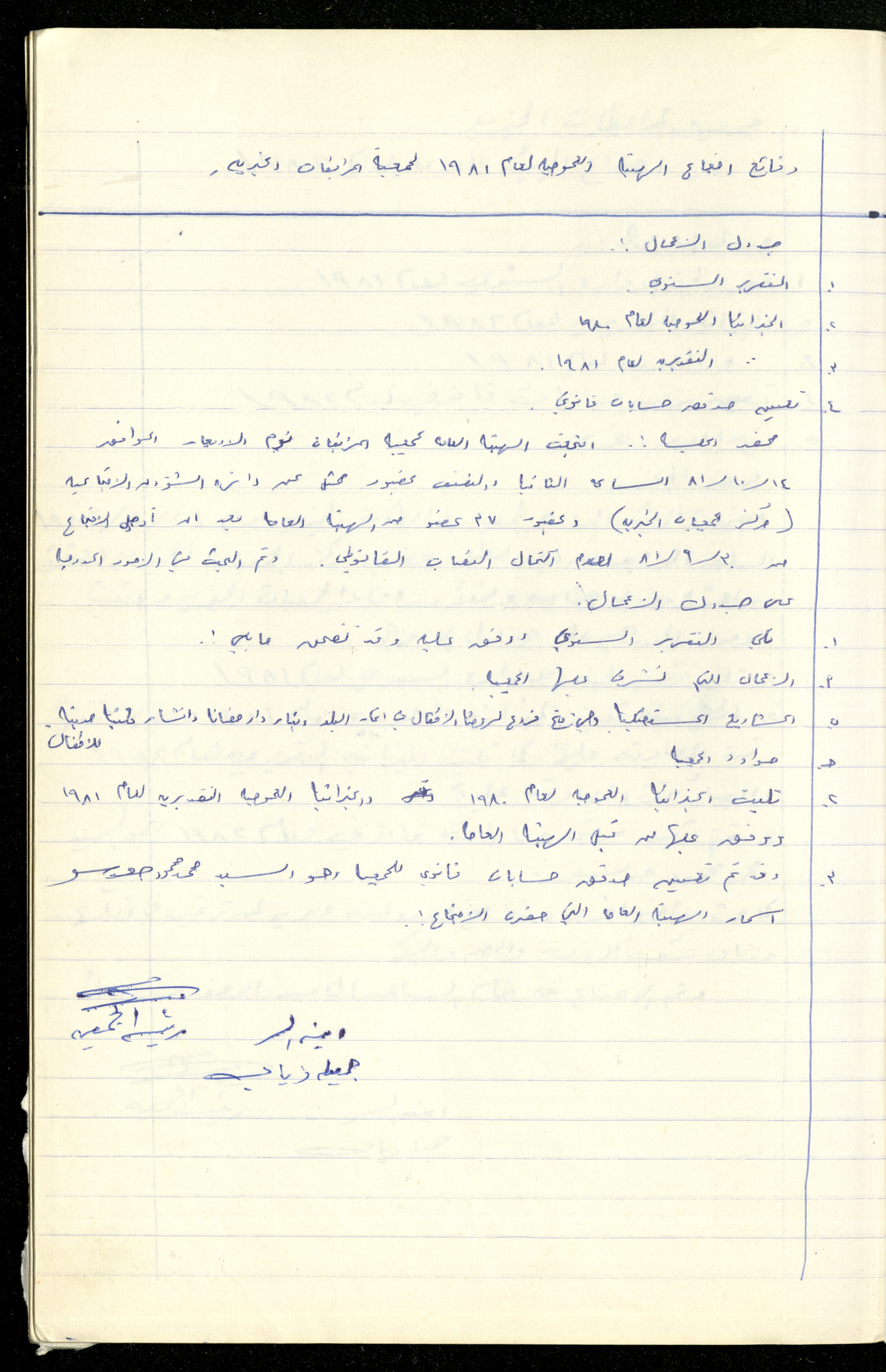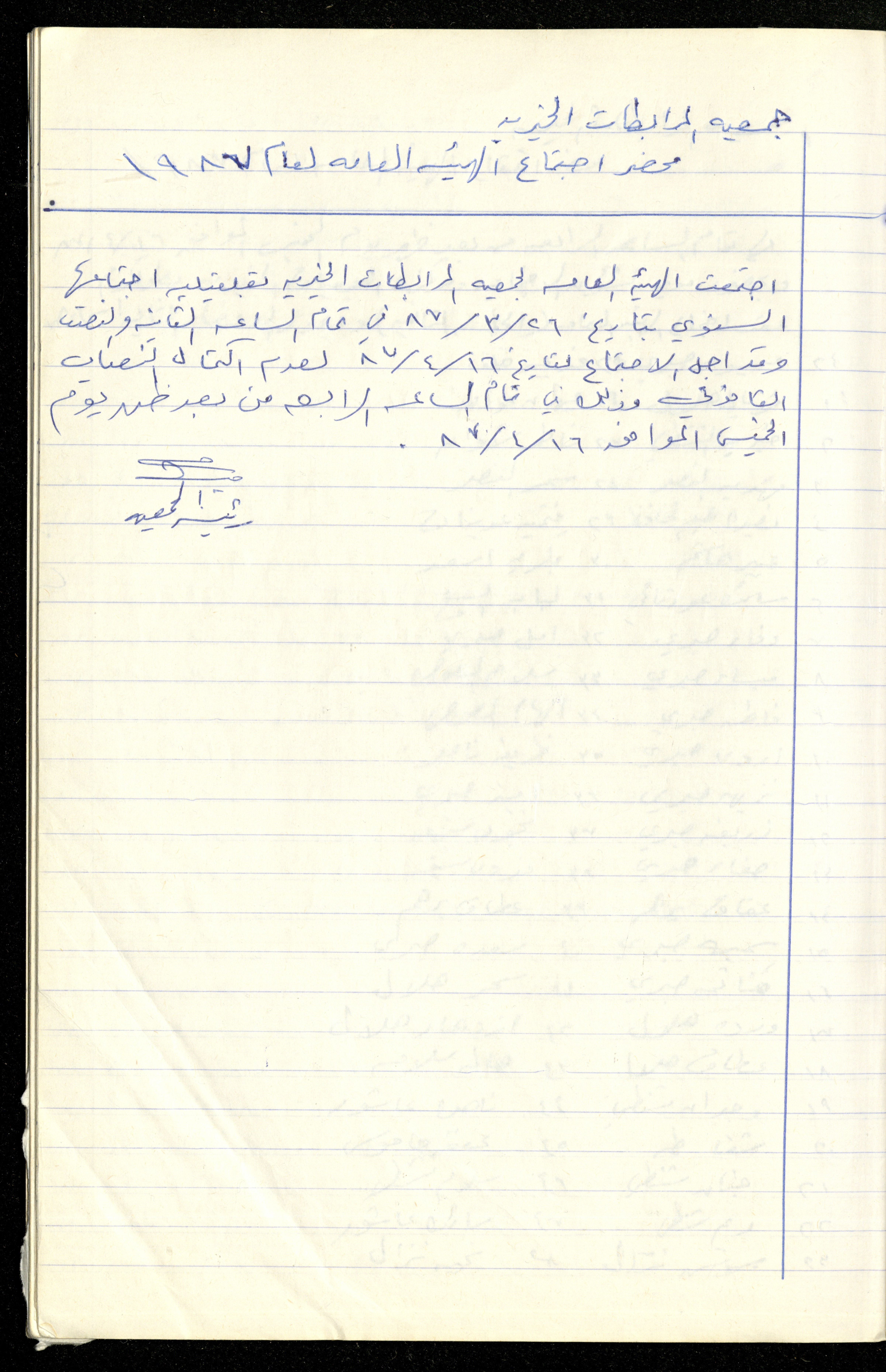 Handwritten, this 44-page document shows a record of the meetings' proceedings of the al-Murabitat Charitable Society's general assembly from 1981 to 2016. In each of them, the meeting's agenda, minutes, and the decisions resulting from it are recorded, and signed by the secretary and the president of the Society. In some meetings, the names of the members present were written down to check whether or not a quorum was complete.