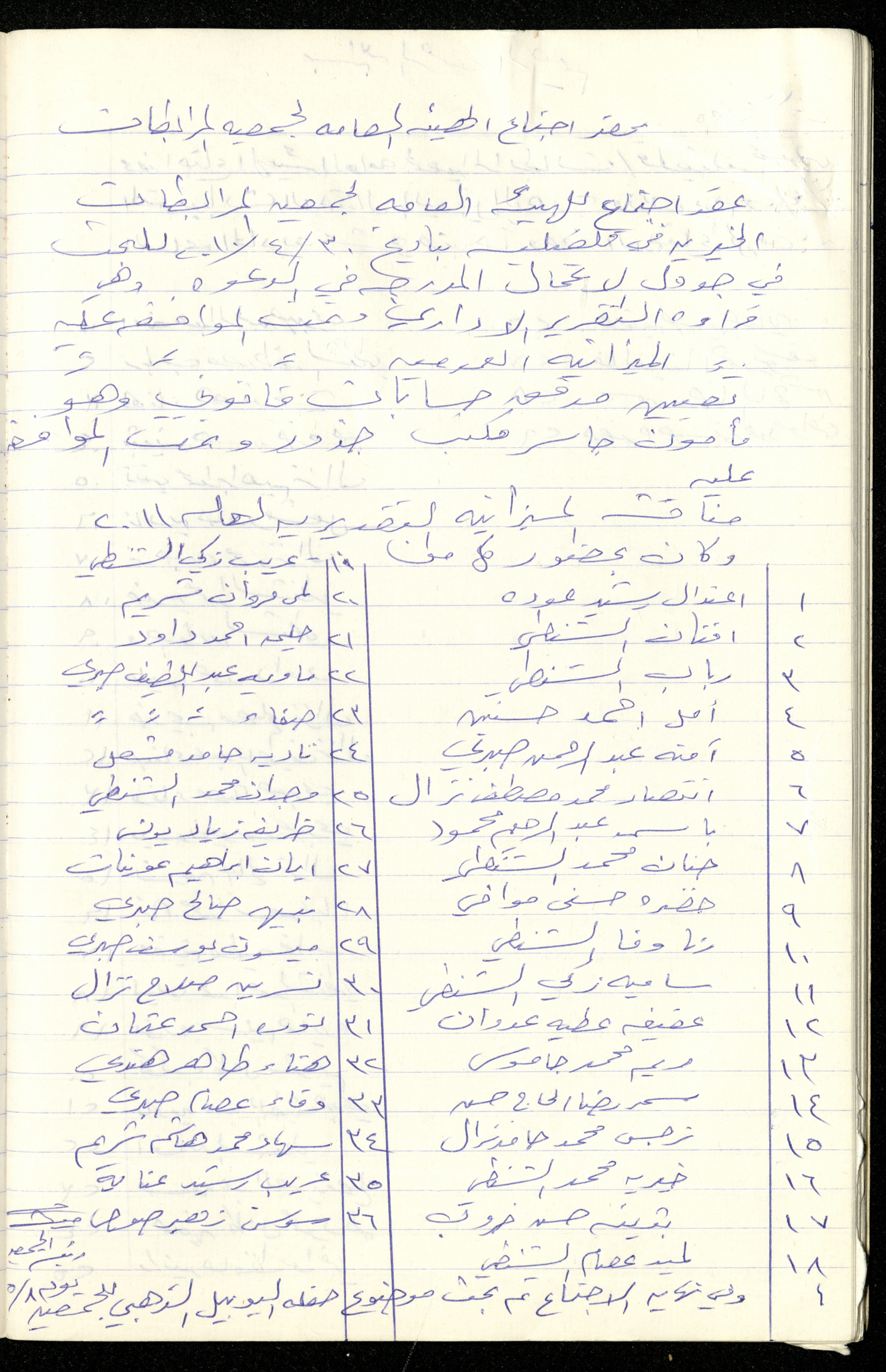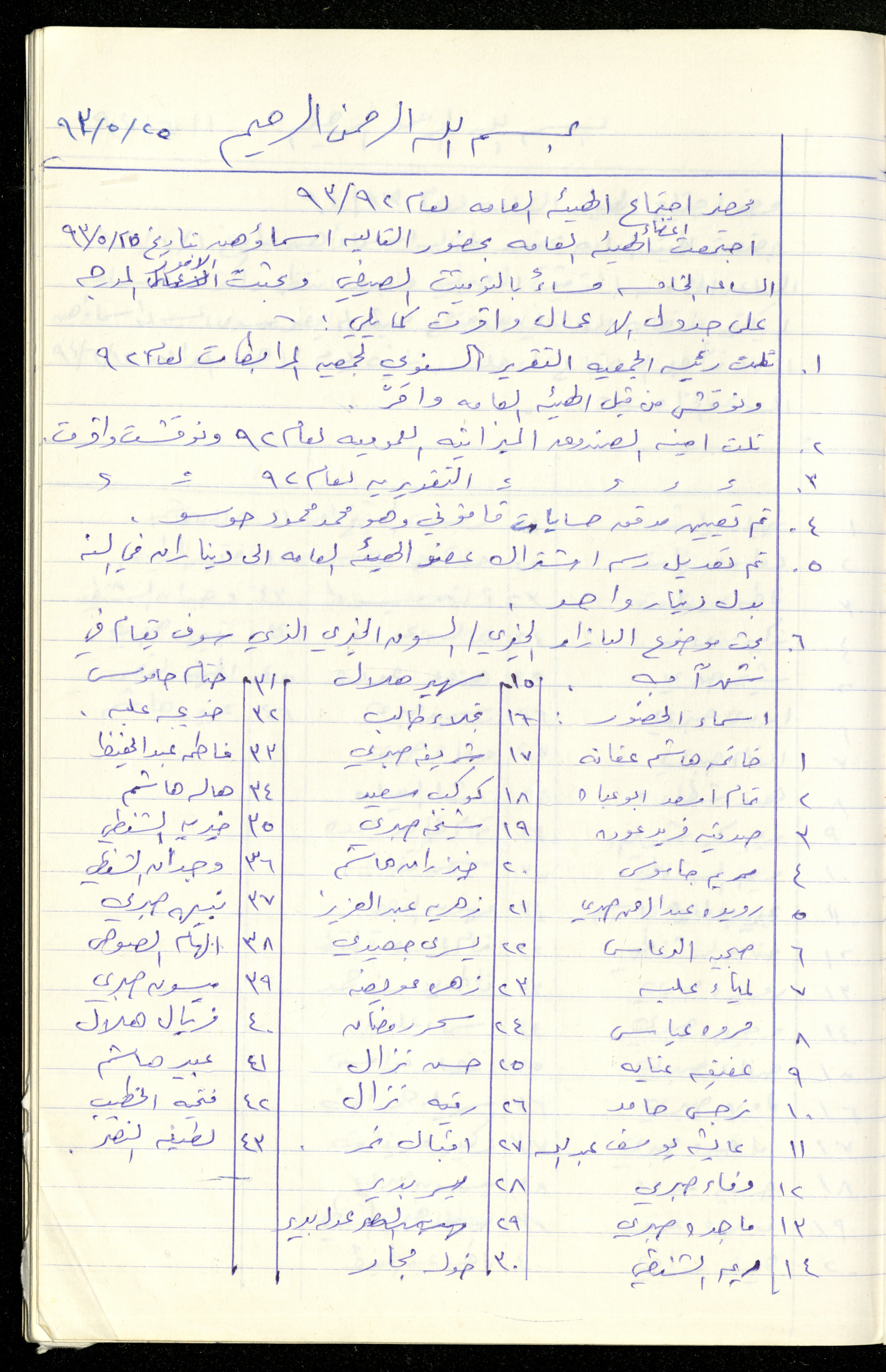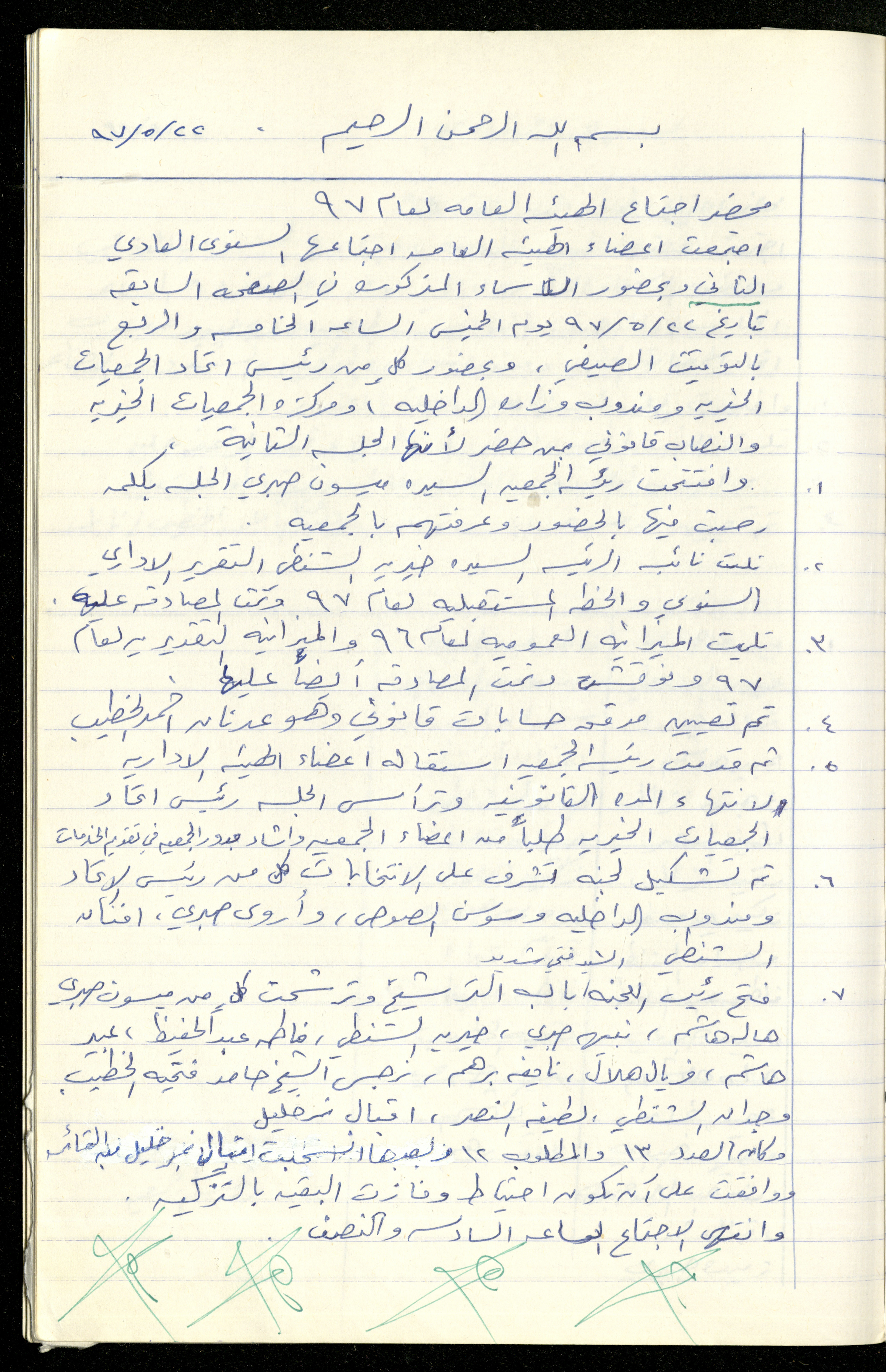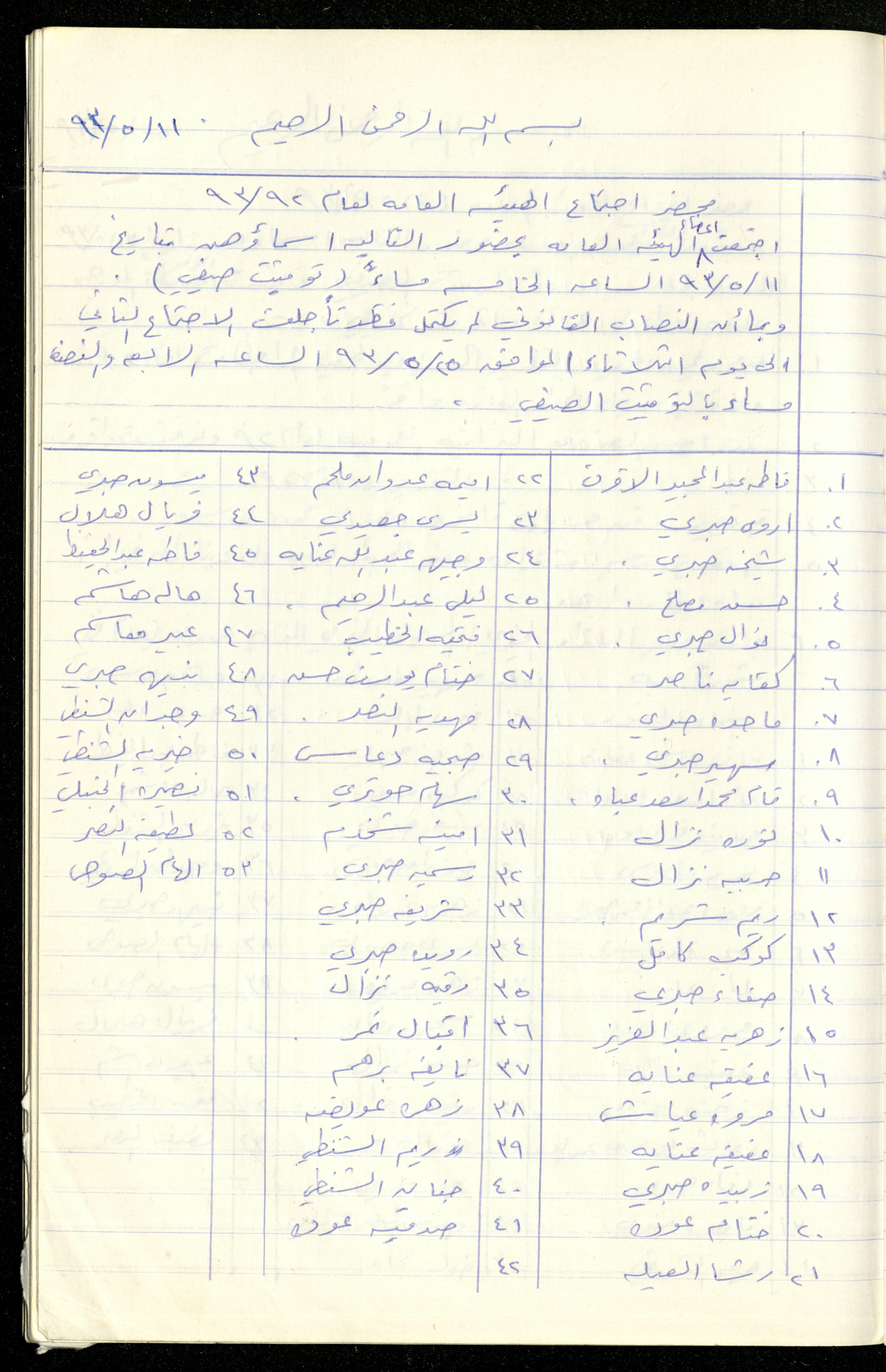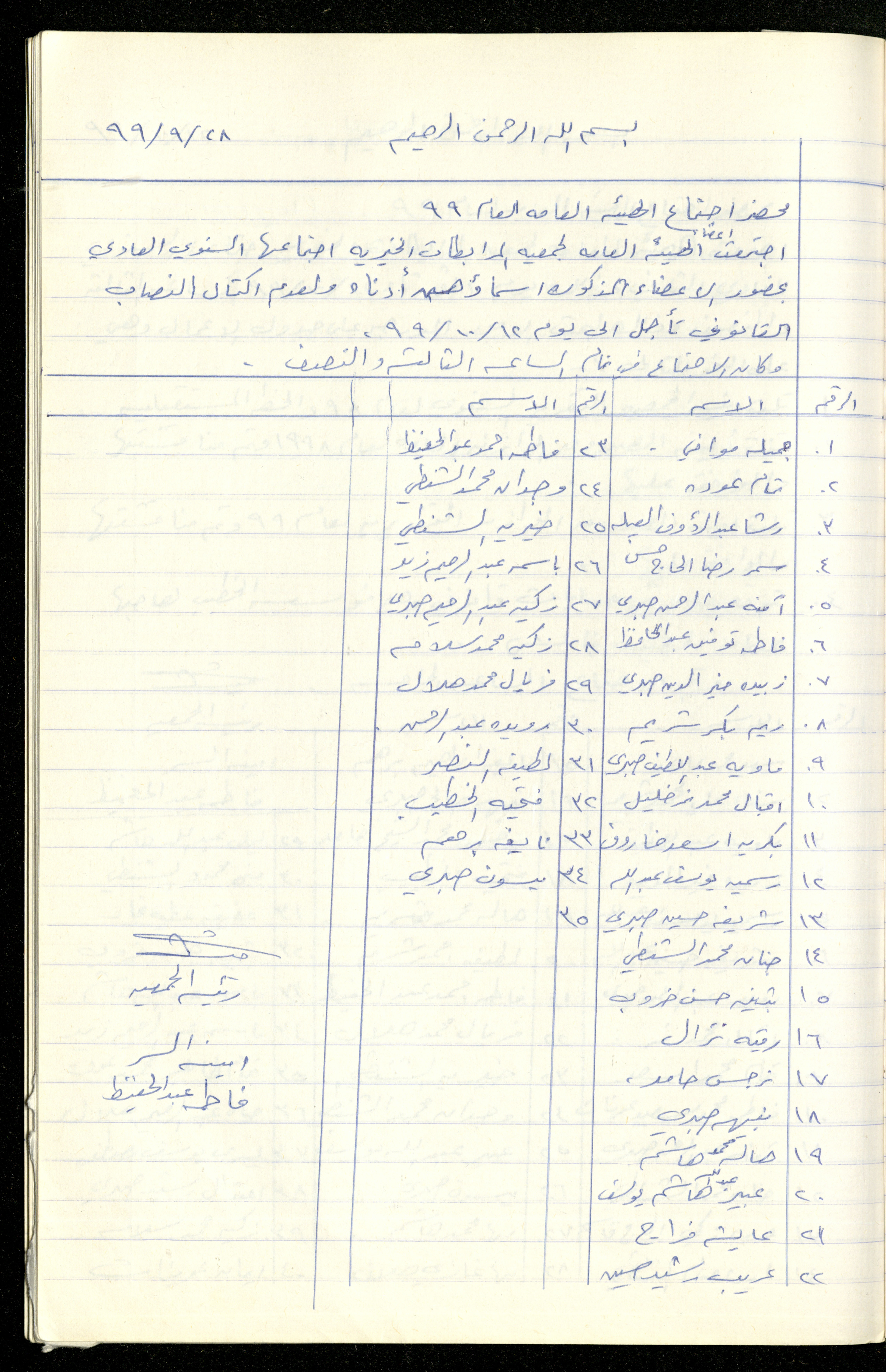 Handwritten, this 44-page document shows a record of the meetings' proceedings of the al-Murabitat Charitable Society's general assembly from 1981 to 2016. In each of them, the meeting's agenda, minutes, and the decisions resulting from it are recorded, and signed by the secretary and the president of the Society. In some meetings, the names of the members present were written down to check whether or not a quorum was complete.