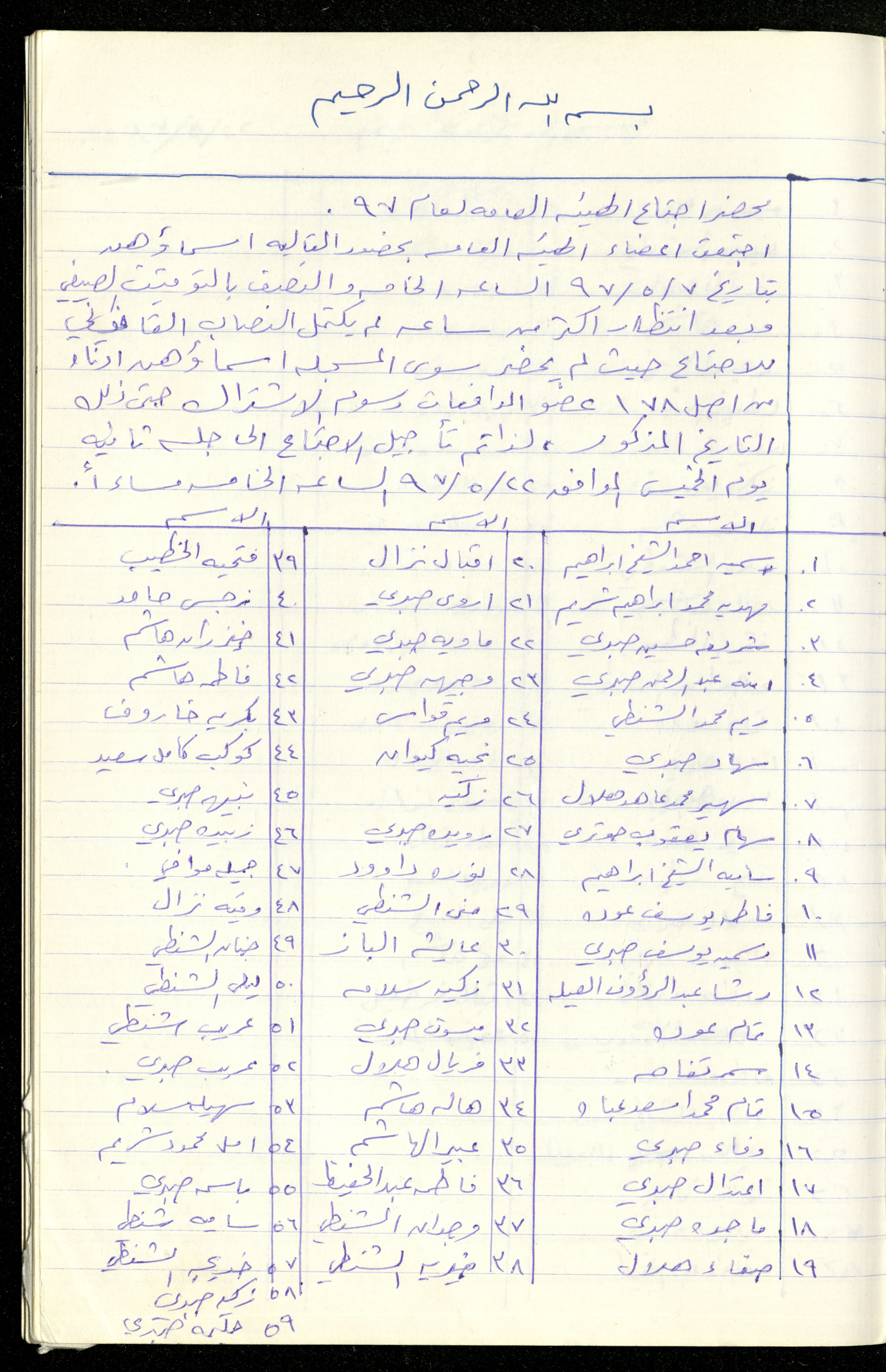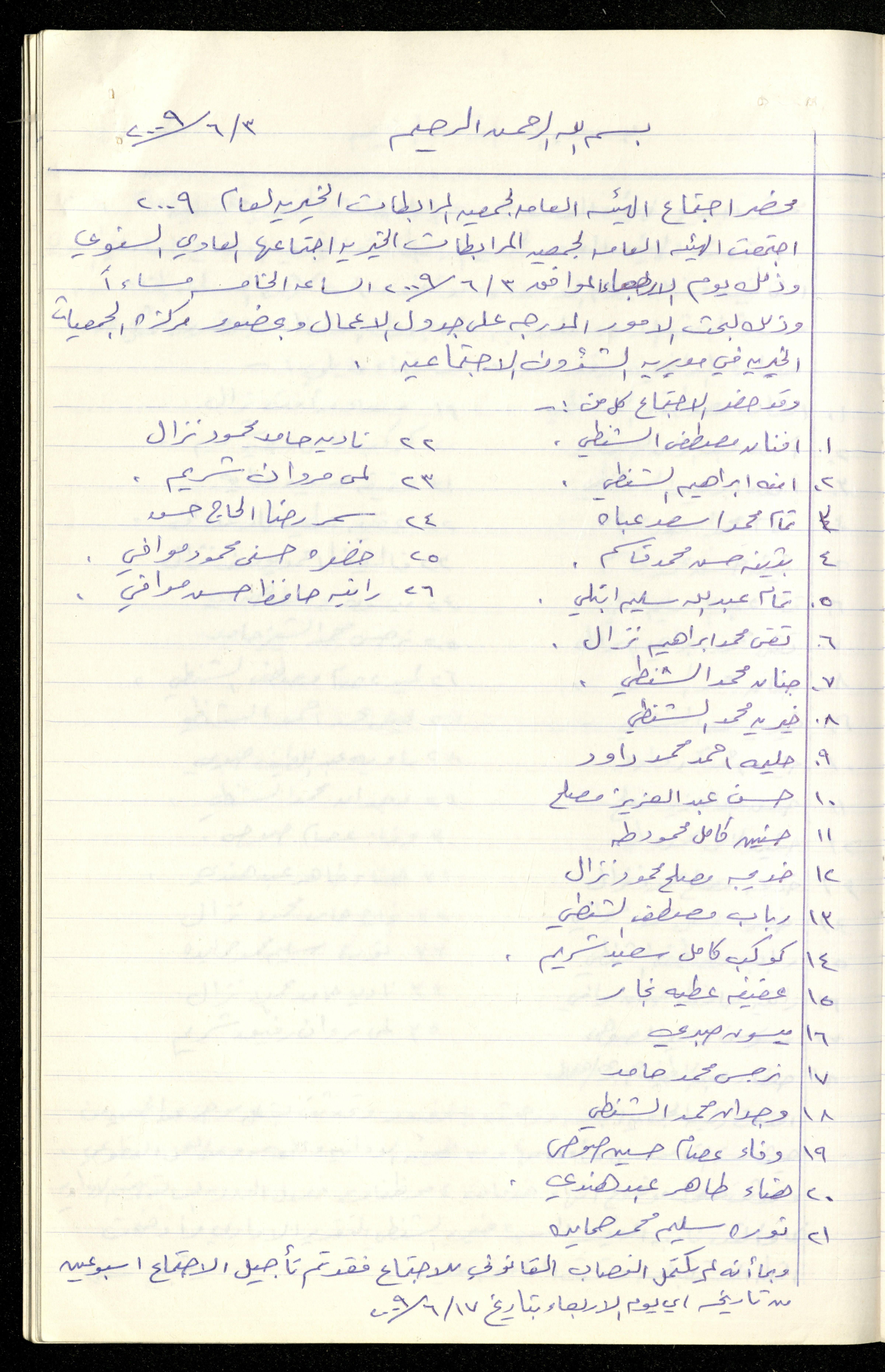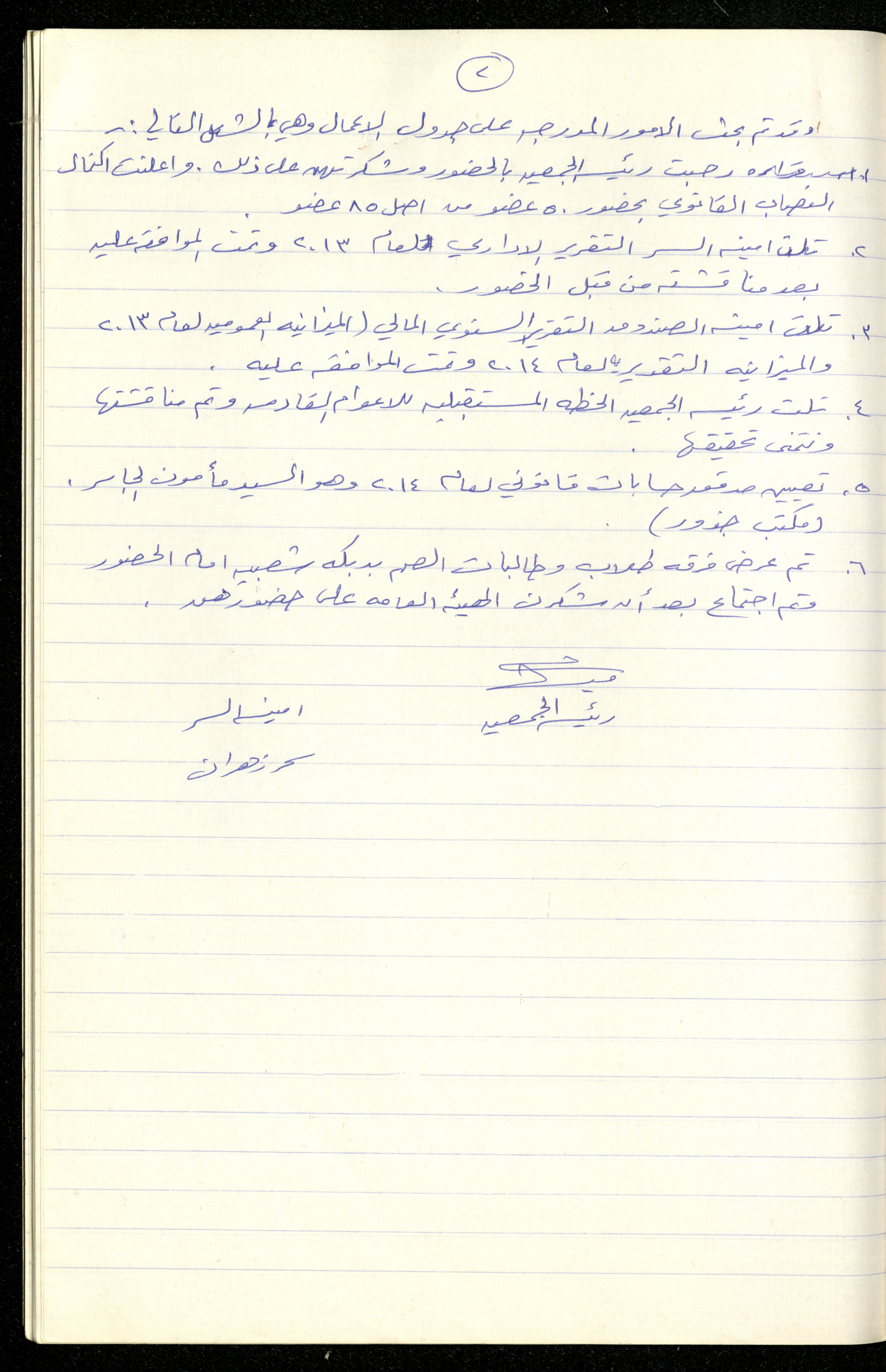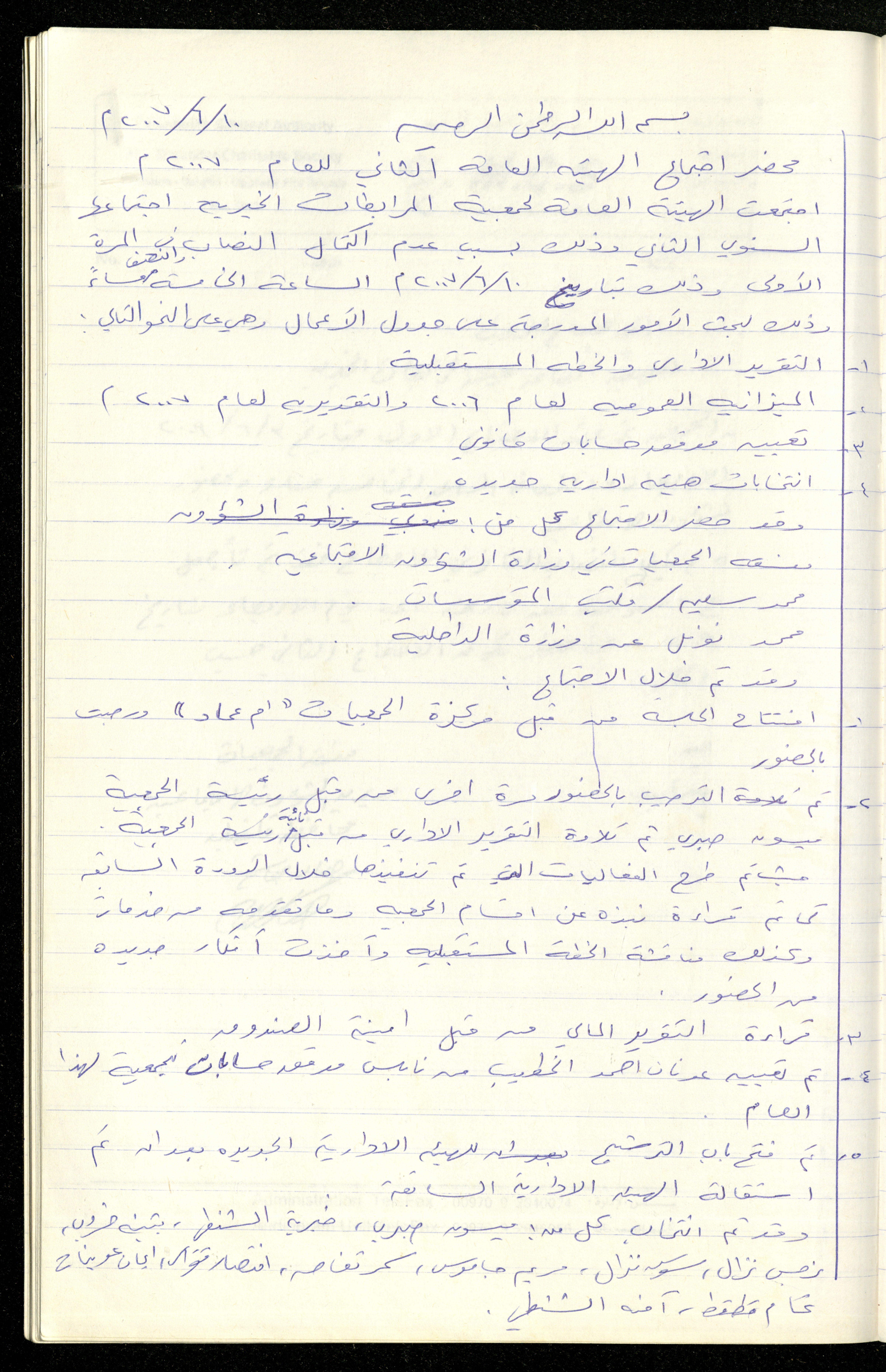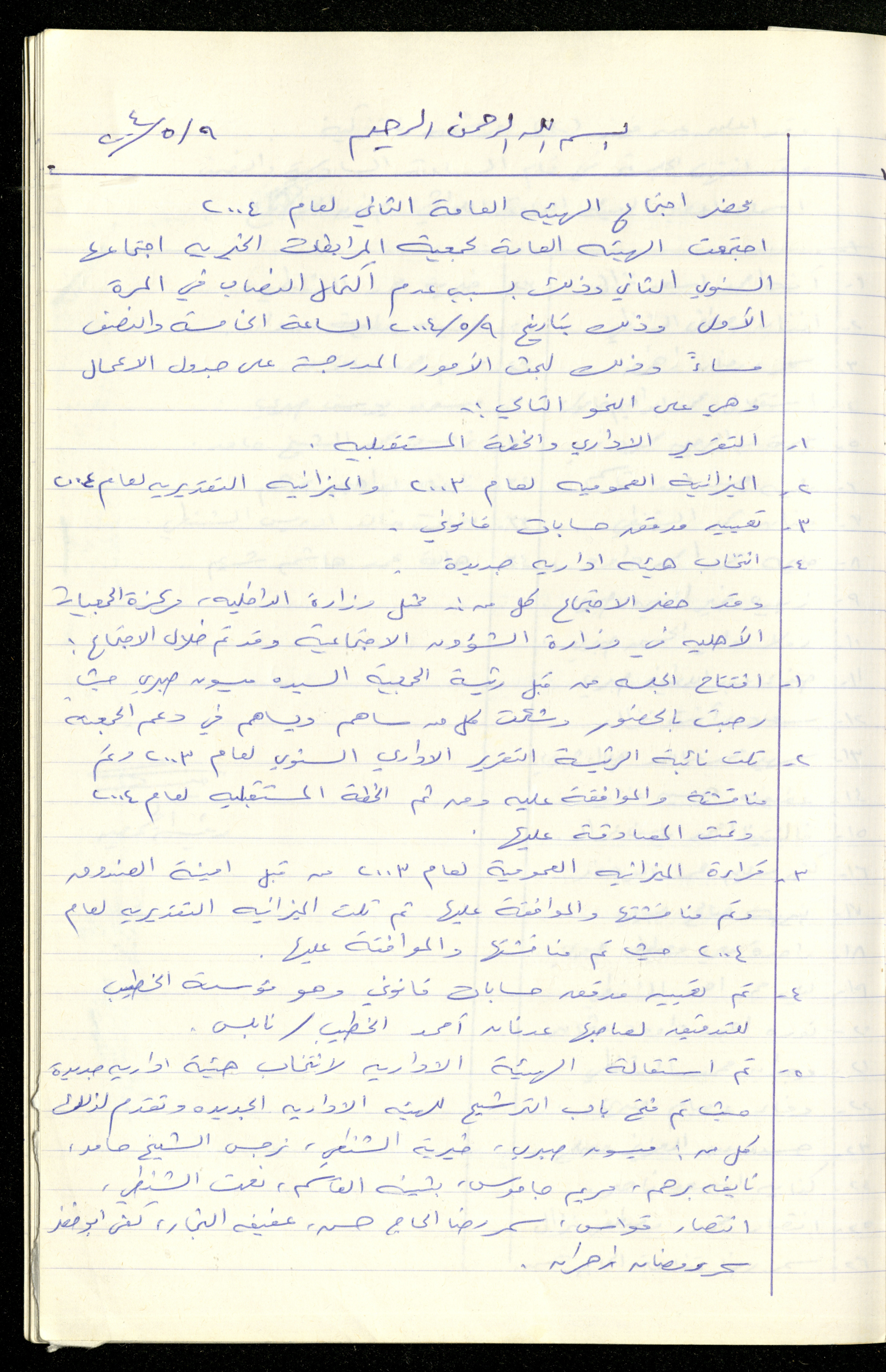 Handwritten, this 44-page document shows a record of the meetings' proceedings of the al-Murabitat Charitable Society's general assembly from 1981 to 2016. In each of them, the meeting's agenda, minutes, and the decisions resulting from it are recorded, and signed by the secretary and the president of the Society. In some meetings, the names of the members present were written down to check whether or not a quorum was complete.