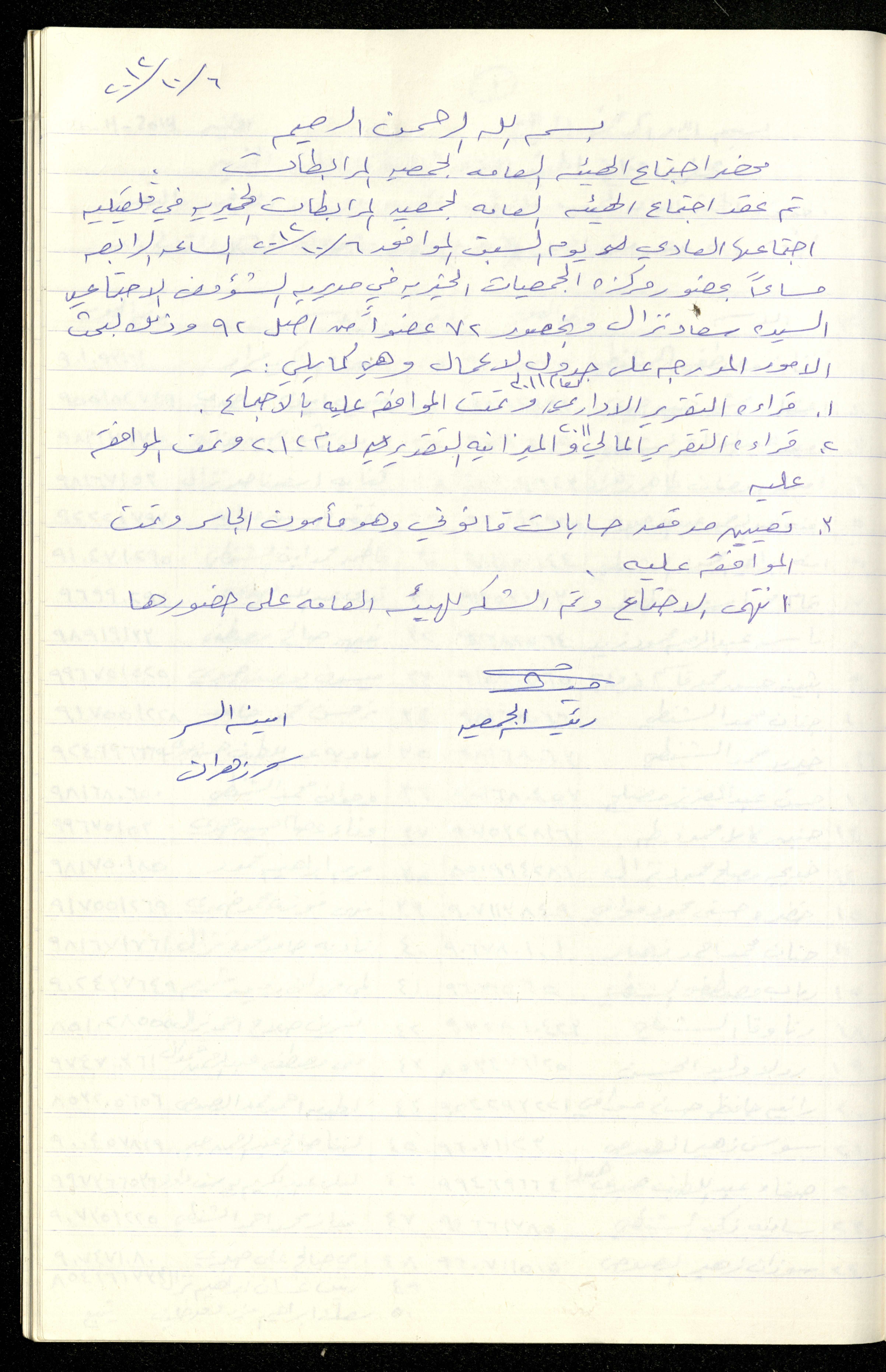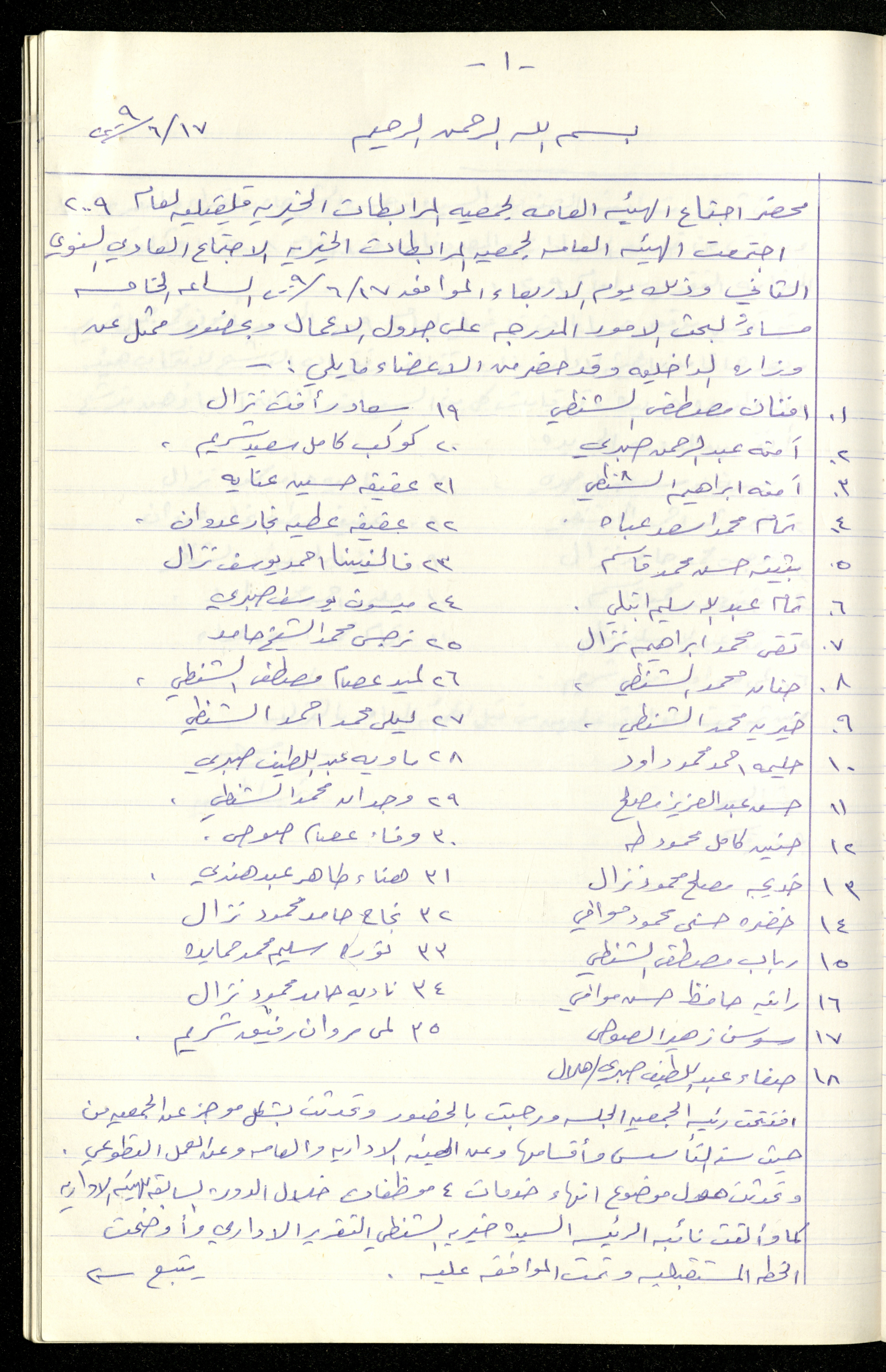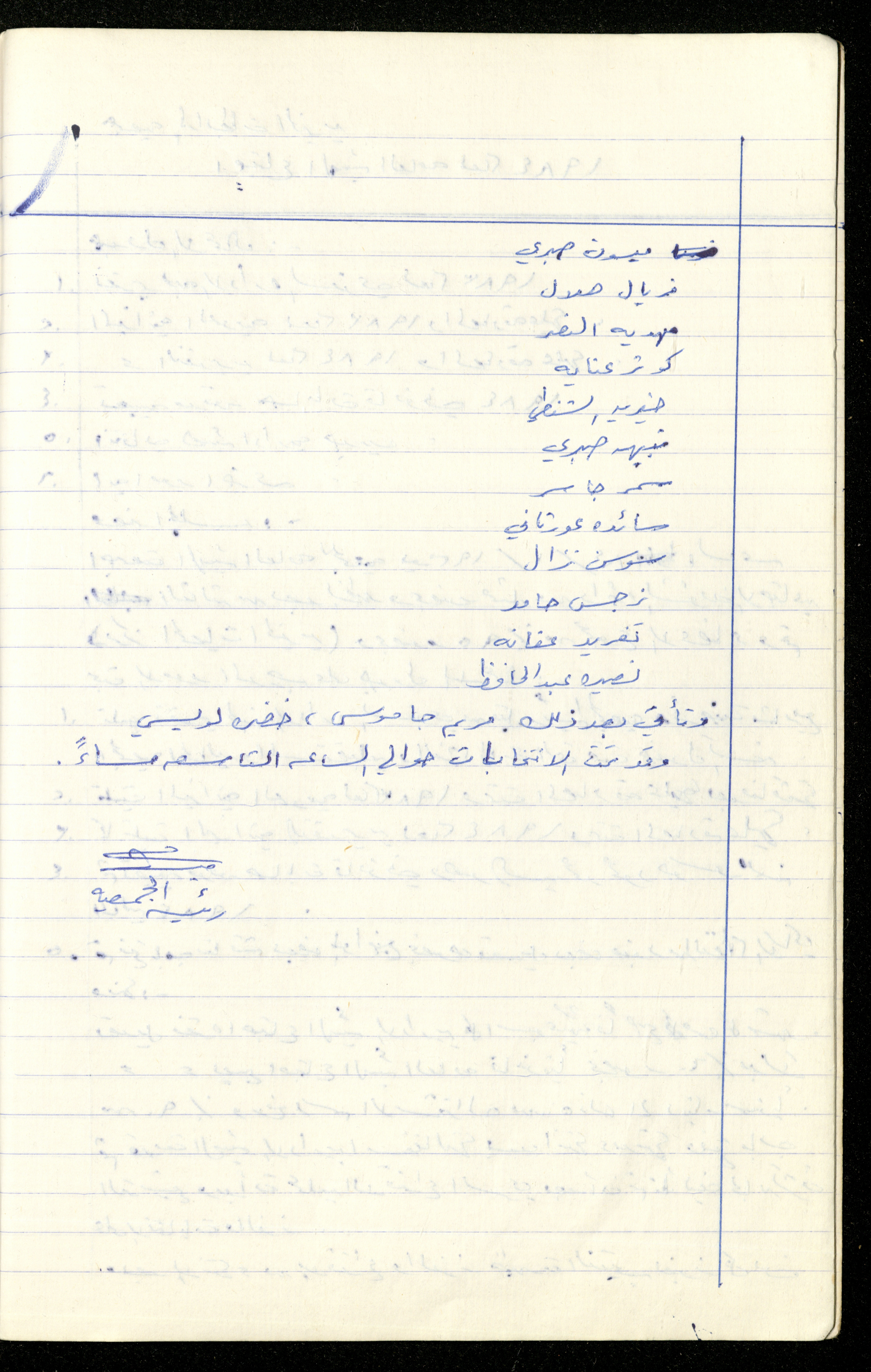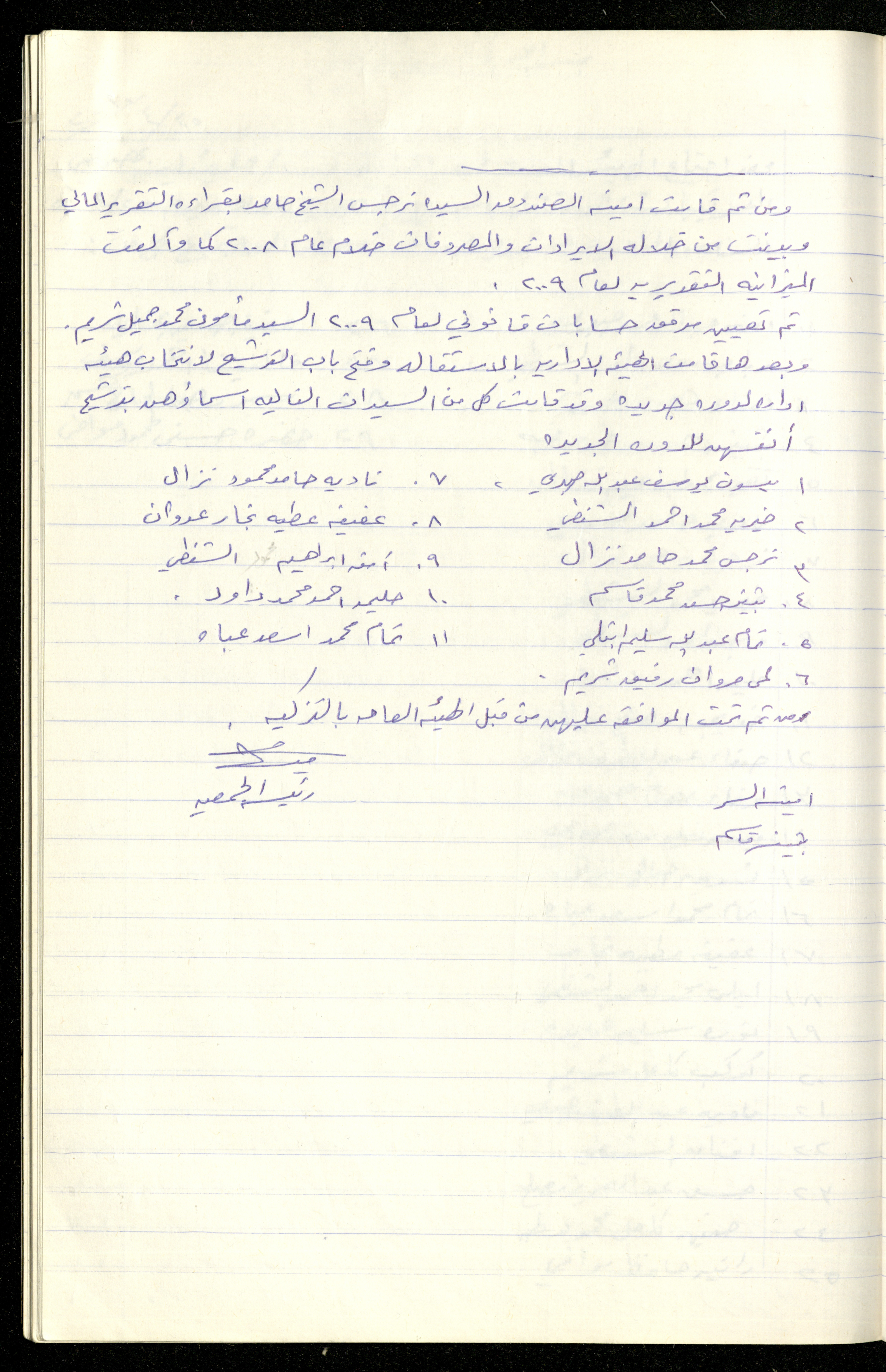 Handwritten, this 44-page document shows a record of the meetings' proceedings of the al-Murabitat Charitable Society's general assembly from 1981 to 2016. In each of them, the meeting's agenda, minutes, and the decisions resulting from it are recorded, and signed by the secretary and the president of the Society. In some meetings, the names of the members present were written down to check whether or not a quorum was complete.