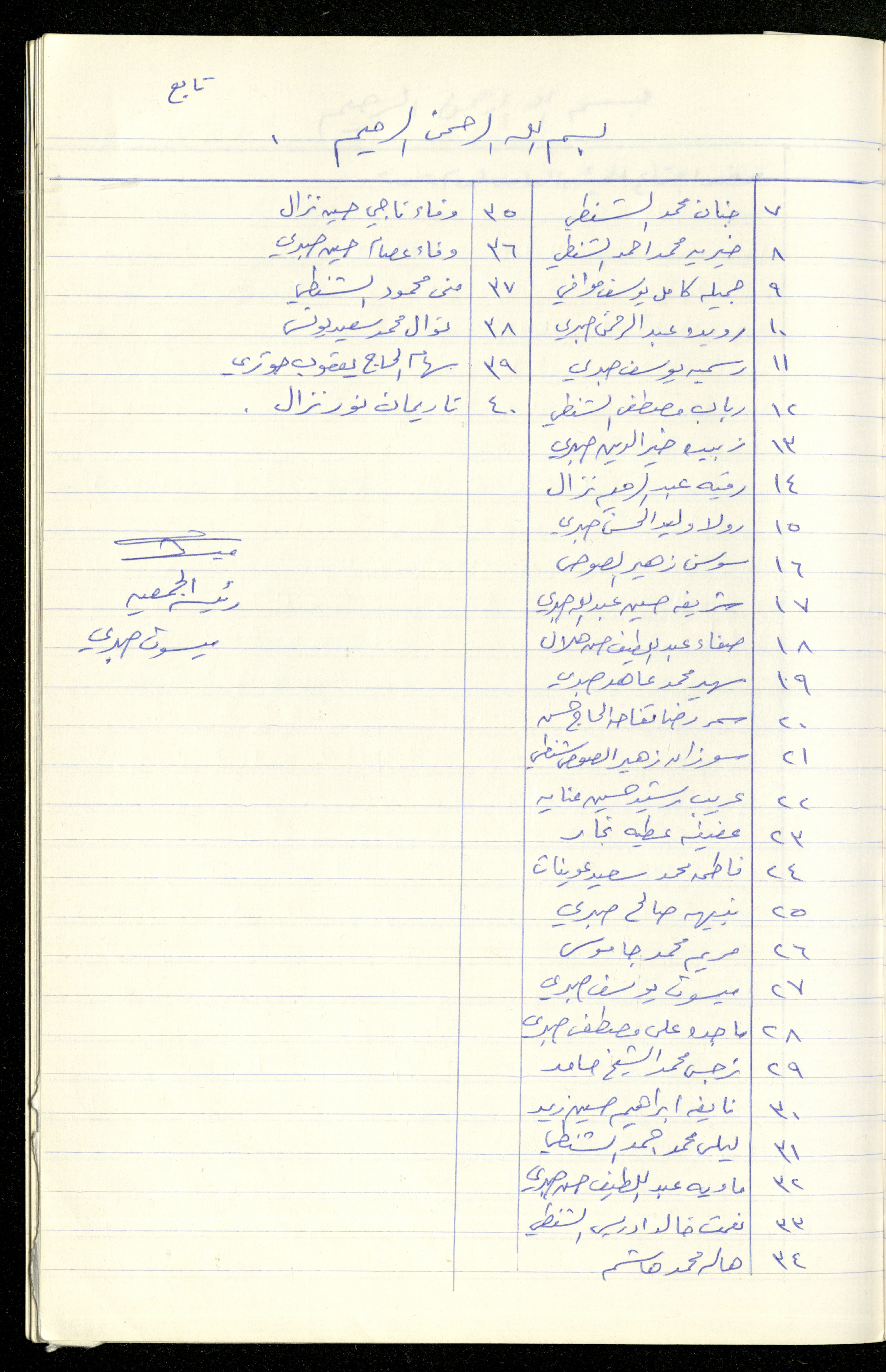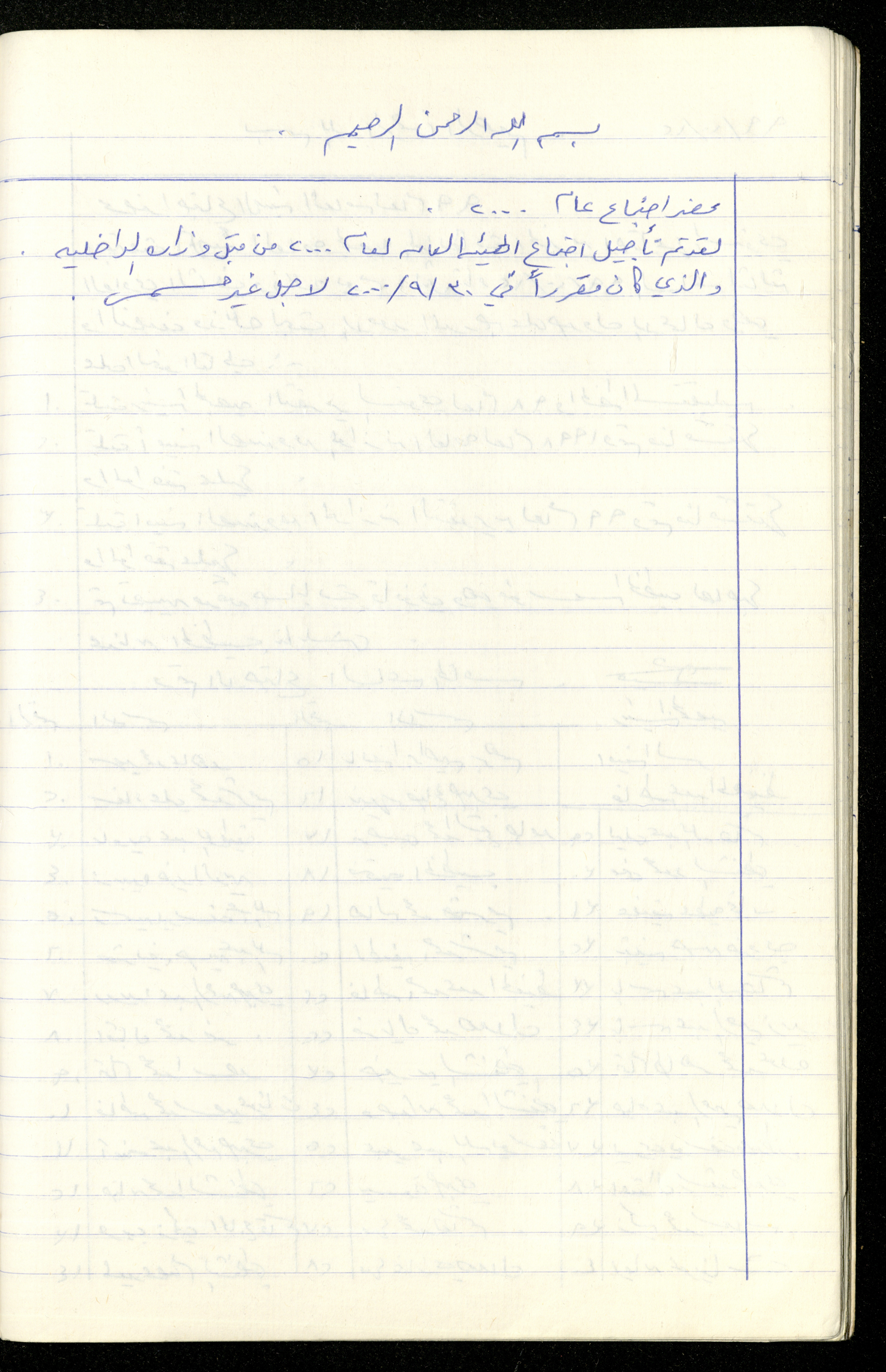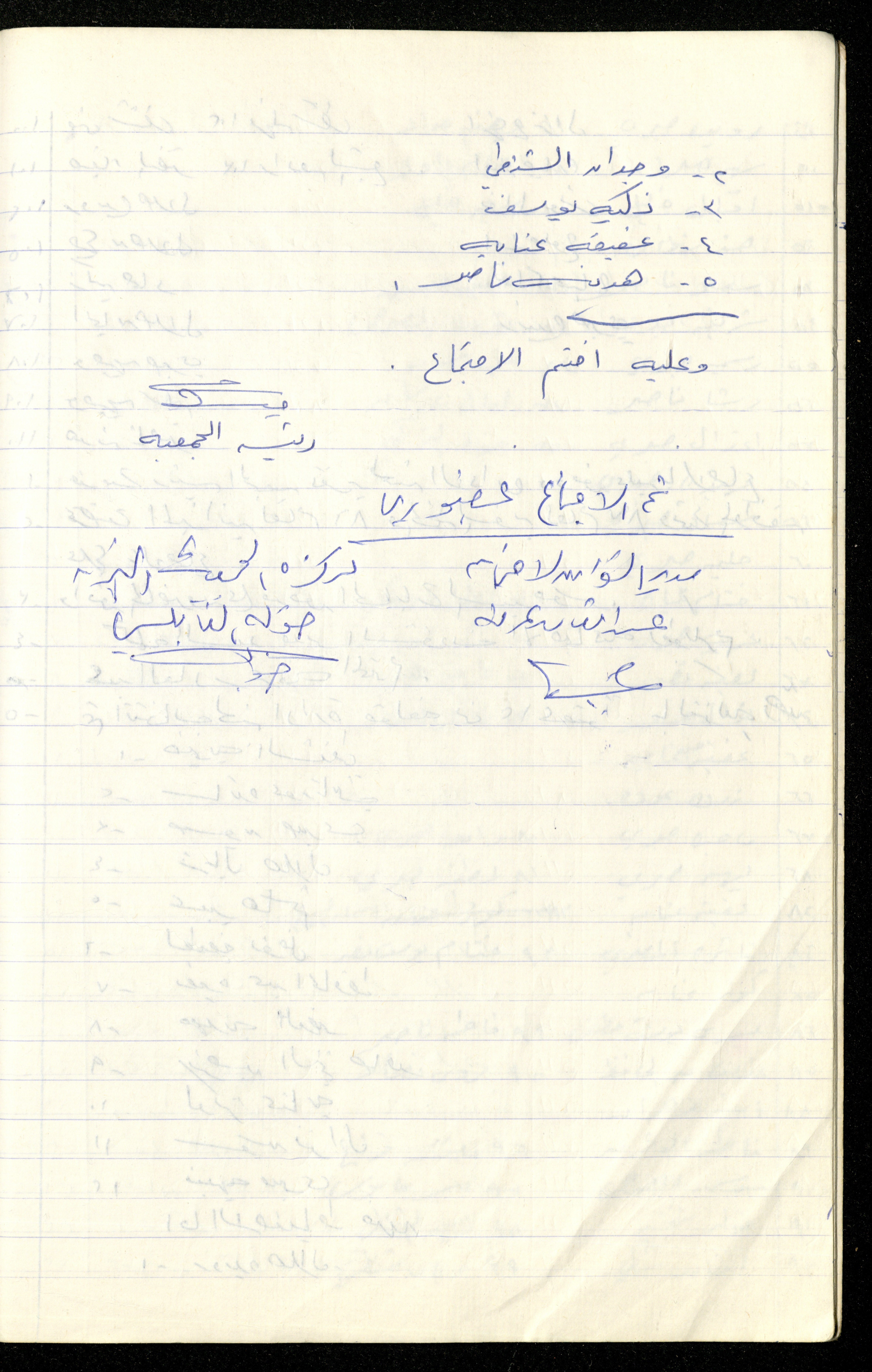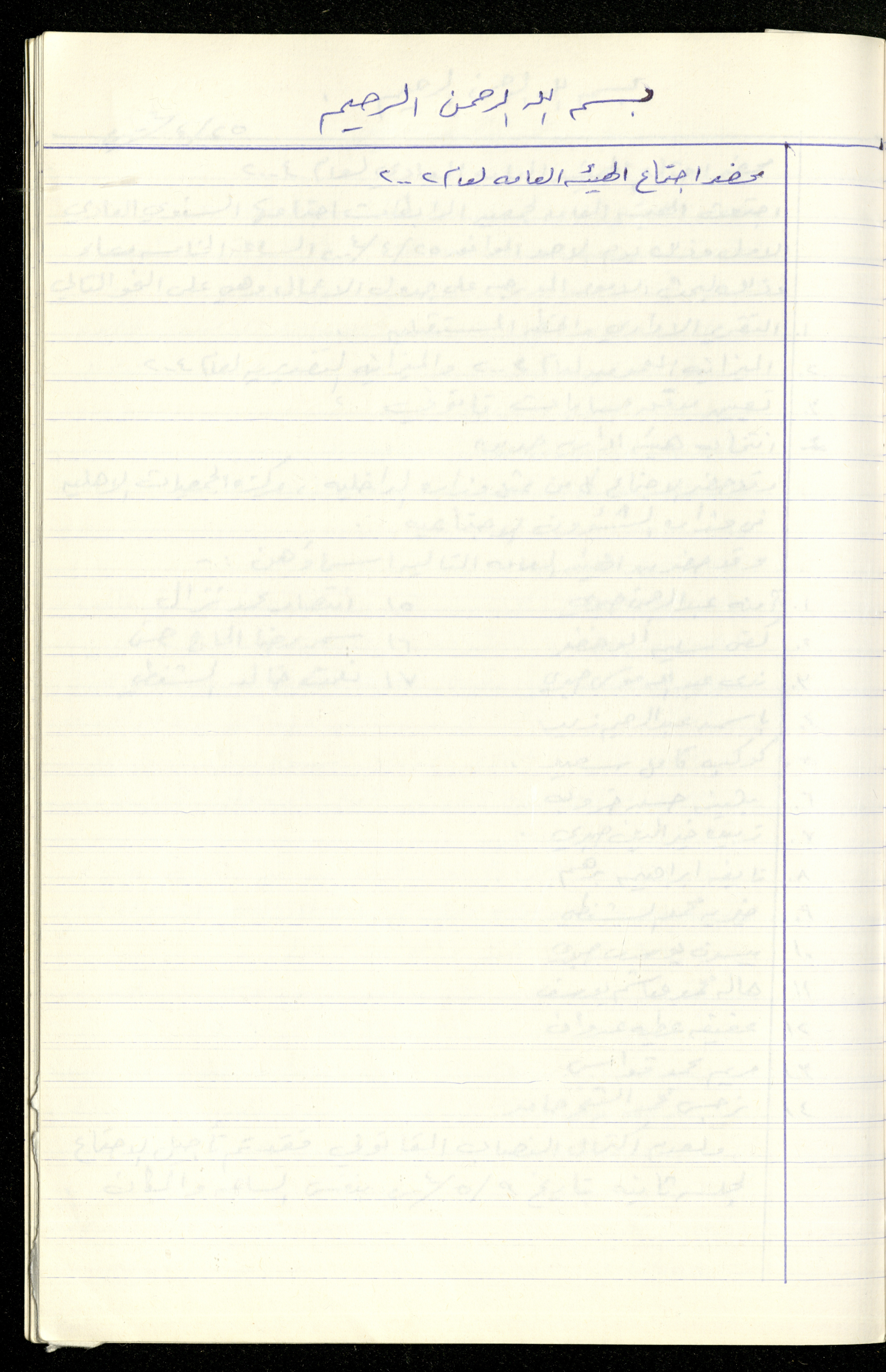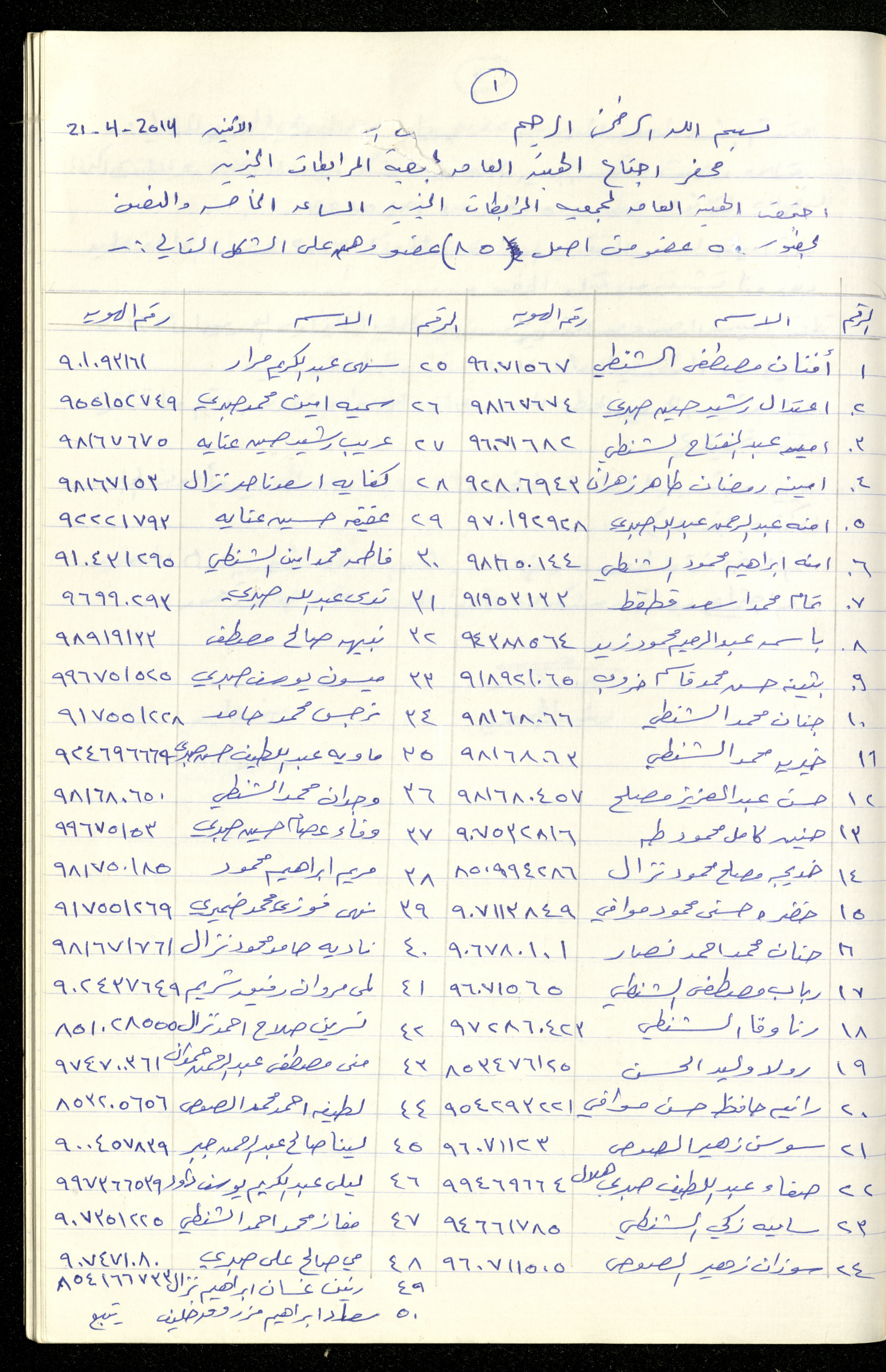 Handwritten, this 44-page document shows a record of the meetings' proceedings of the al-Murabitat Charitable Society's general assembly from 1981 to 2016. In each of them, the meeting's agenda, minutes, and the decisions resulting from it are recorded, and signed by the secretary and the president of the Society. In some meetings, the names of the members present were written down to check whether or not a quorum was complete.