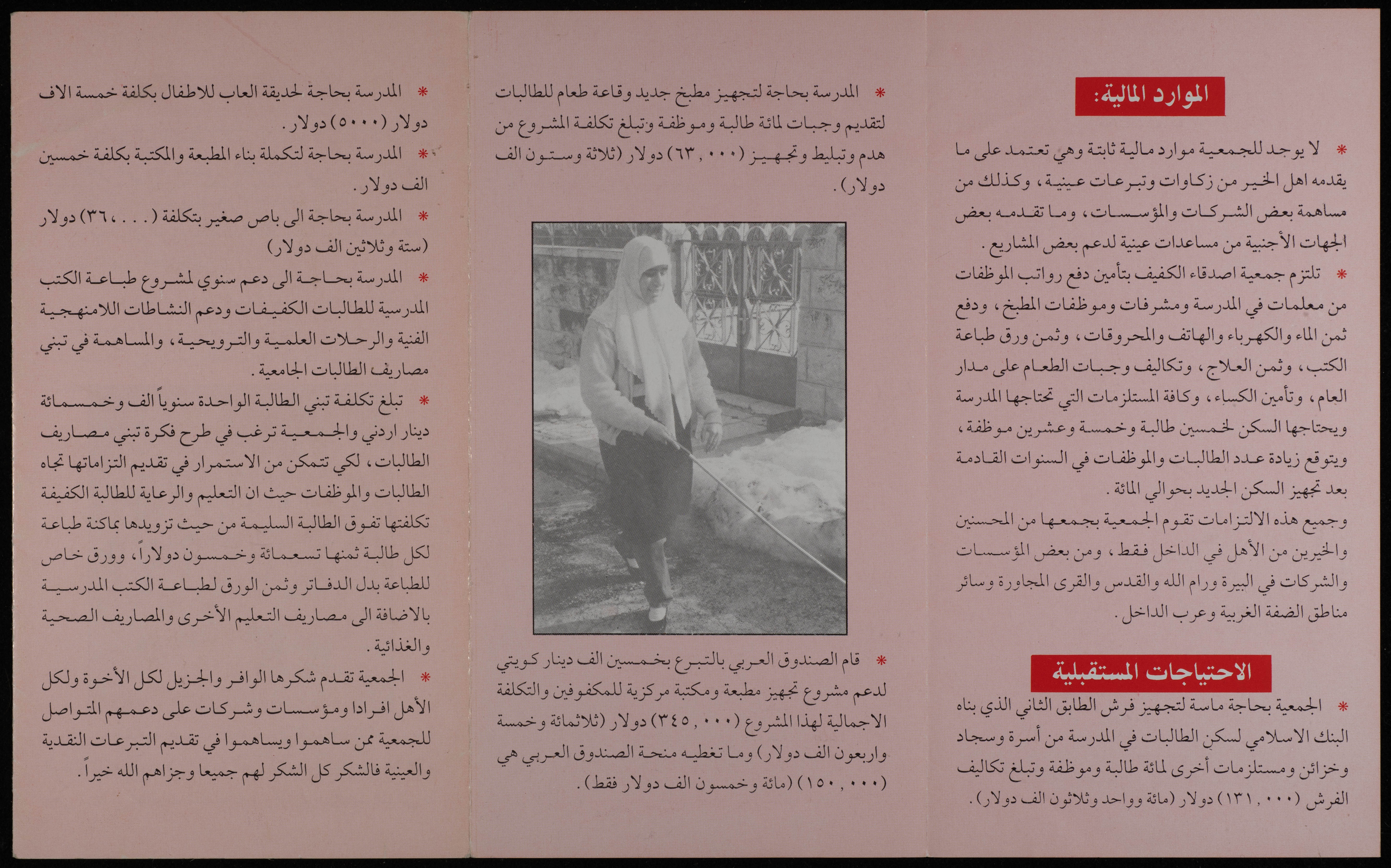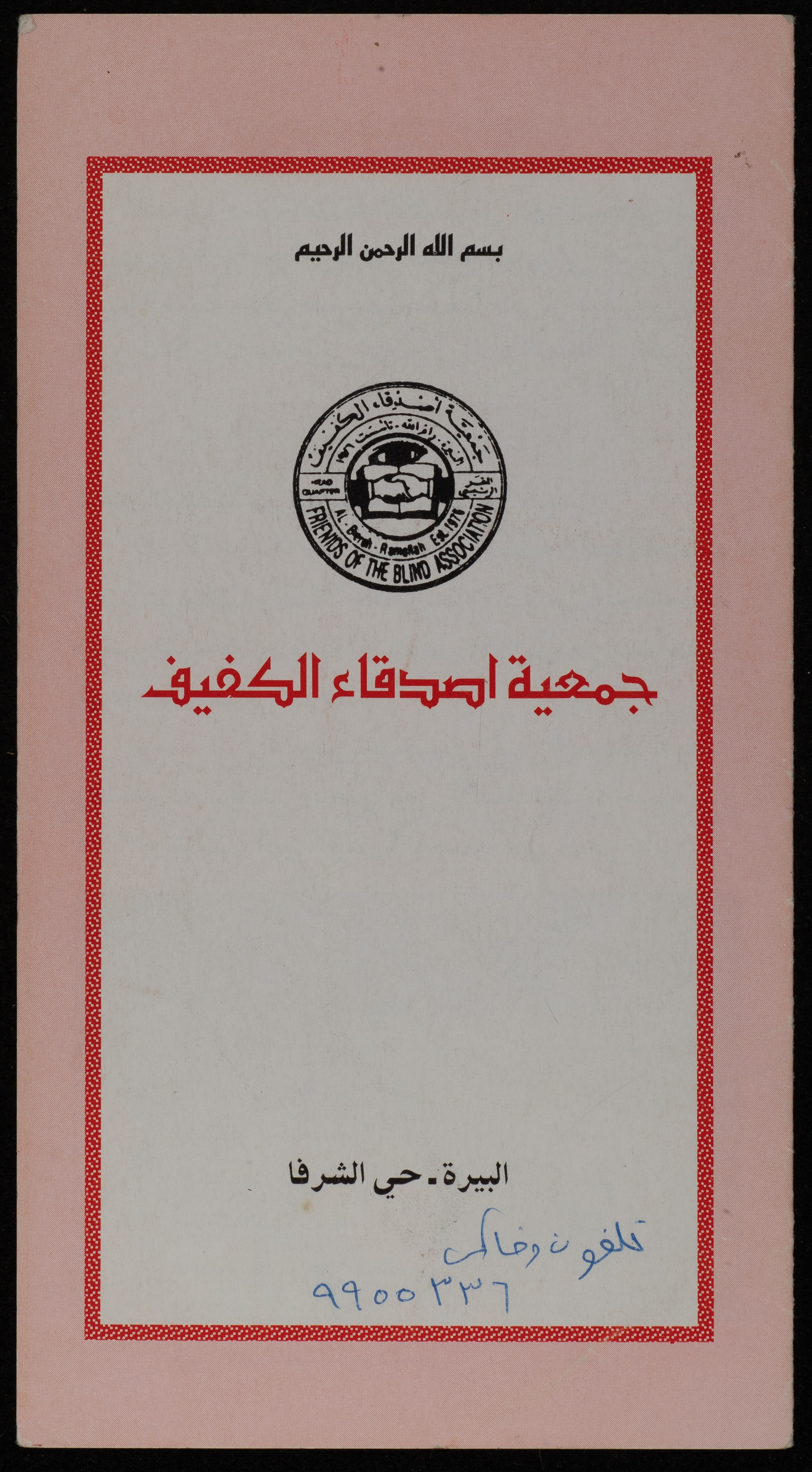 Issued by the Friends of the Blind Society in the 1980s in the city of al-Bireh, this document shows a bulletin that includes an overview of the society along with its goals, achievements, financial resources and future needs.