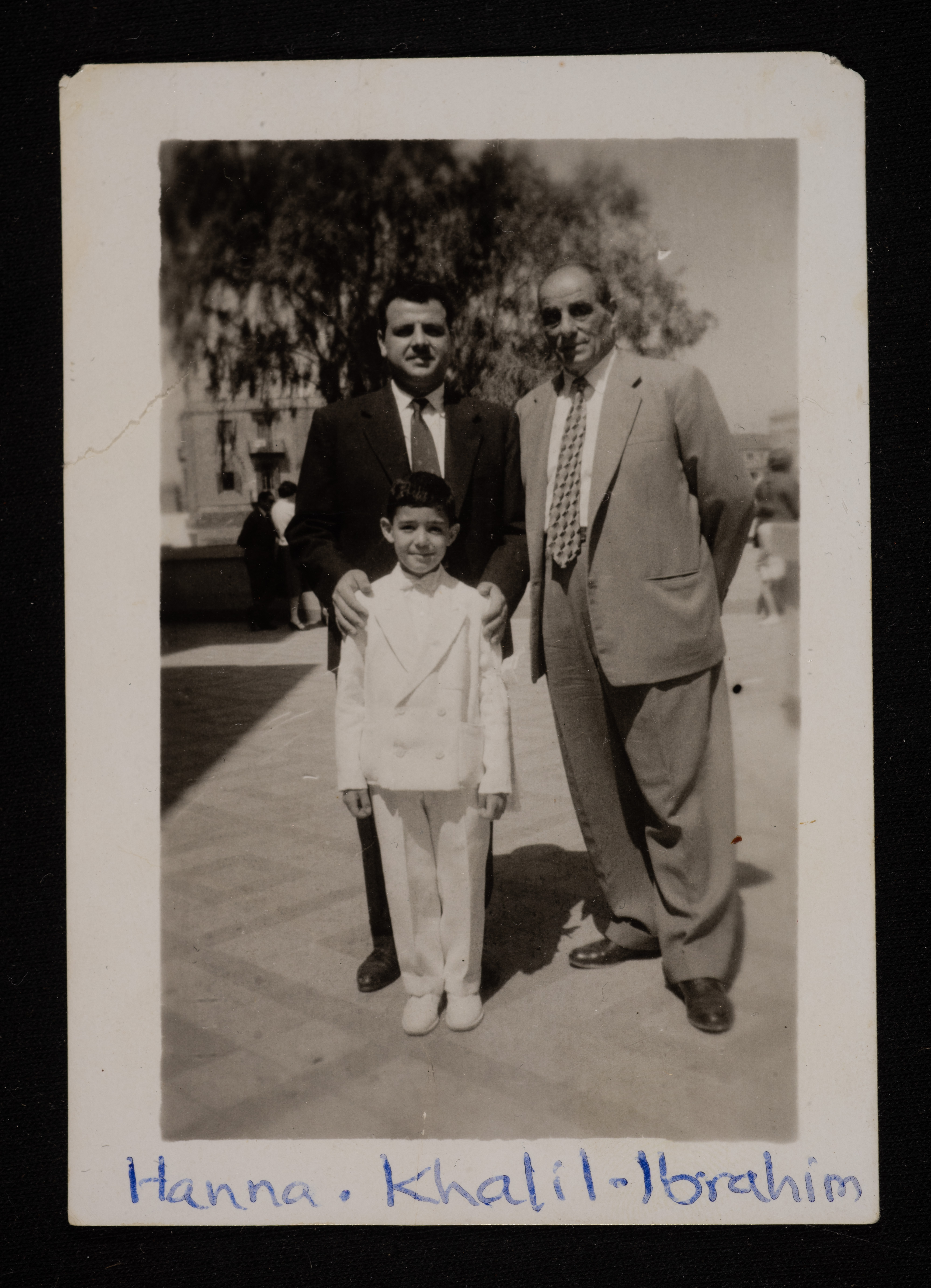 This postcard shows a photograph of Hanna Khalil Ibrahim with another man and a child.
