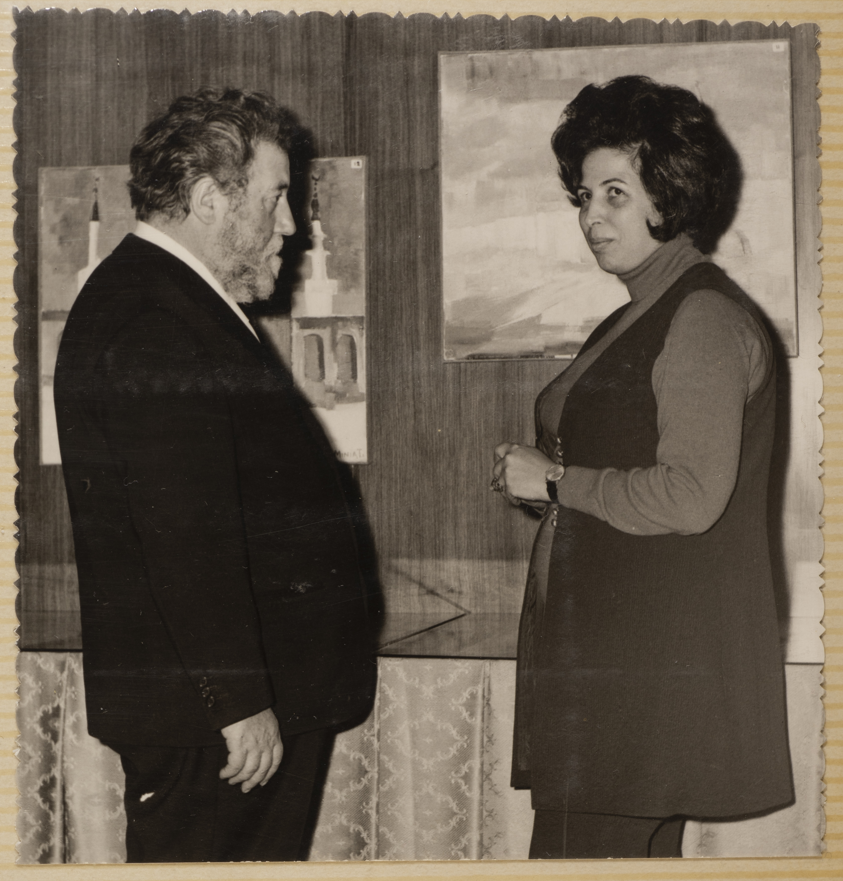 صورة تجمع نهى بطشون مع الفنان أرنالدو منيانتي خلال معرضه الذي أقيم في عمّان بين 4 و6 تشرين الثاني 1972.