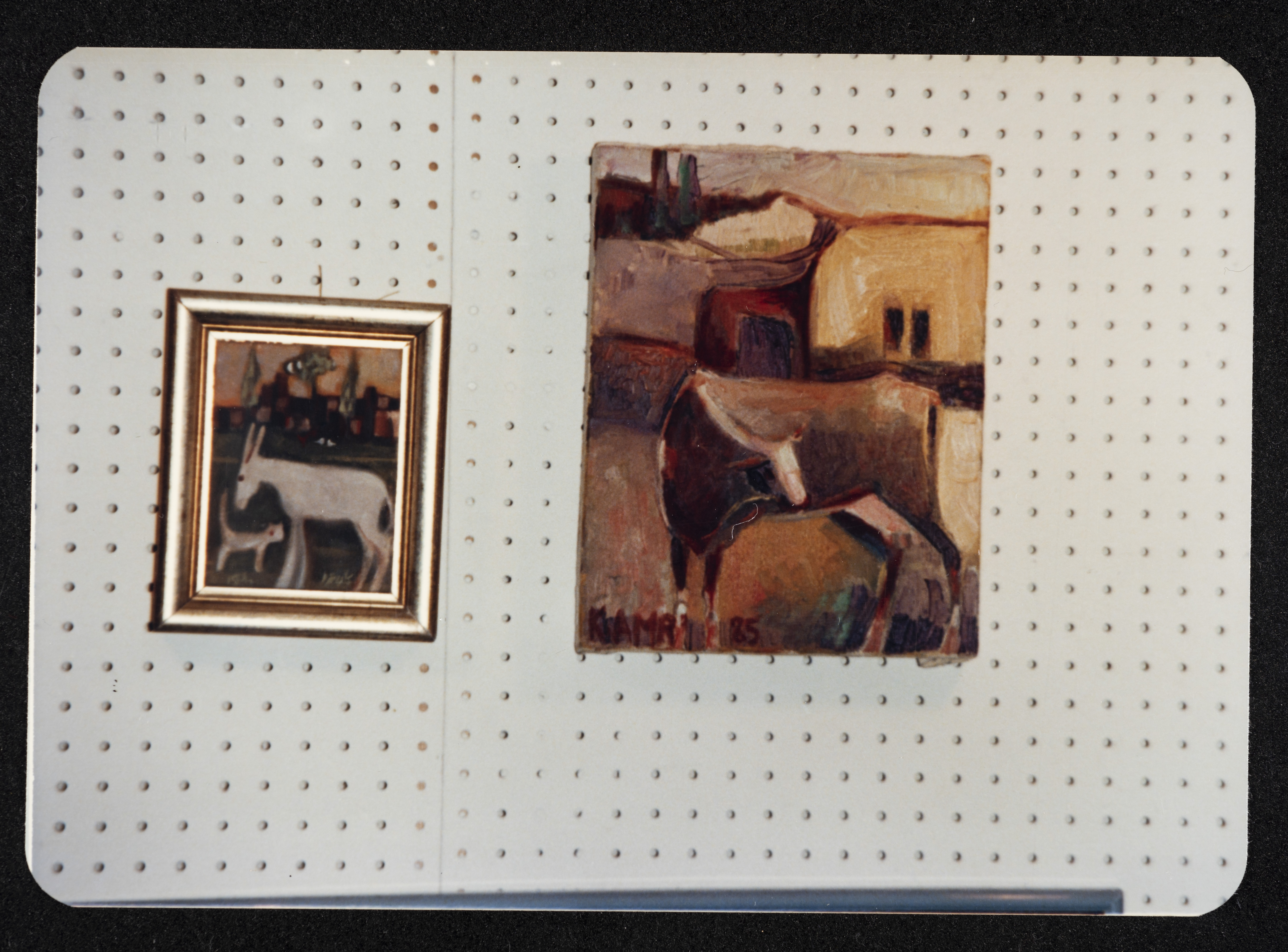 صورة لعمل للفنان كايد عمرو، التُقطت أثناء مشاركته في معرض أُقيمَ في غاليري نهى بطشون "ذا غاليري" في فندق إنتركونتيننتال في عمّان عام 1985.