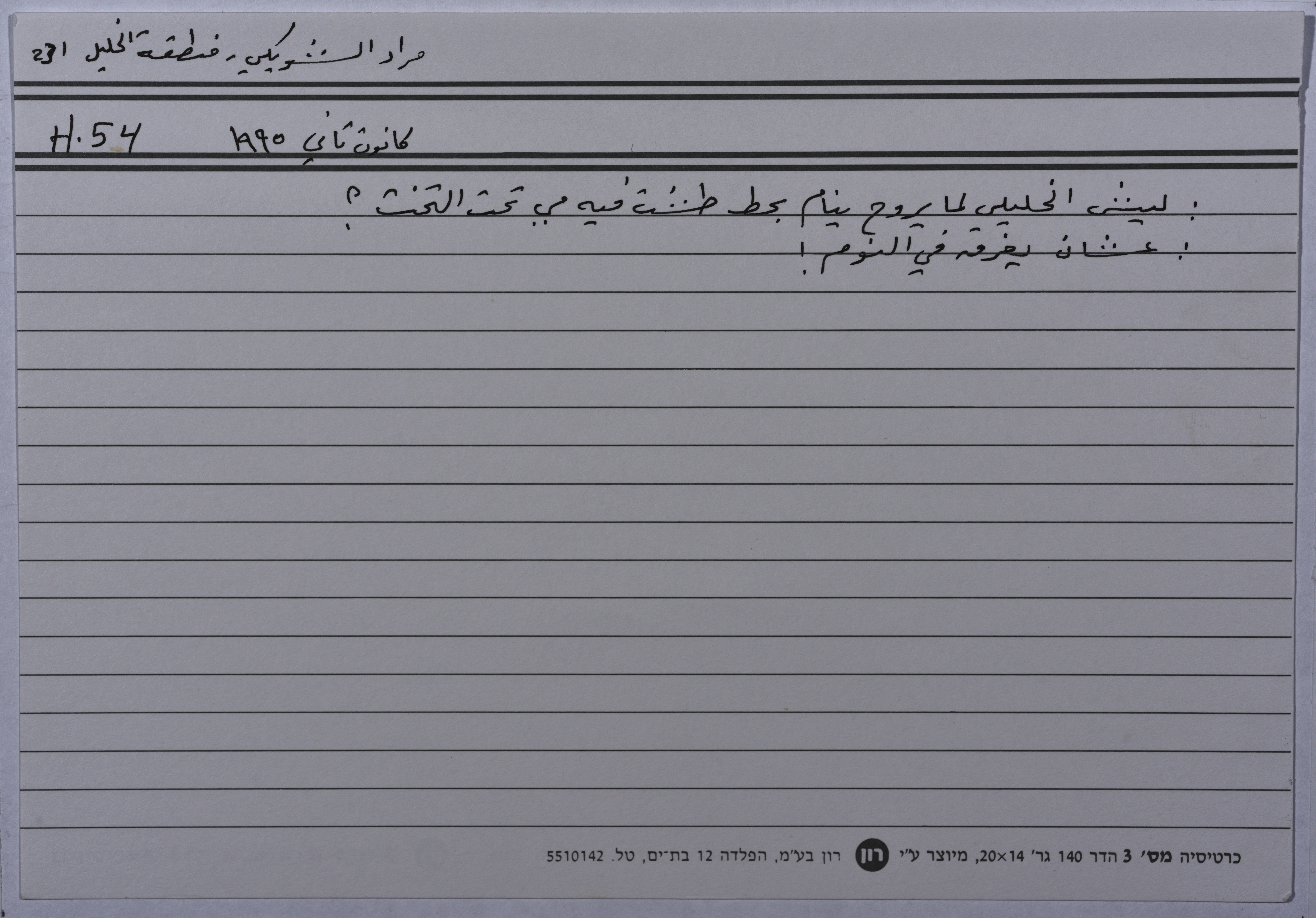 These jokes and stories were collected and recorded by Sharif Kanaana, from the late 1980s until 2005. Each card includes the name of the narrator, the place of residence and the date.