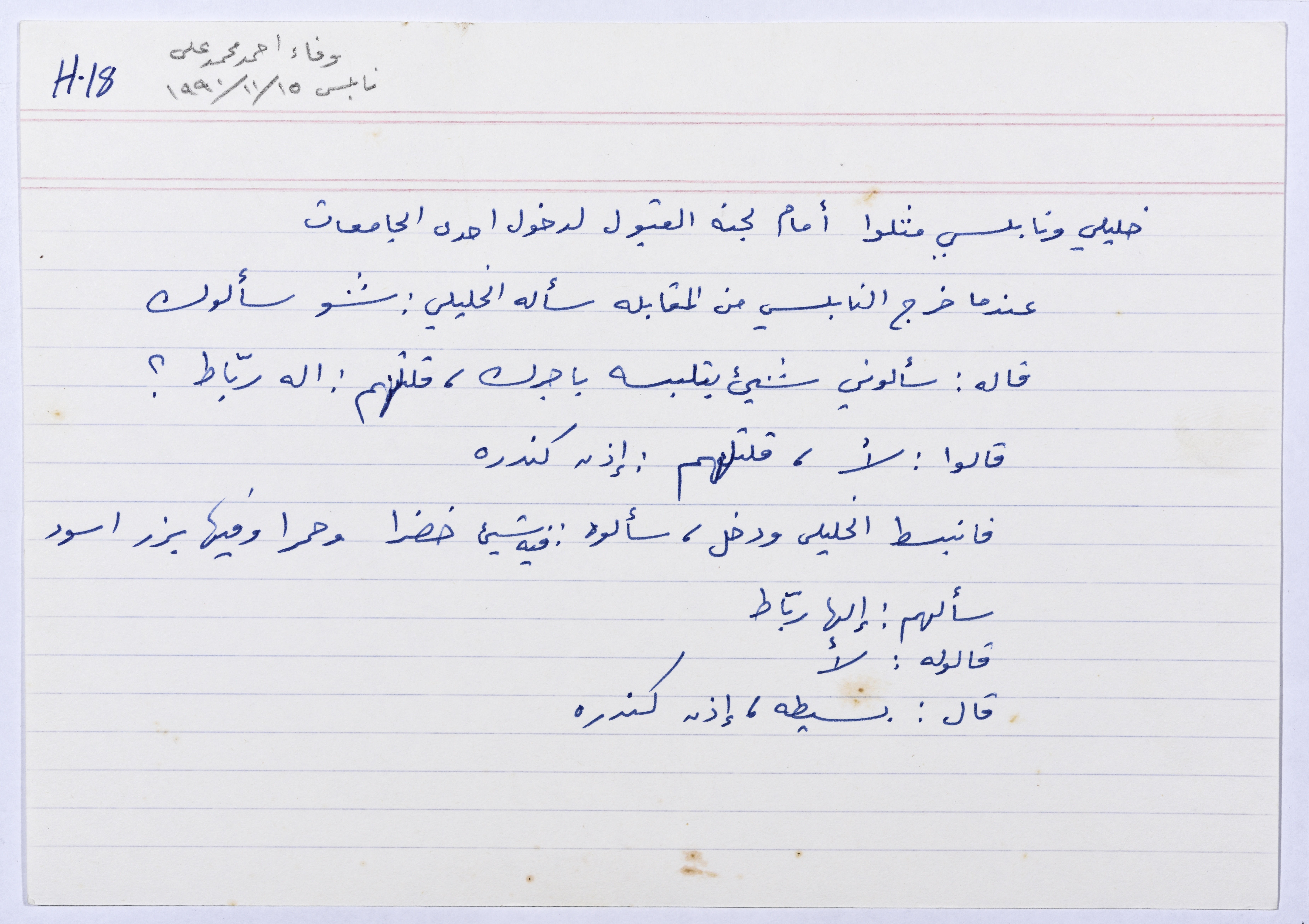 بطاقة وُثِّق عليها نكتة بعنوان "الخليلي والقبول في الجامعة"