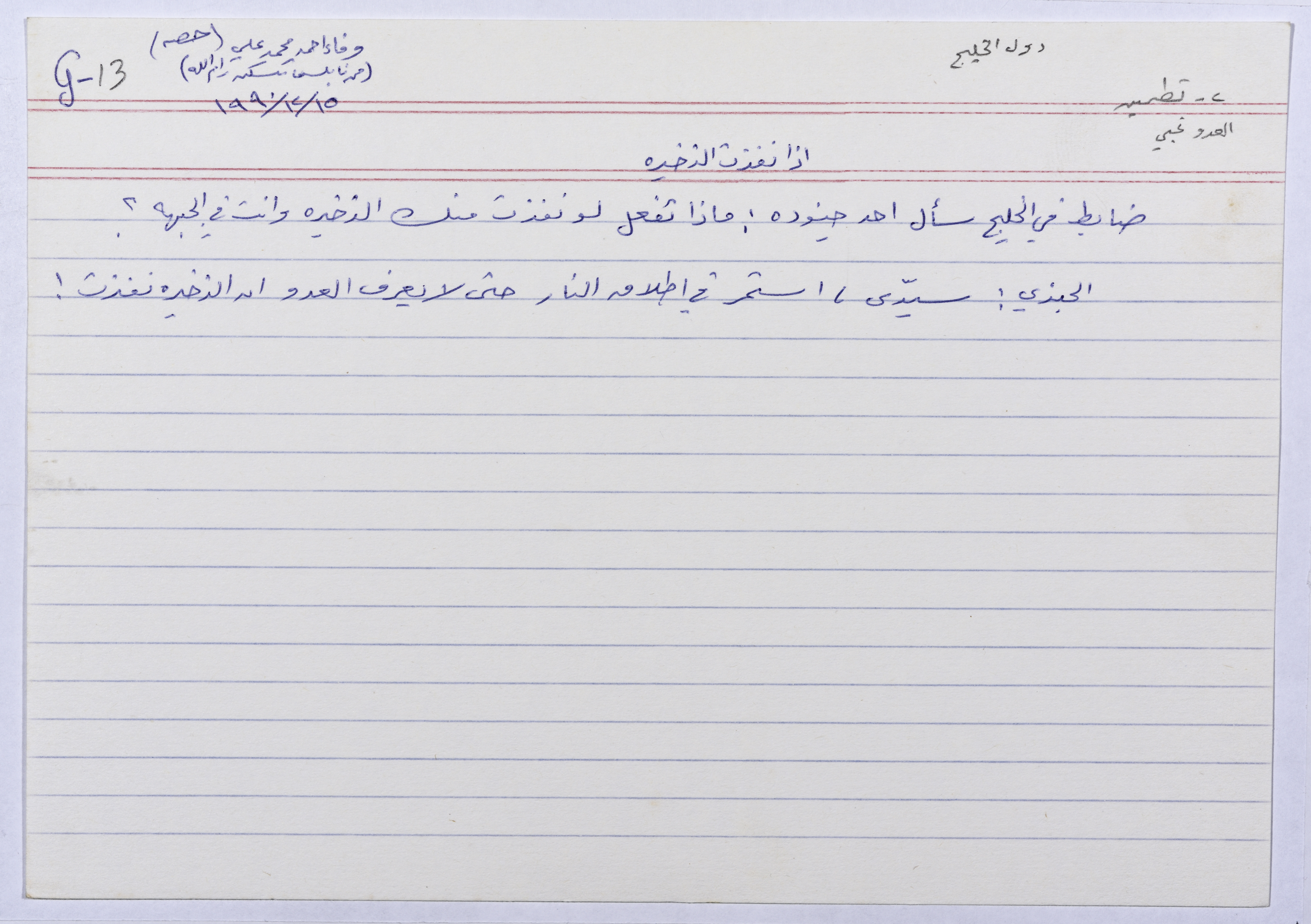 بطاقة وُثِّق عليها نكتة بعنوان "إذا نفذت الذخيرة"