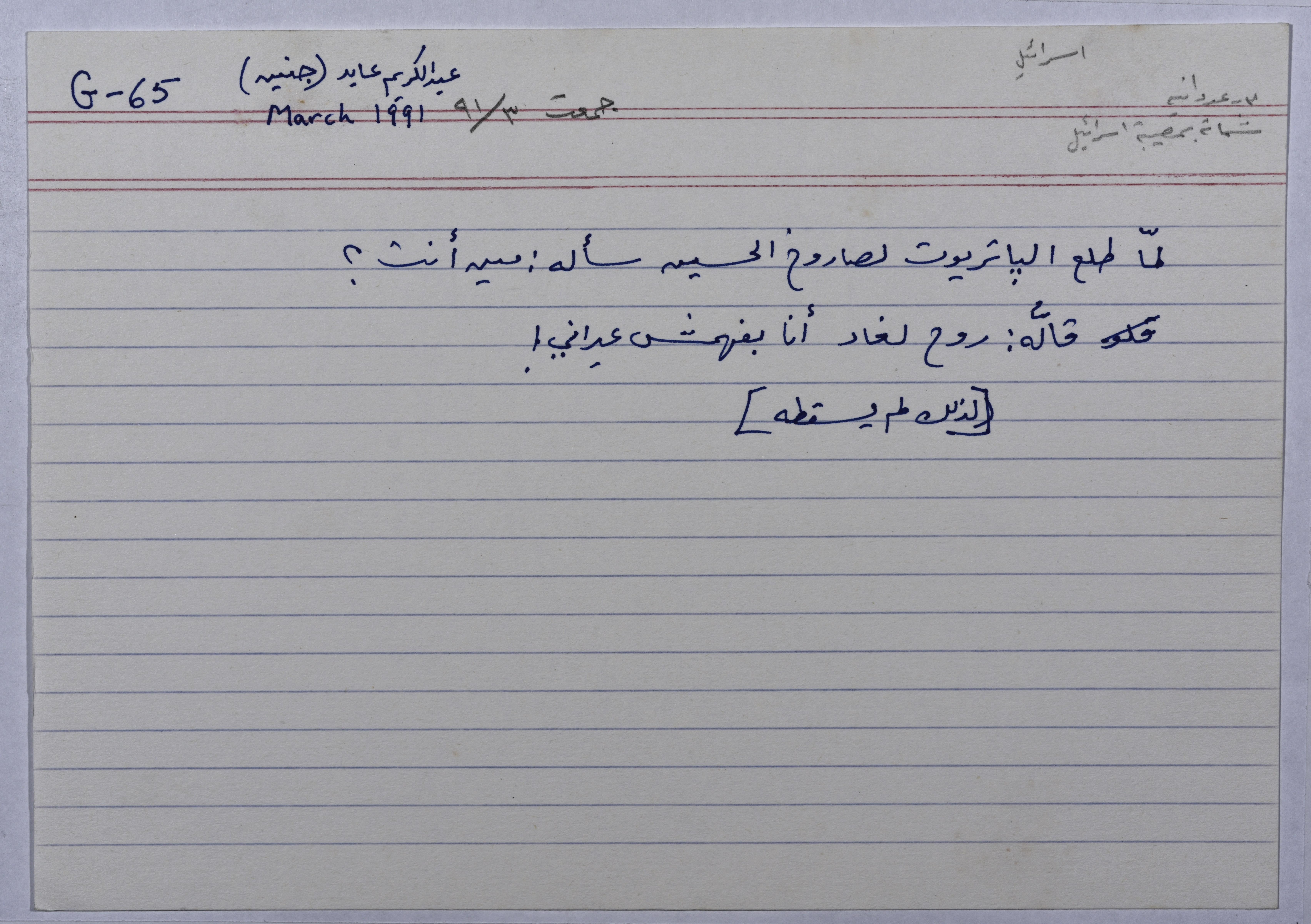 جُمعت هذه النكت من قِبل شريف كناعنة، بدأ بجمعها من أواخر الثمانينيات حتى منتصف العقد الأول من القرن الواحد العشرين. تتضمن البطاقة اسم راوي النكتة ومكان سكنه والتاريخ.