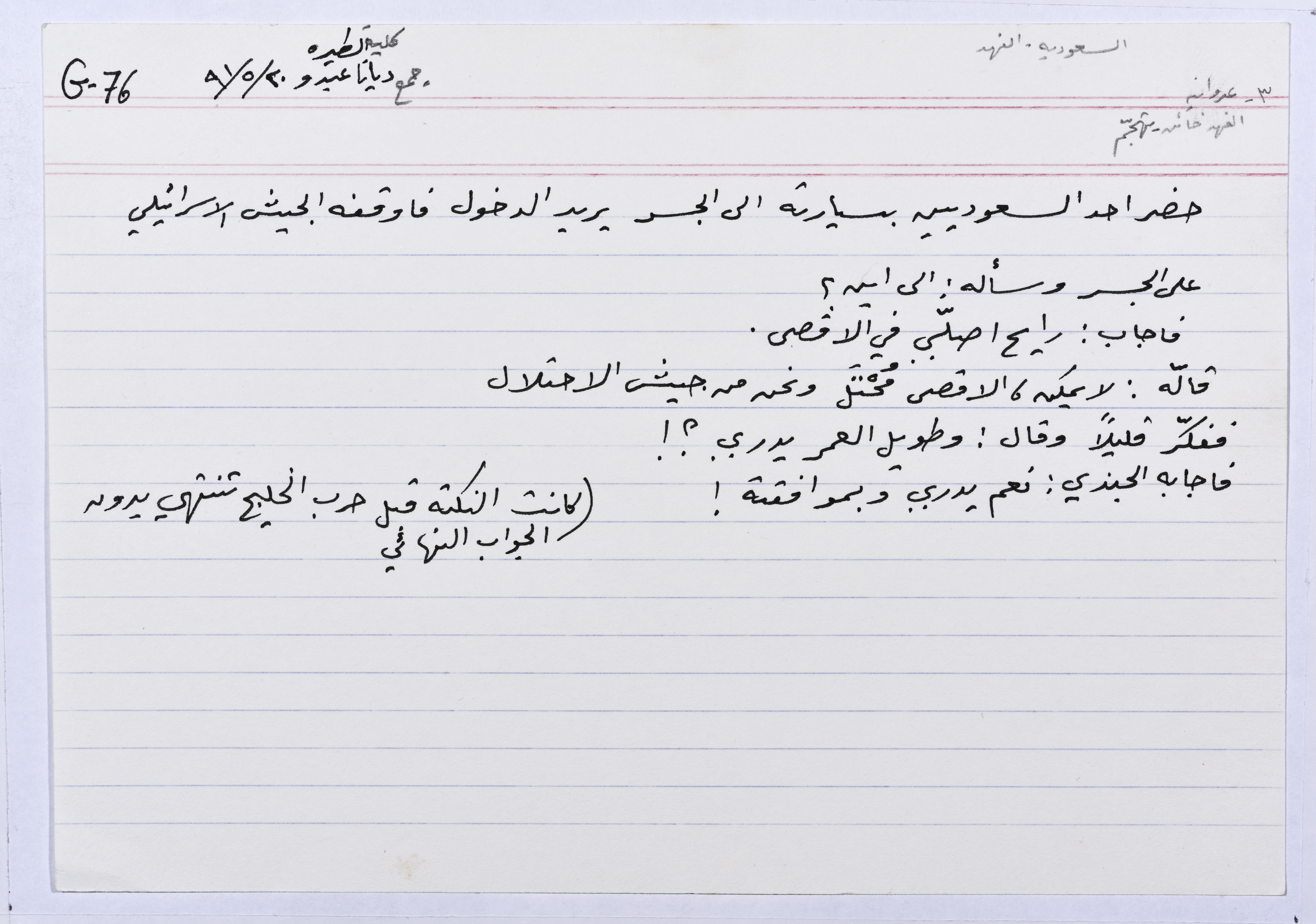 A card documenting a joke entitled "Palestine and Saudi Arabia"