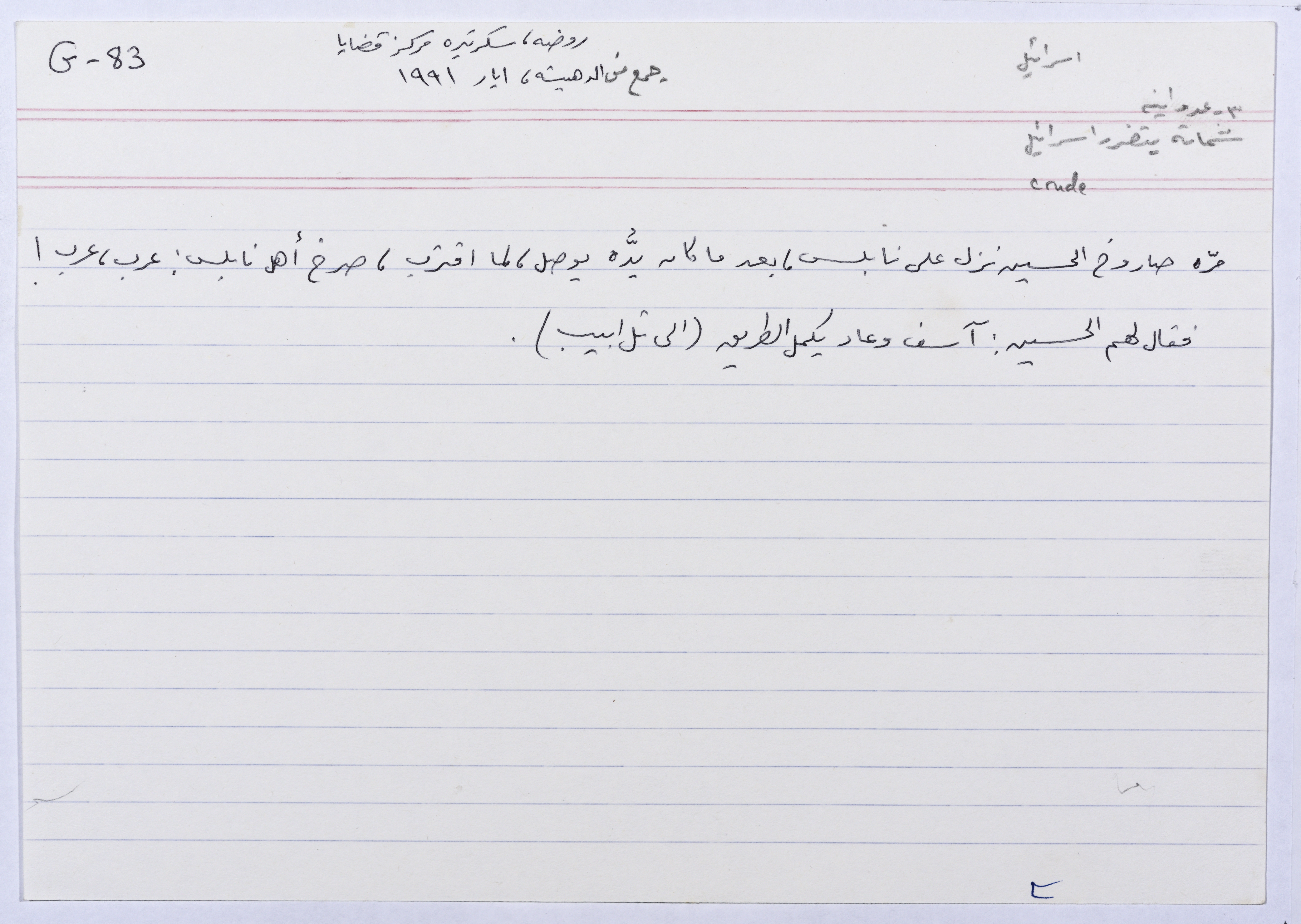 These jokes and stories were collected and recorded by Sharif Kanaana, from the late 1980s until 2005. Each card includes the name of the narrator, the place of residence and the date.