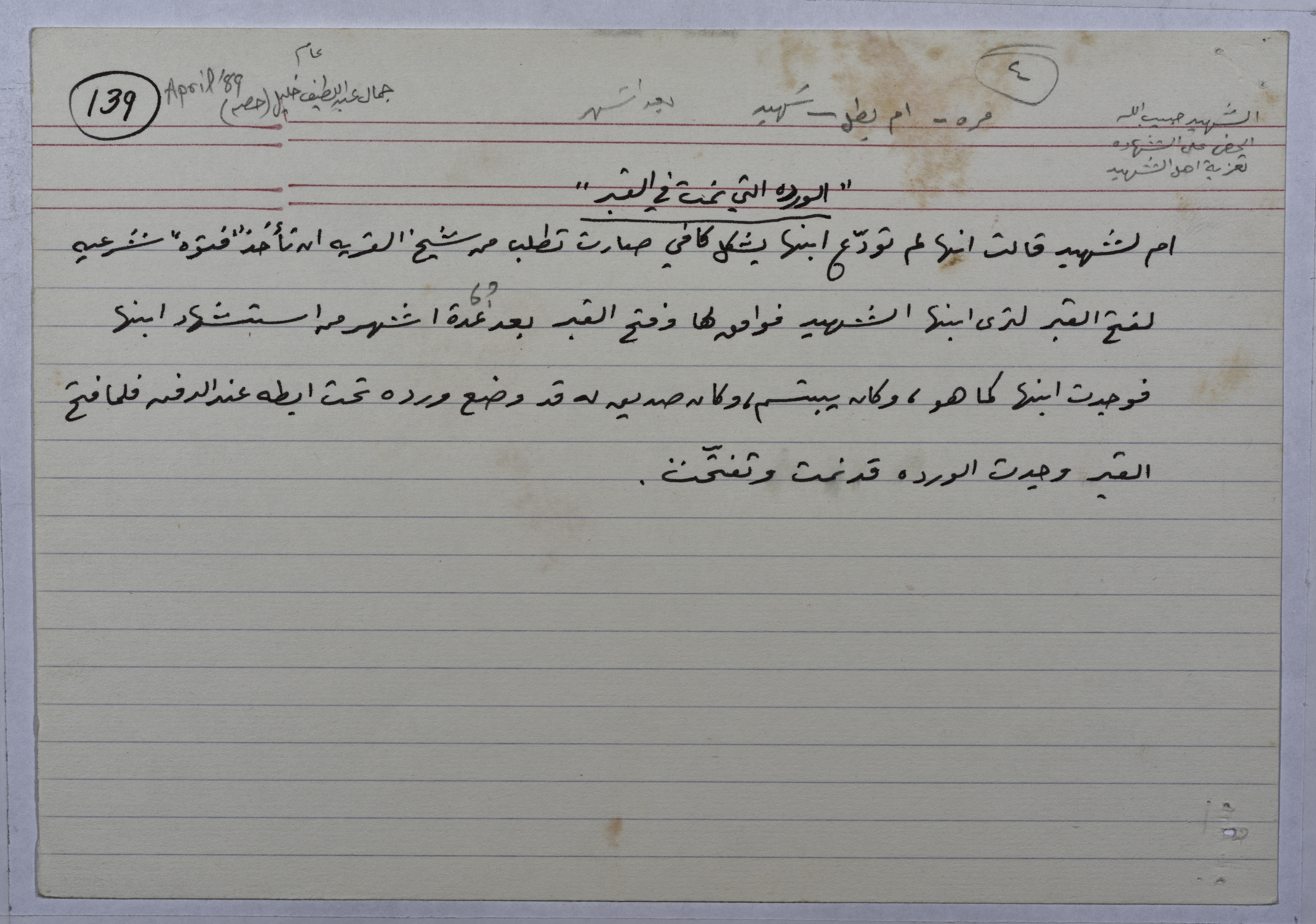 بطاقة وُثِّق عليها نكتة بعنوان "الوردة التي نمت في القبر"