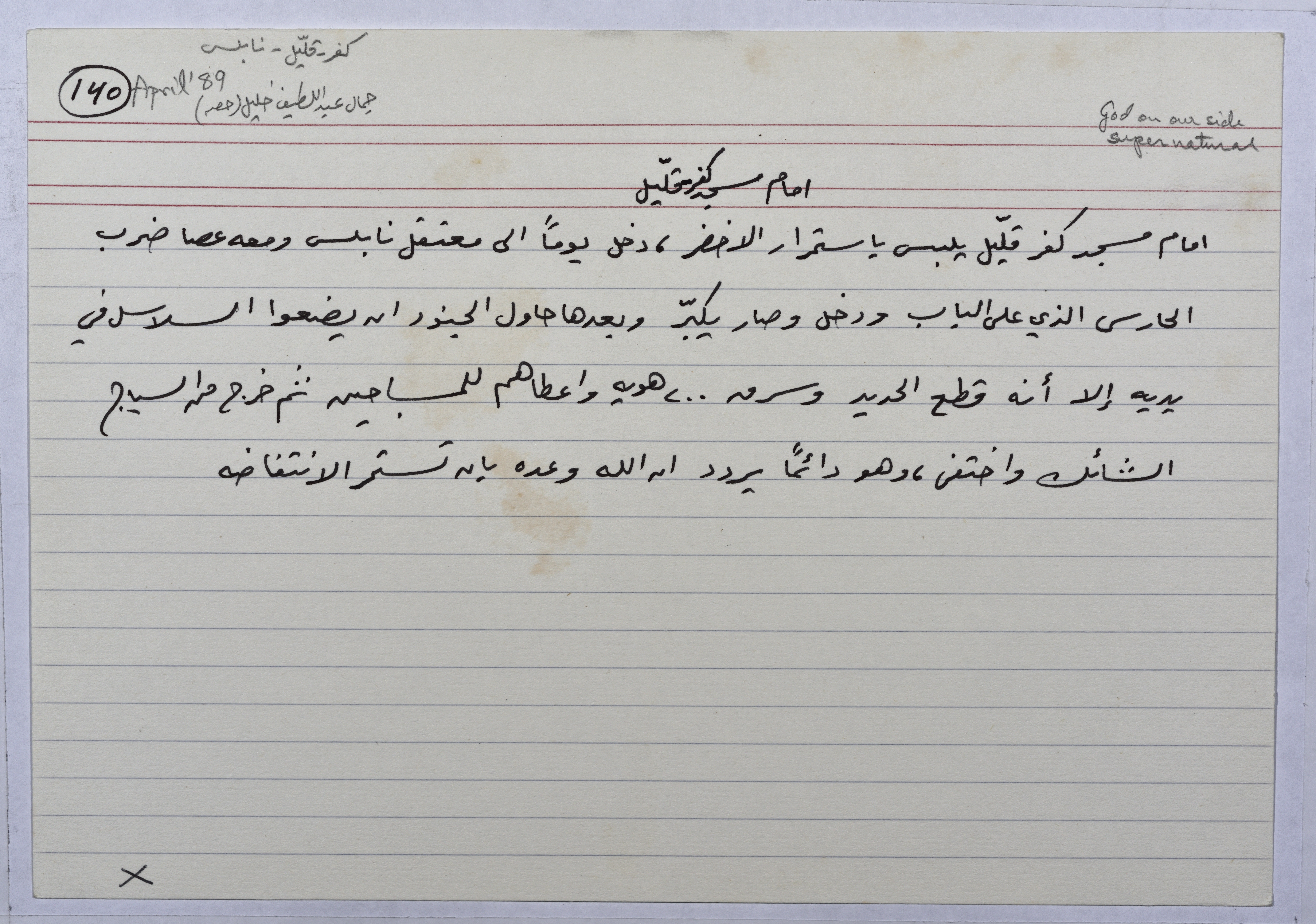 بطاقة وُثِّق عليها حكاية بعنوان "أمام مسجد كفر قليّل"