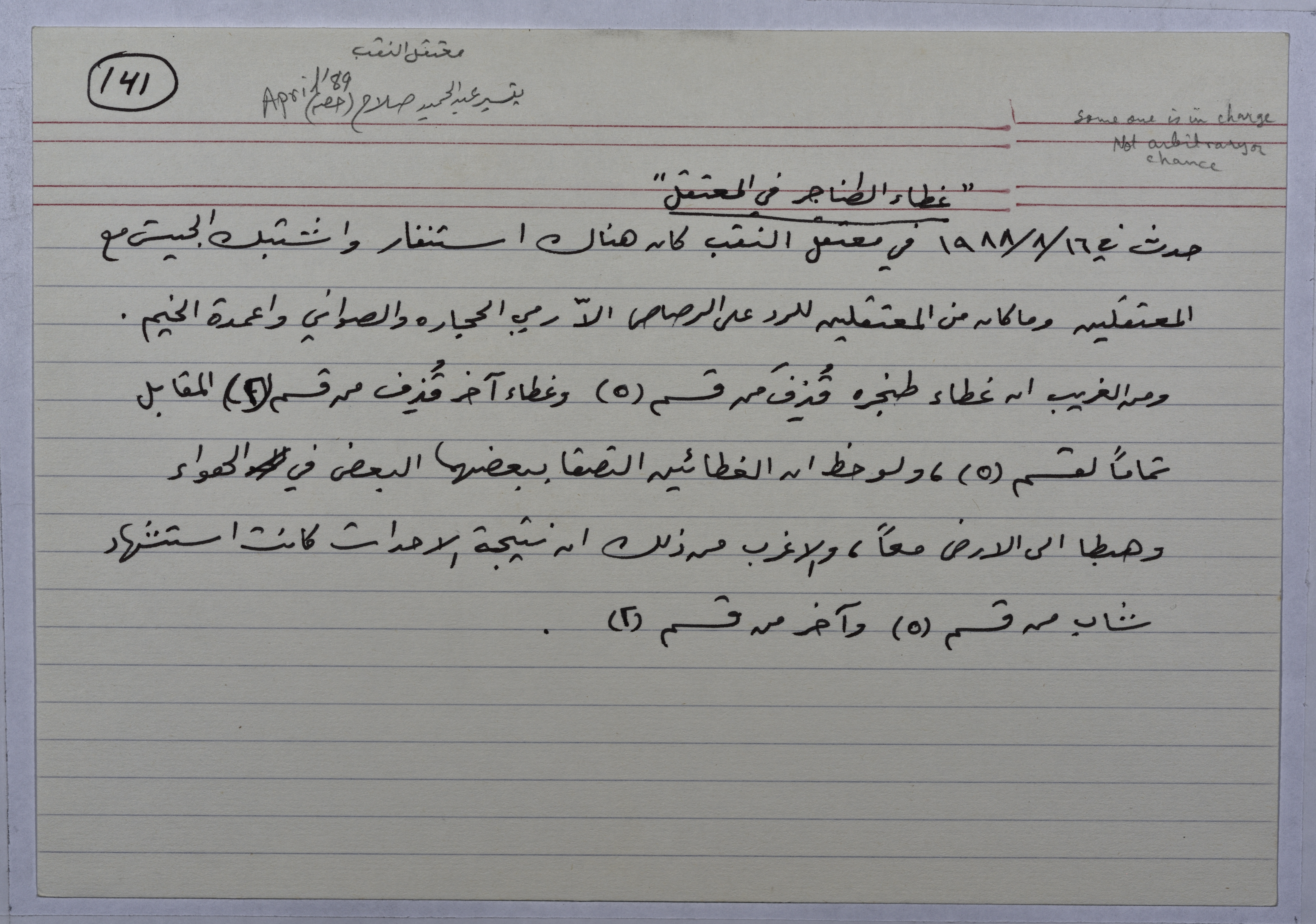 بطاقة وُثِّق عليها حكاية بعنوان "غطاء الطناجر في المُعتَقل"