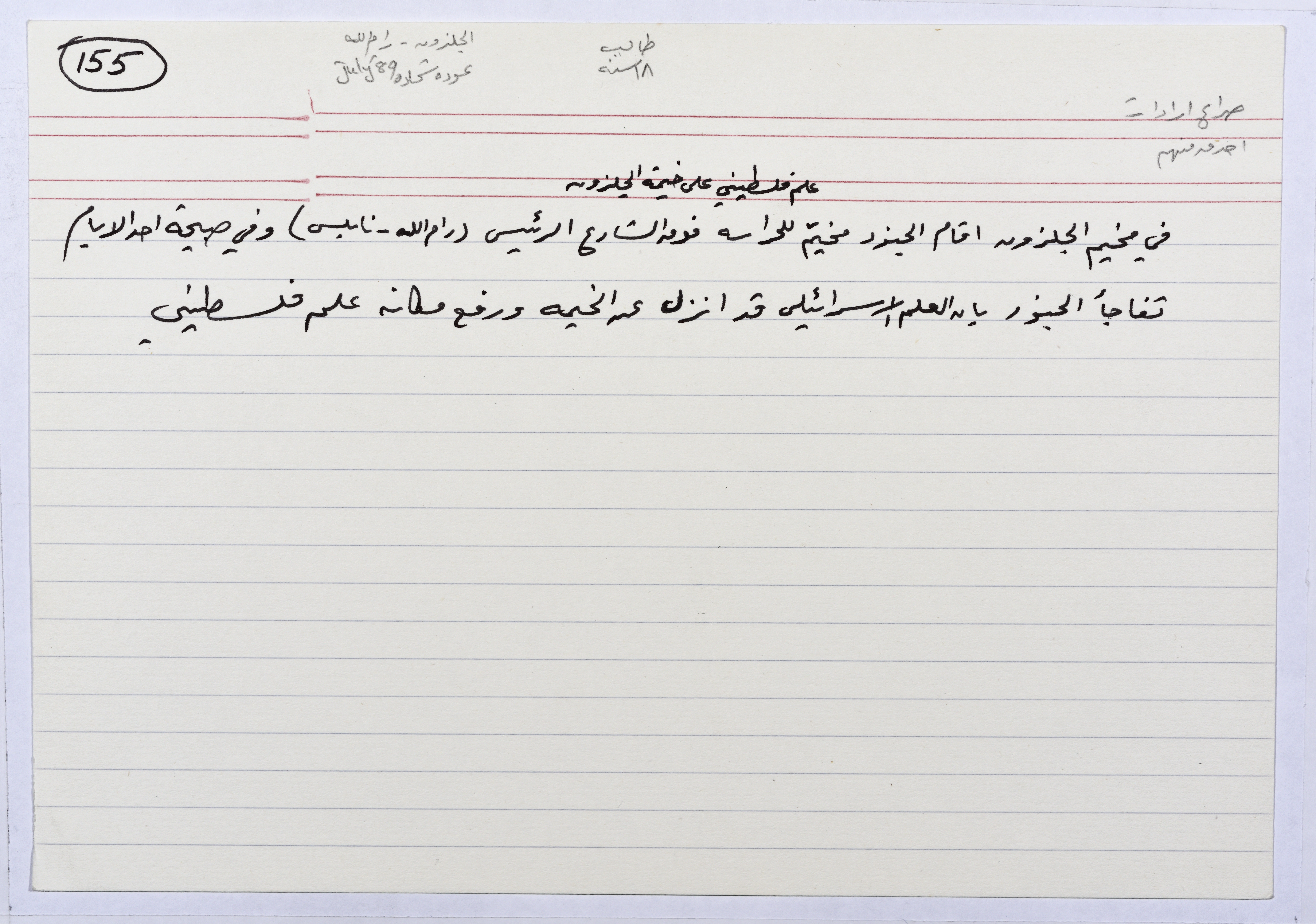 بطاقة وُثِّق عليها حكاية بعنوان "علم فلسطيني على خيمة الجلزون"