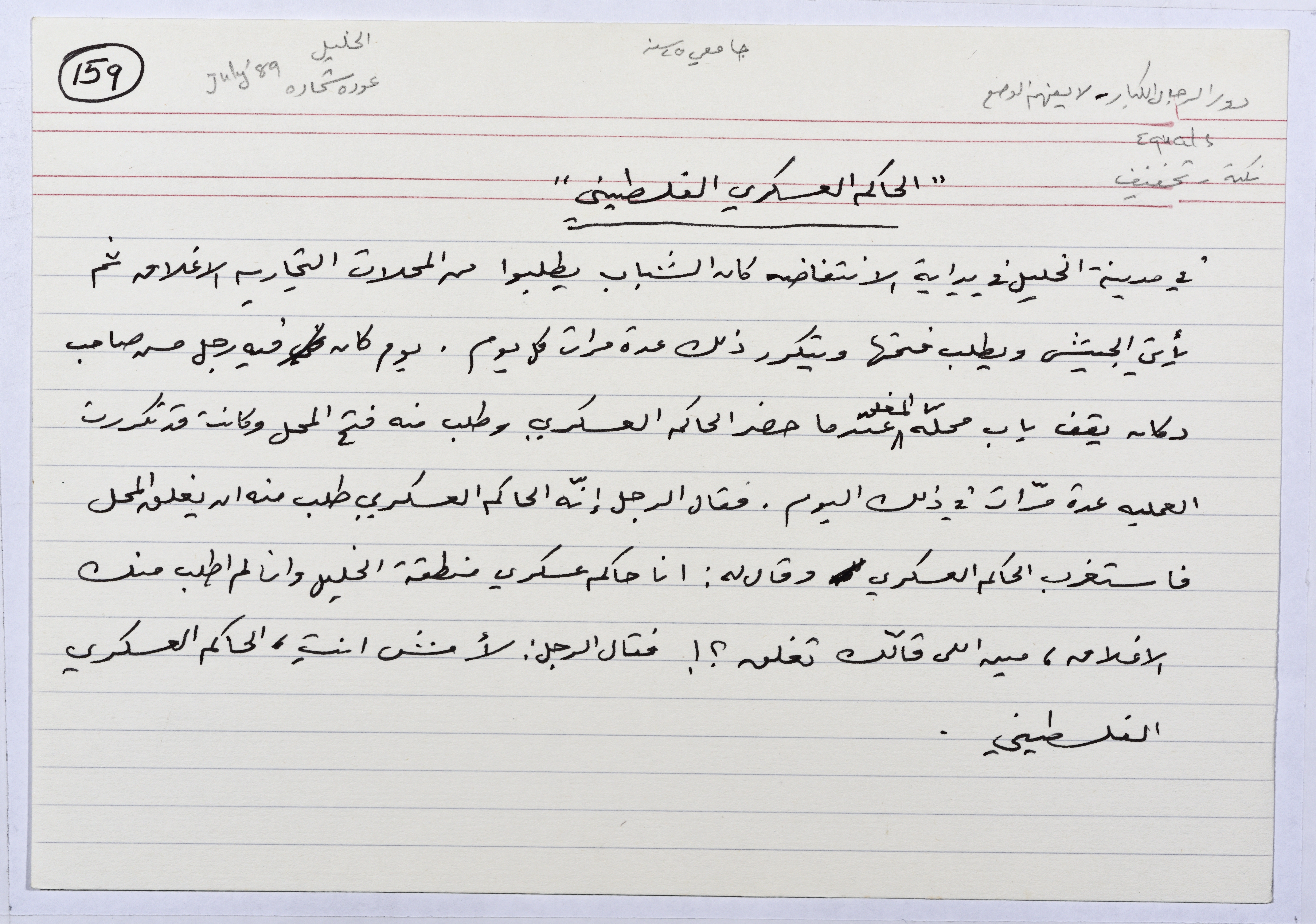بطاقة وُثِّق عليها حكاية بعنوان "الحاكم العسكري الفلسطيني"