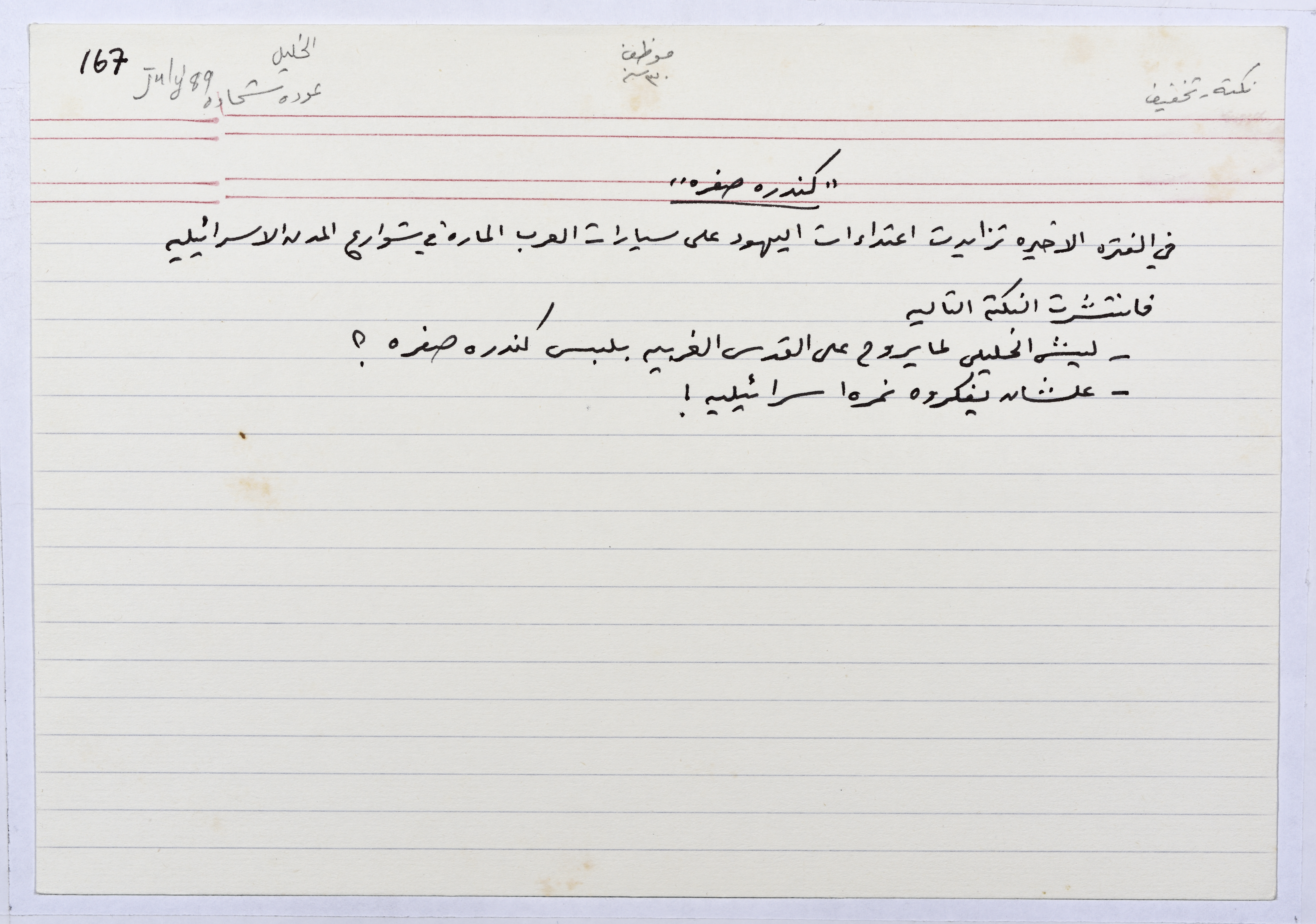جُمعت هذه النكت من قِبل شريف كناعنة، بدأ بجمعها من أواخر الثمانينيات حتى منتصف العقد الأول من القرن الواحد العشرين. تتضمن البطاقة اسم راوي النكتة ومكان سكنه والتاريخ.