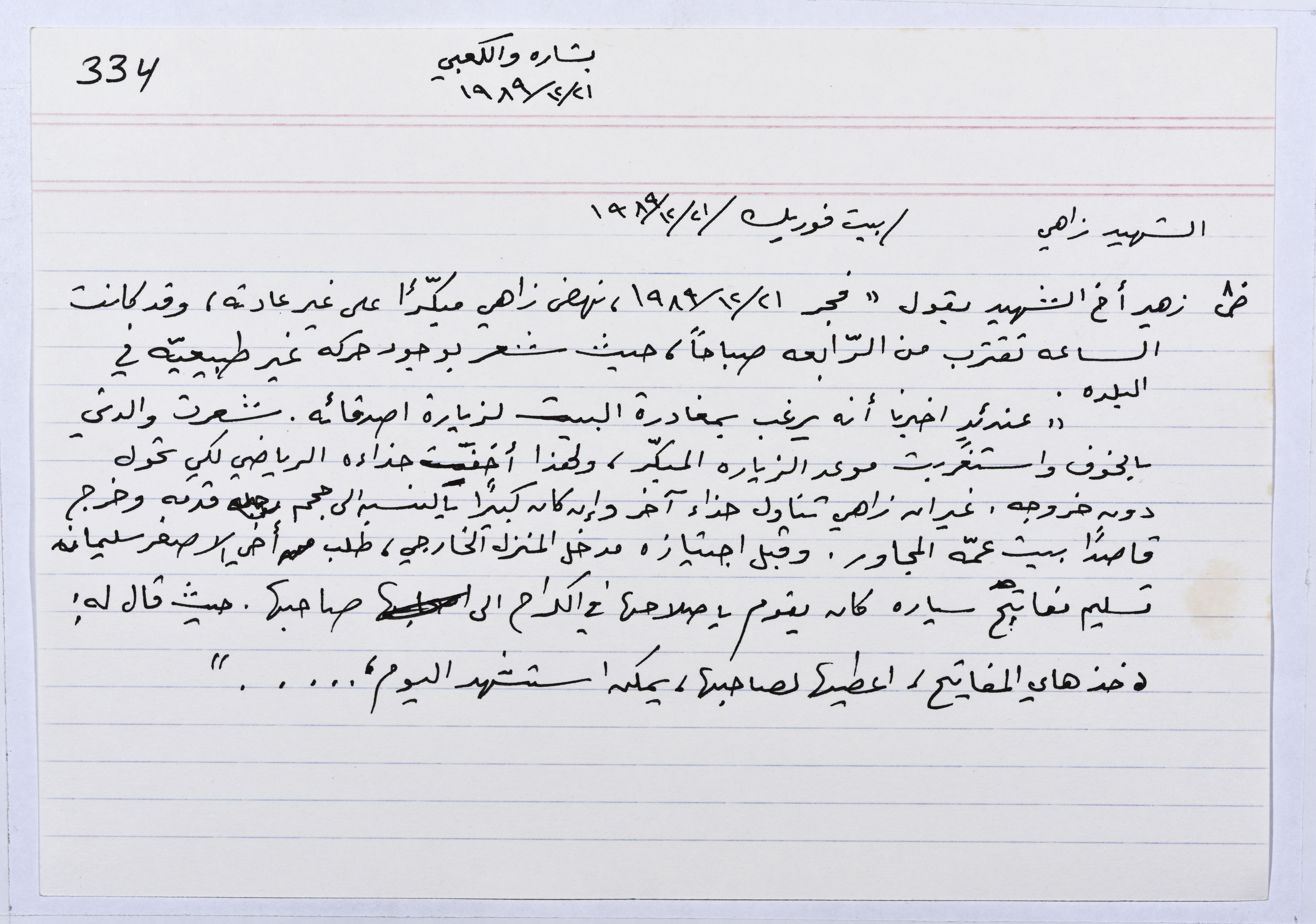 بطاقة وُثِّق عليها حكاية من الانتفاضة بعنوان الشهيد زاهي صلاح