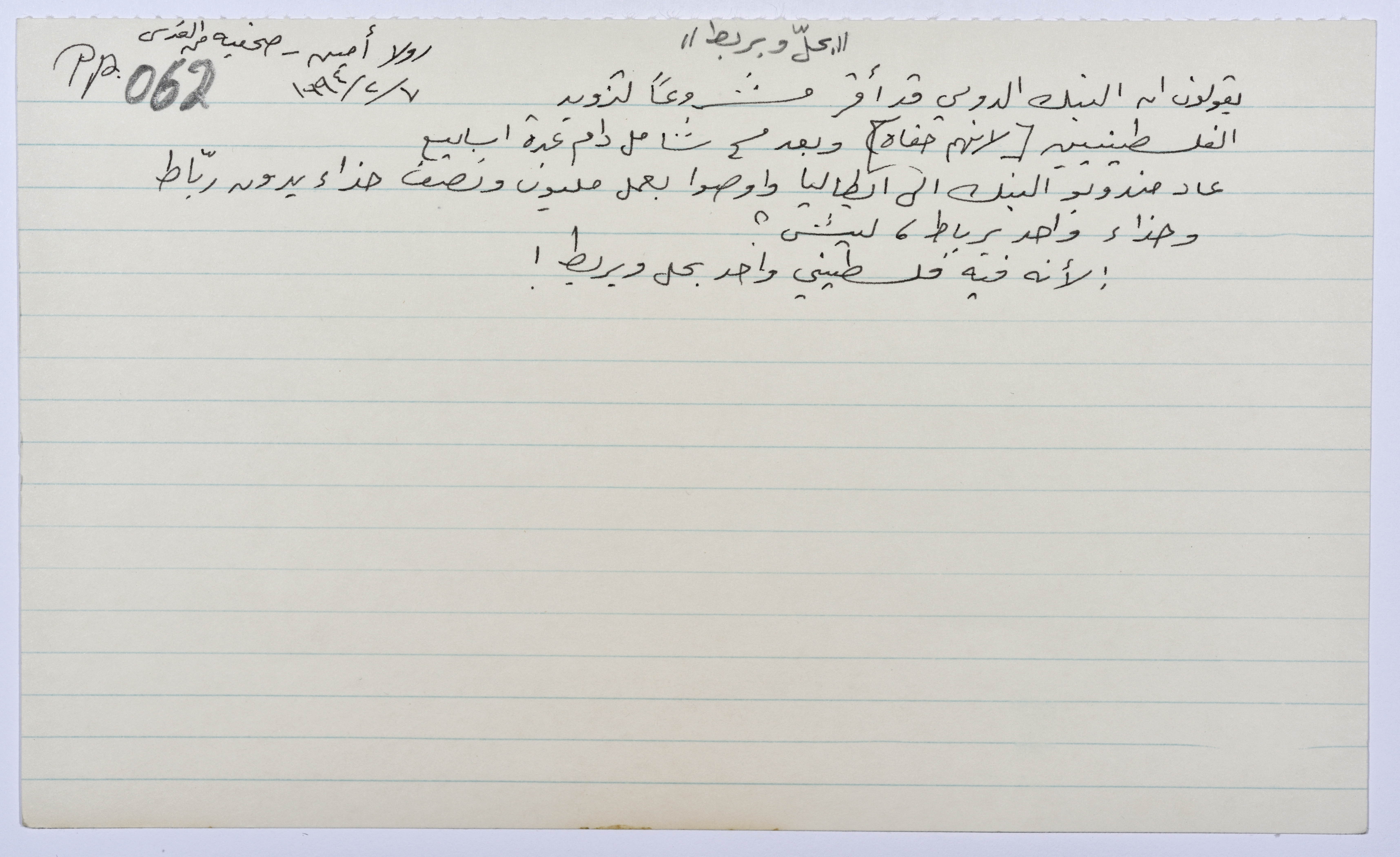 These jokes and stories were collected and recorded by Sharif Kanaana, from the late 1980s until 2005. Each card includes the name of the narrator, the place of residence and the date.