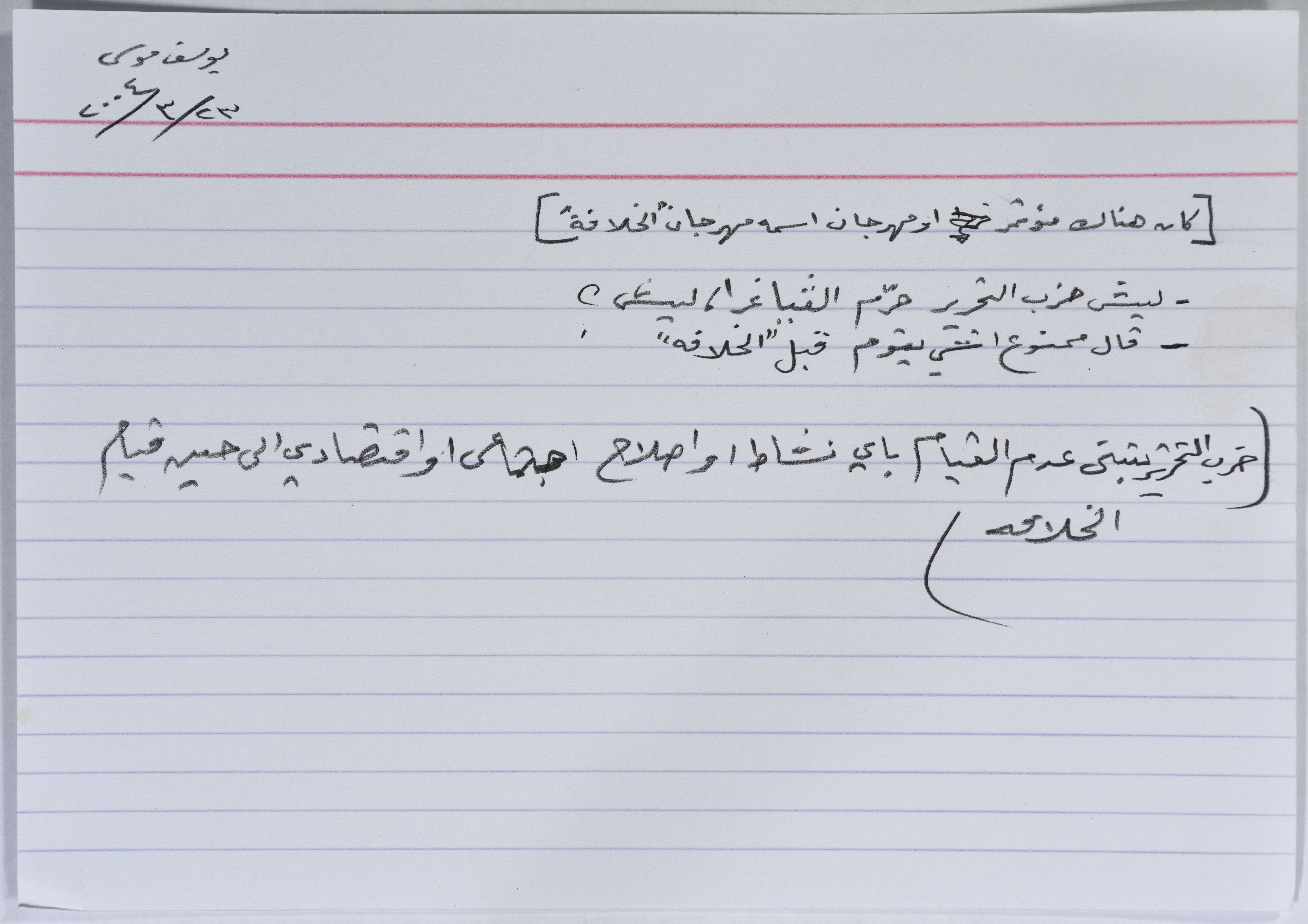 بطاقة وُثِّق عليها نكتة بعنوان قيام الخلافة