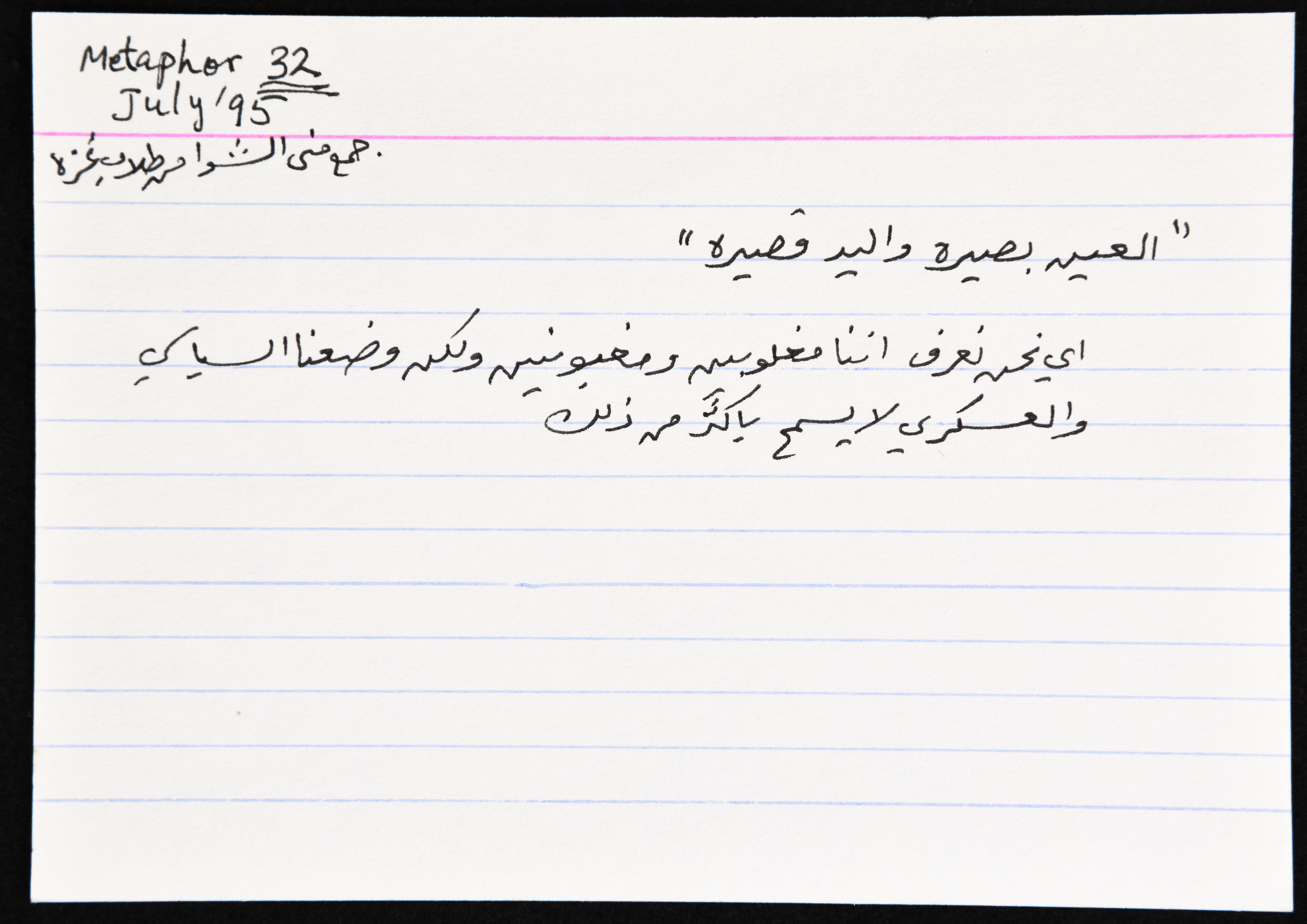 بطاقة وُثِّق عليها مثل شعبي بعنوان "العين بصيرة"