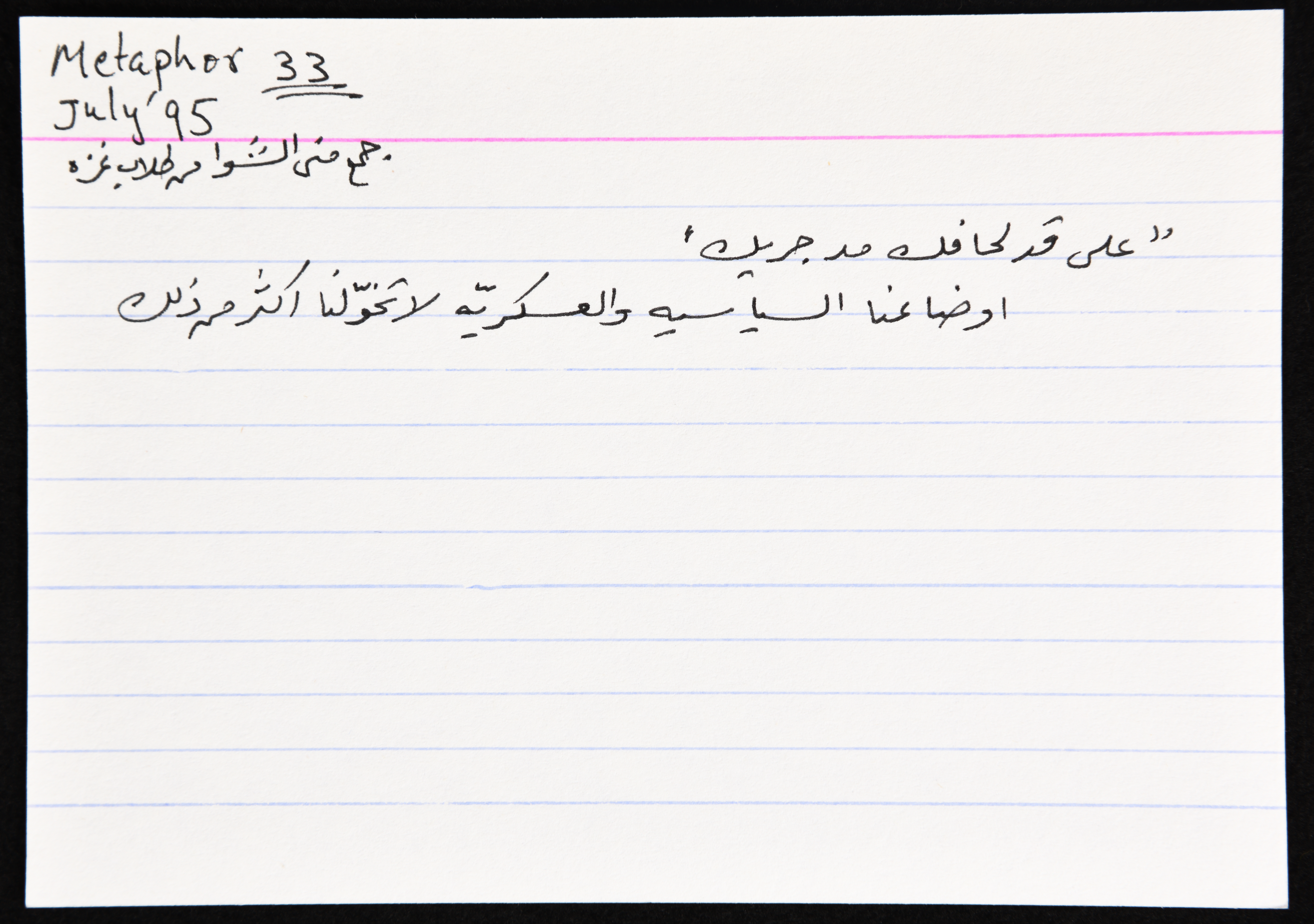 جُمعت هذه النكت من قِبل شريف كناعنة، بدأ بجمعها من أواخر الثمانينيات حتى منتصف العقد الأول من القرن الواحد العشرين. تتضمن البطاقة اسم راوي النكتة ومكان سكنه والتاريخ.