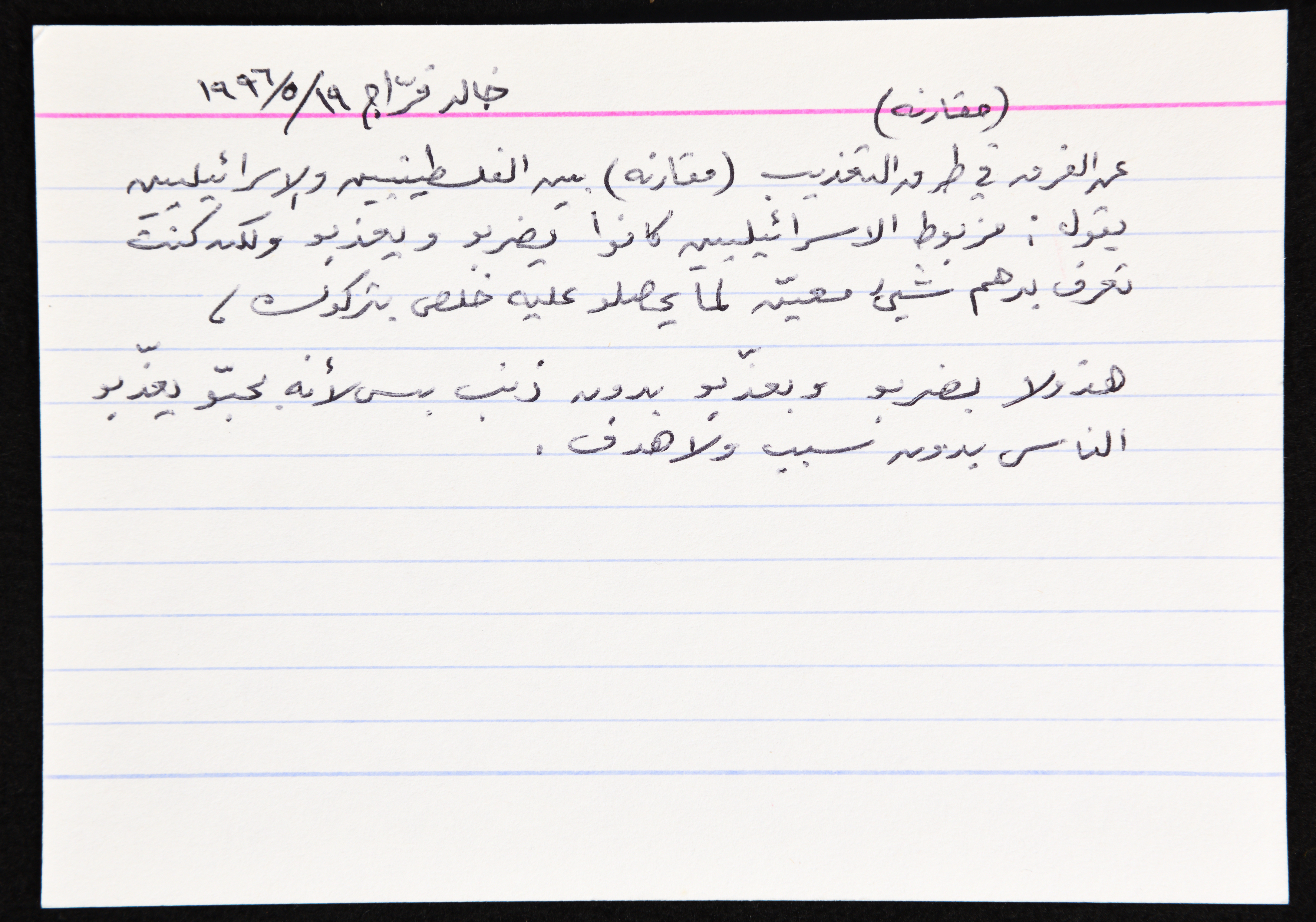 بطاقة وُثِّق عليها مقارنة بين الإسرائيليين والفلسطينيين في التعذيب