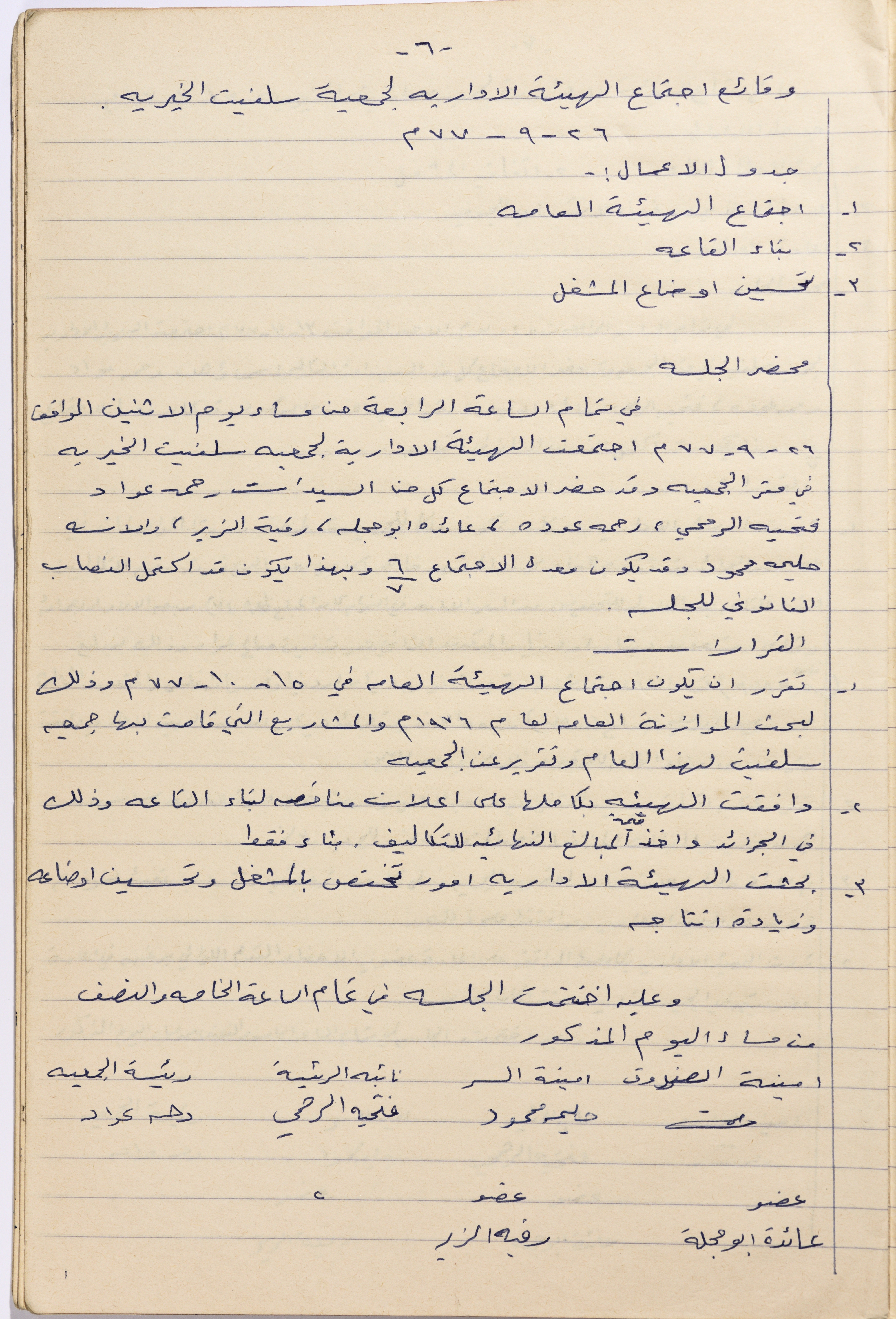 A document containing the meeting minutes of the administrative body of the Salfeet Women Charity. The meeting discussed the public body meeting, building the hall, and improving the workshop's conditions. Attendance was 6/7 thus satisfying the required quorum. Decisions: 1. To have the public body's meeting on 15/10/1977 to look into the general budget of 1976 and the charity's projects for this year. 2. The whole body approved the announcement of a tender to build the hall in newspapers and to jot down the final amount of expenses. 3. The administrative body discussed matters related to the workshop, improving its conditions, and increasing its productivity.