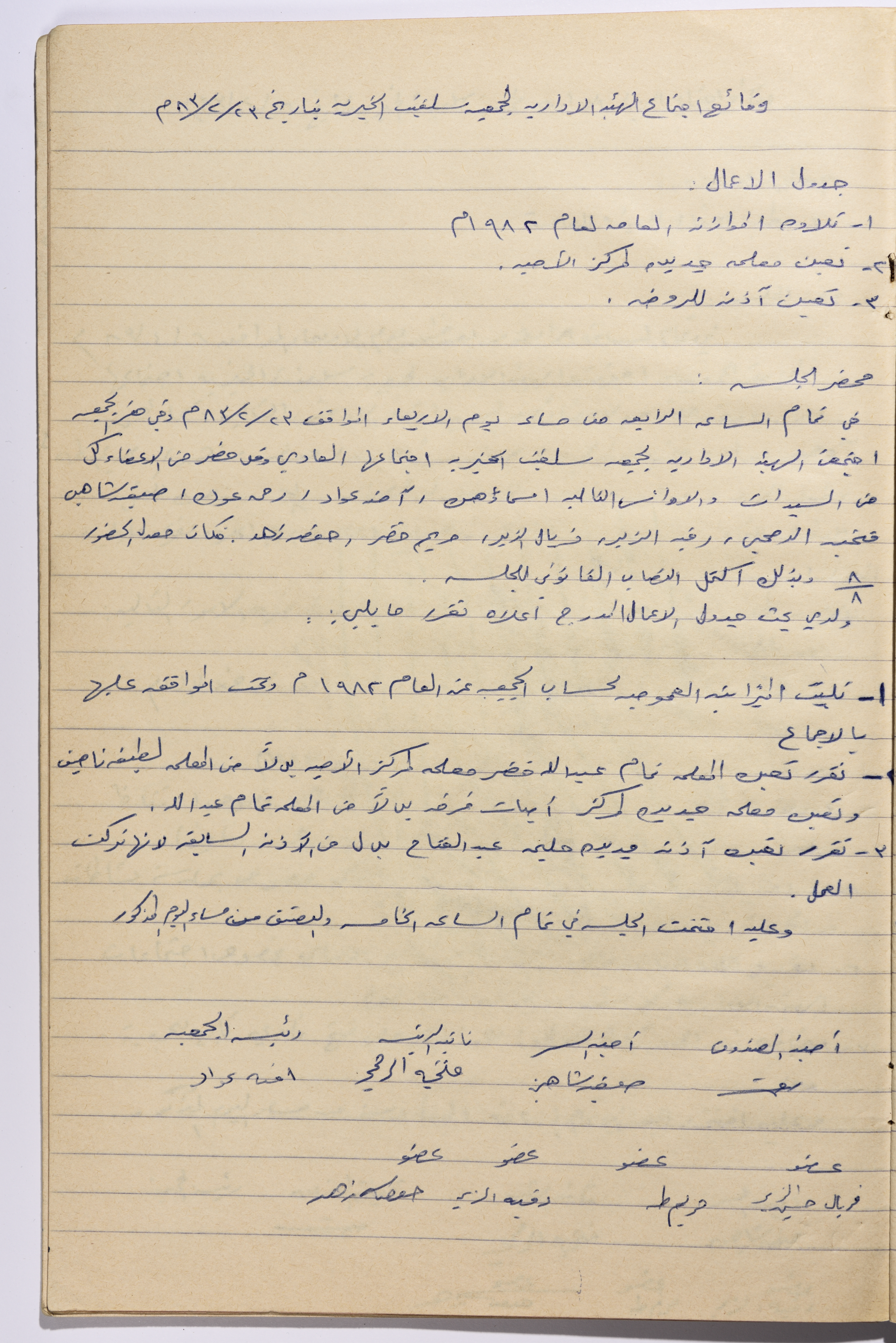 وثيقة تحوي محضر اجتماع الهيئة الإدارية لجمعية سلفيت النسائية الخيرية. وناقشت الجلسة 1- تلاوة الموازنة العامة لعام 1982 2- تعيين معلمة جديدة لمركز الامية 3- تعيين اذنة للروضة بلغ معدل الحضور للجلسة 8 وبذلك اكتمل النصاب القانوني للجلسة . القرارات :- 1- تليت الميزانية العمومية لحساب الجمعية عن العام 1982 وتمت الموافقة عليها بالاجماع 2- تقرر تعيين المعلمة تمام الاخضر معلمة لمركز الامية بدلا من المعلمة لطيفة ناصيف 3- تقرر تعيين اذنة جديدة وهي حليمة عبد الفتاح بدلا من الاذنة السابقة