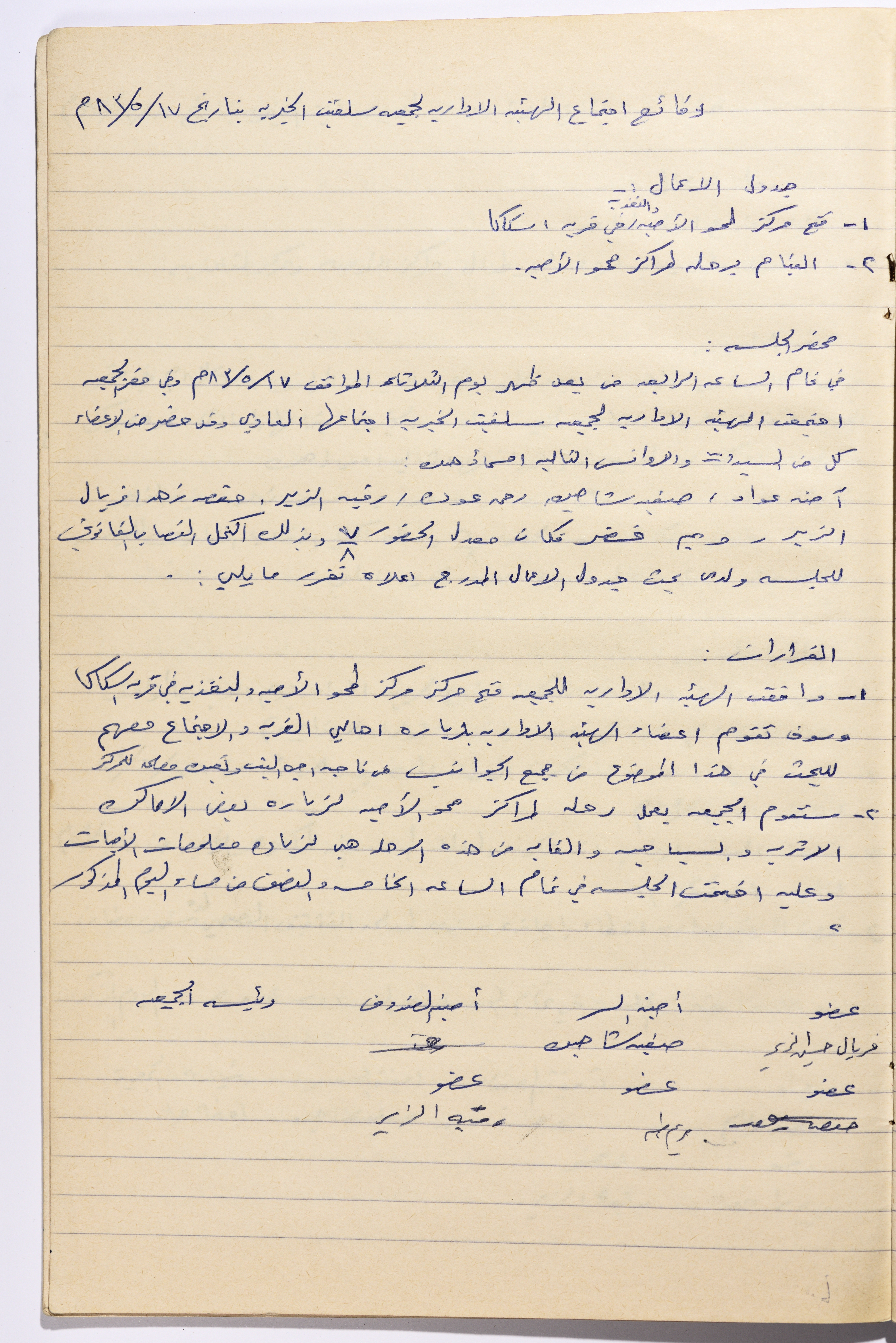A document containing the meeting minutes of the administrative body of the Salfeet Women Charity. Meeting discussed: 1. Opening a literacy and proper nutrition centres in the village of Iskaka 2. Trip for literacy centres Attendance was at 7/8, thus meeting the required quorum. Decisions 1. The administrative body approved opening literacy and proper nutrition centres in Iskaka 2. The Charity to do a trip for the literacy centre to go to some archaeological and touristic places.