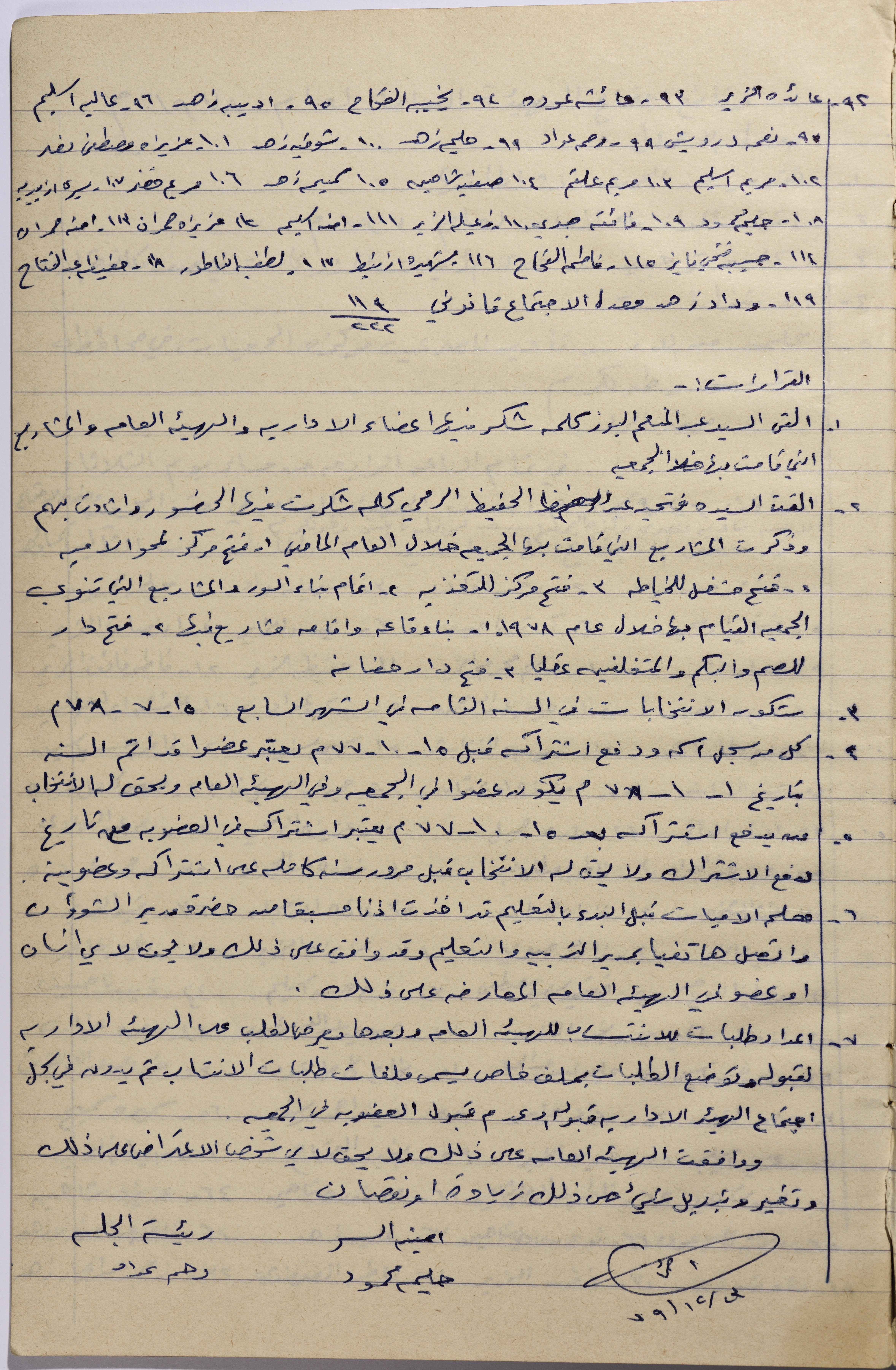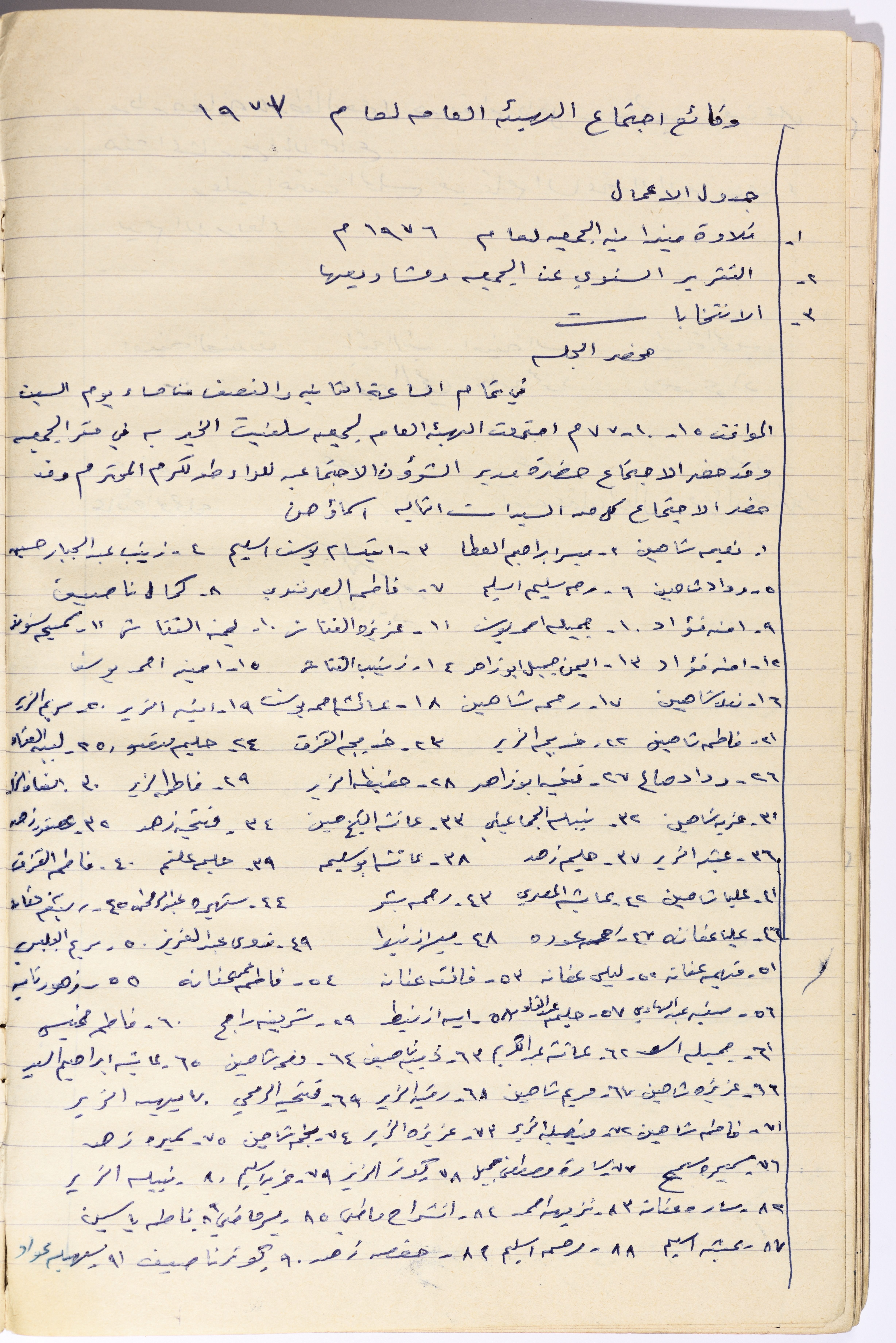 A document holding the meeting minutes of the public body of the Salfeet Women Charity. Meeting discussed 1. General budget of 1976 2. Annual report on the Charity and its projects 3. Elections Attendance was 119/222, thus meeting the required quorum. Decisions 1. Mr Abdul-Mun’em thanked the administrative and public bodies for the Charity's projects. 2. Ms Fathiyya Abdulhafiz Al-Ramahi thanked the attendees and mentioned the Charity's projects for last year: - Literacy centre - Sewing workshop - Proper nutrition centre - Completing the wall The planned projects for 1978 are: - Building a hall for further projects - Opening a centre for the hearing and speech impaired and the mentally challenged - Opening a kindergarten 3. Elections will be in the second year in July 4. Every person who signed a name and paid the subscription before 15/10/1977 is considered a member and has completed a year by 1/1/1978, a member of the Charity and the public body and has the right to elect. 5. Whoever pays the subscription after 15/10/1977 is considered a member from the moment of payment and has no right to elect before a full year has passed on his subscription and membership. 6. The literacy centre teacher took permission from the Director of Social Affairs before beginning the education process 7. Preparing requests of membership for the public body to present to the administrative body afterwards for acceptance.