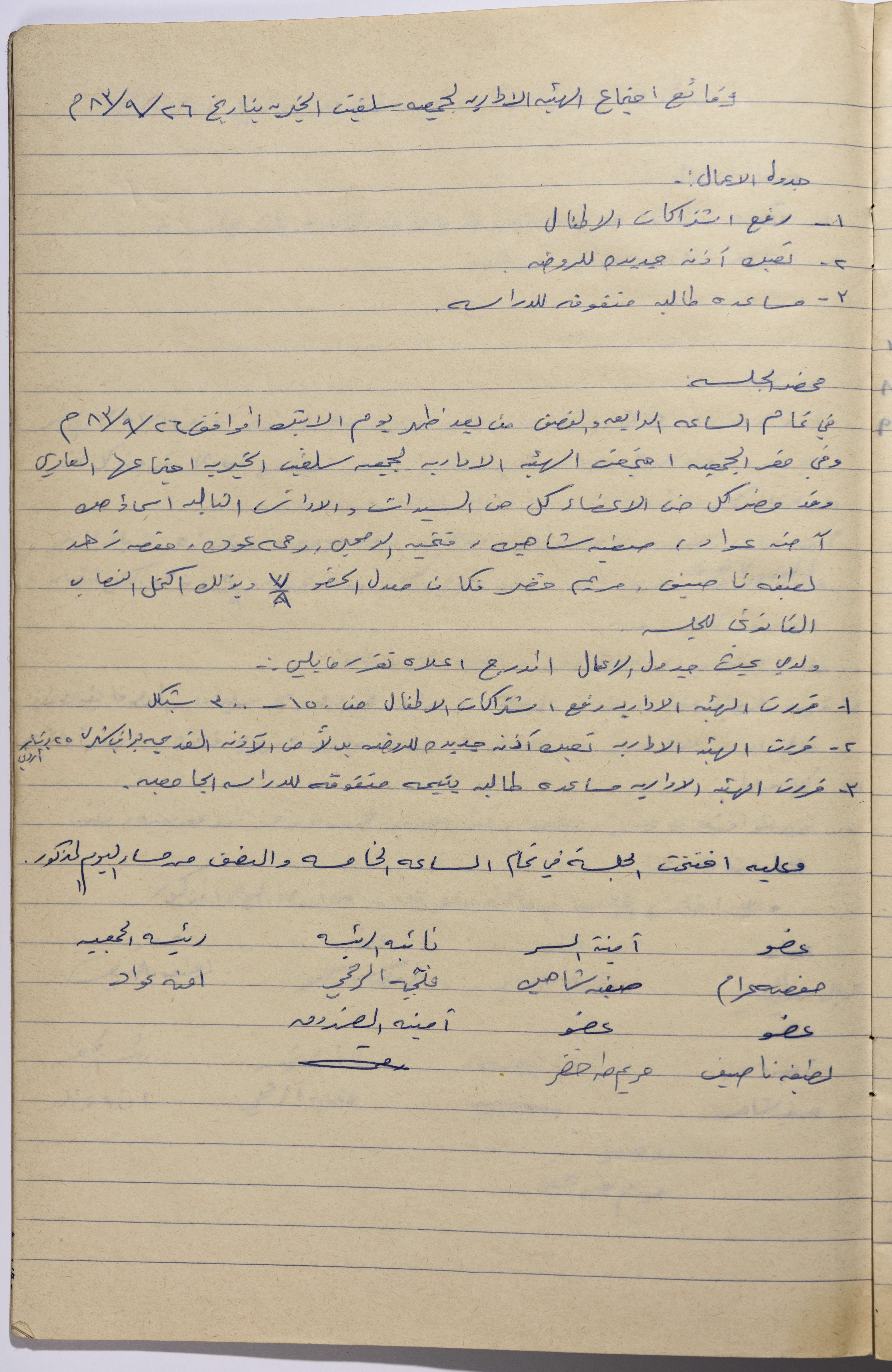 محضر اجتماع الهيئة الإدارية لجمعية سلفيت النسائية الخيرية بتاريخ 26\9\1983