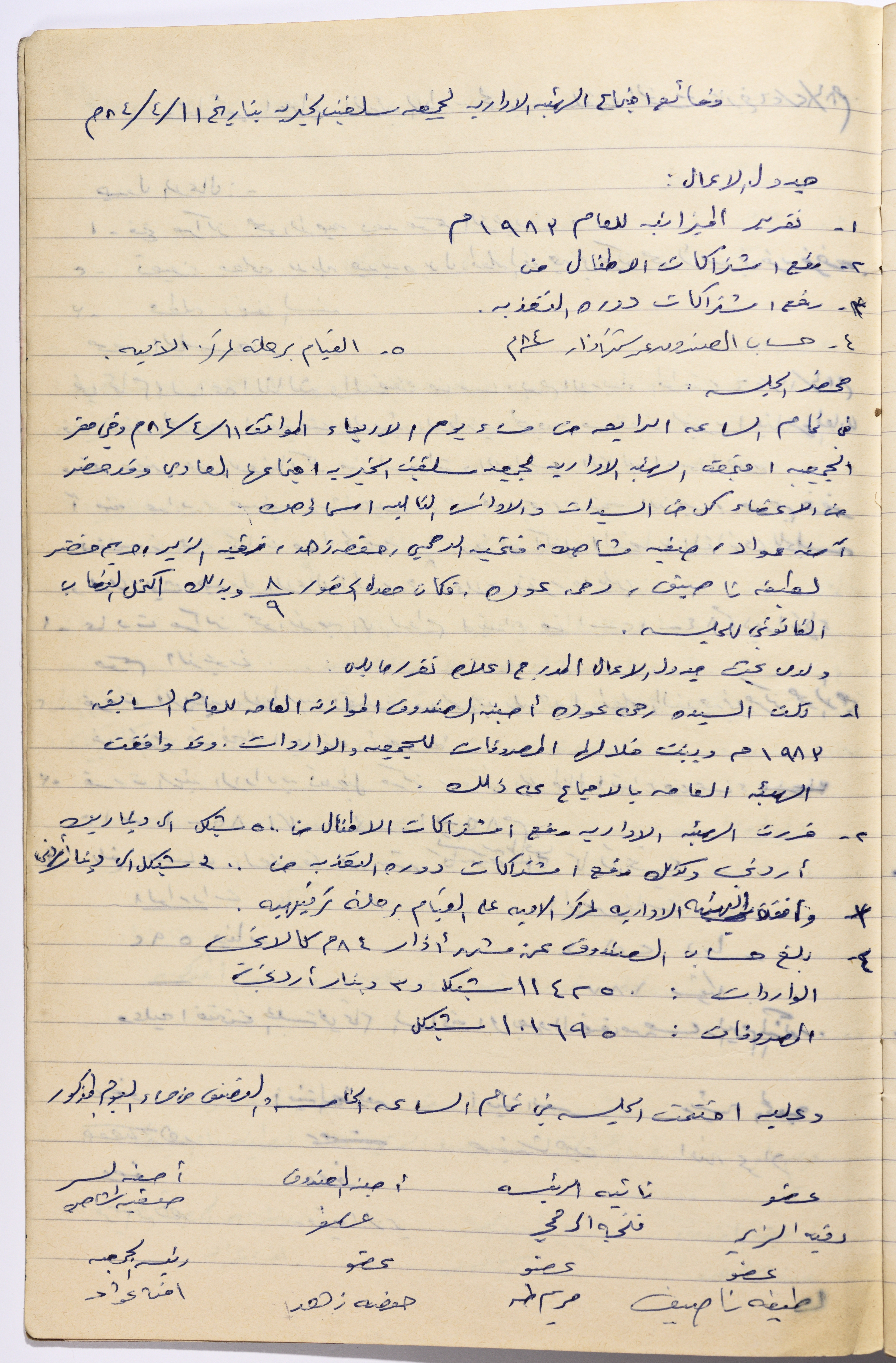 وثيقة تحوي محضر اجتماع الهيئة الإدارية لجمعية سلفيت النسائية الخيرية. وناقشت الجلسة 1- تقرير الميزانية العامة للعام 1983 2- رفع اشتراكات الاطفال 3- رفع اشتراكات دورة التغذية 4- حساب الصندوق عن شهر اذار 1984 5- القيام برحلة لمركز الامية بلغ عدد الحضور للجلسة 8 وبذلك اكتمل النصاب القانوني للجلسة . القرارات :- 1- تليت السيدة رحمة عودة امينة الصندوق الميزانية وتمت الموافقة عليها . 2- قررت الهيئة الادارية رفع اشتراكات الاطفال واشتراكات دورة التغذية 3- بلغ حساب الصندوق عن شهر اذار 84 كالاتي :- الواردات : 11425 شيكل المصروفات :- 101695