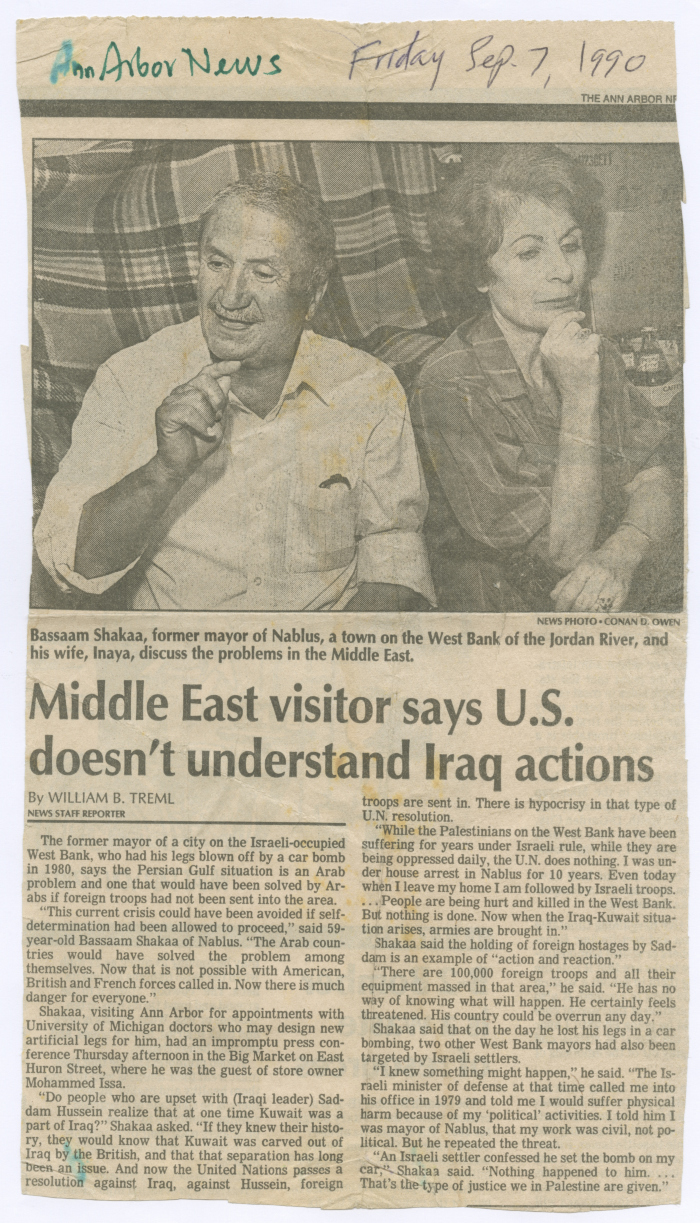 "ضيف من الشرق الأوسط يقول أن الولايات المتحدة لا تفهم تصرفات العراق"، مقال بقلم ويليام تريمل، جريدة آن آربور نيوز، 7 أيلول 1990