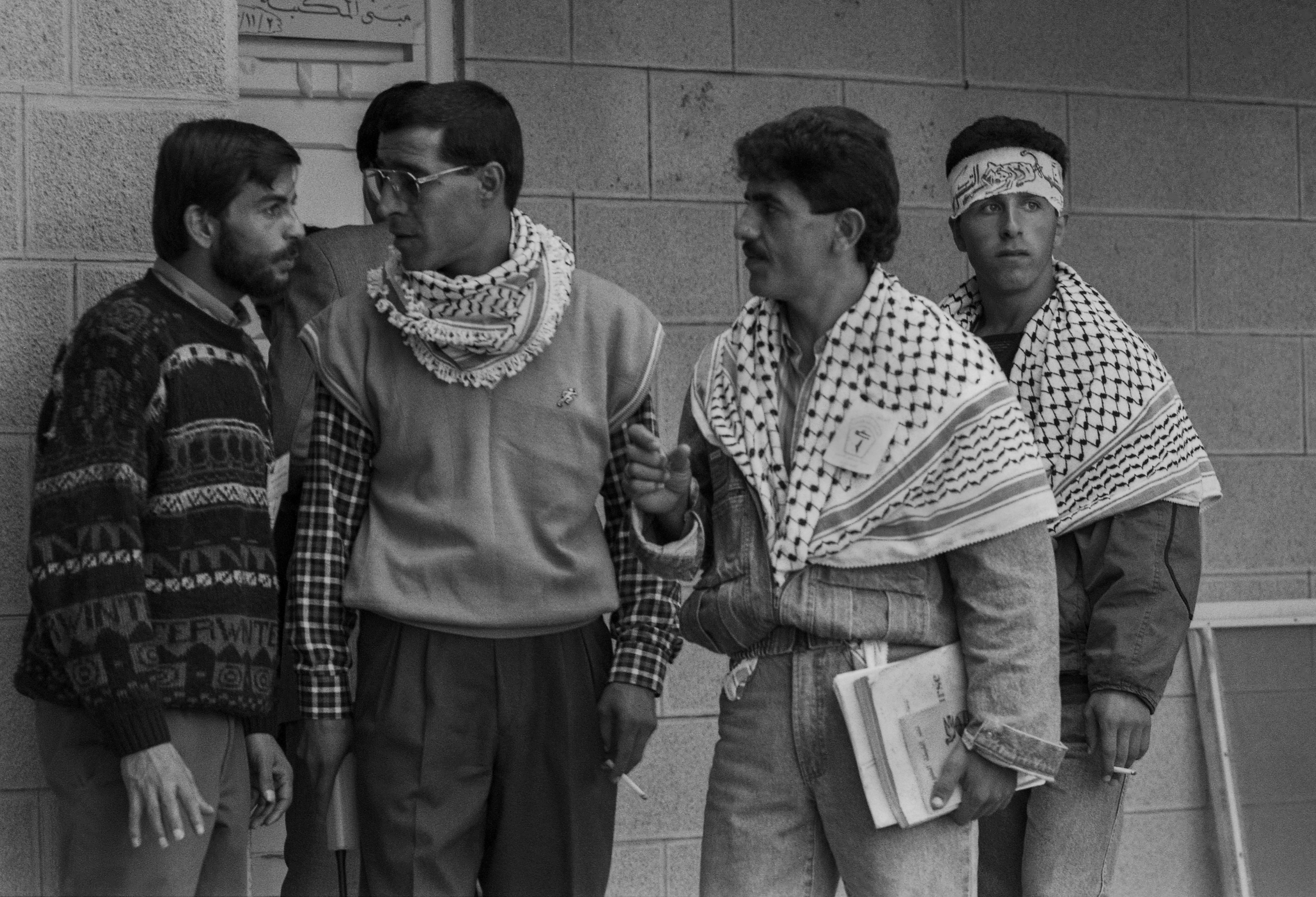 صورة غير ملونة لطلاب جامعة بيرزيت يرتدون الكوفية الفلسطينية مع شعارات كتلهم الطلابية خلال انتخابات مؤتمر مجلس الطلبة.