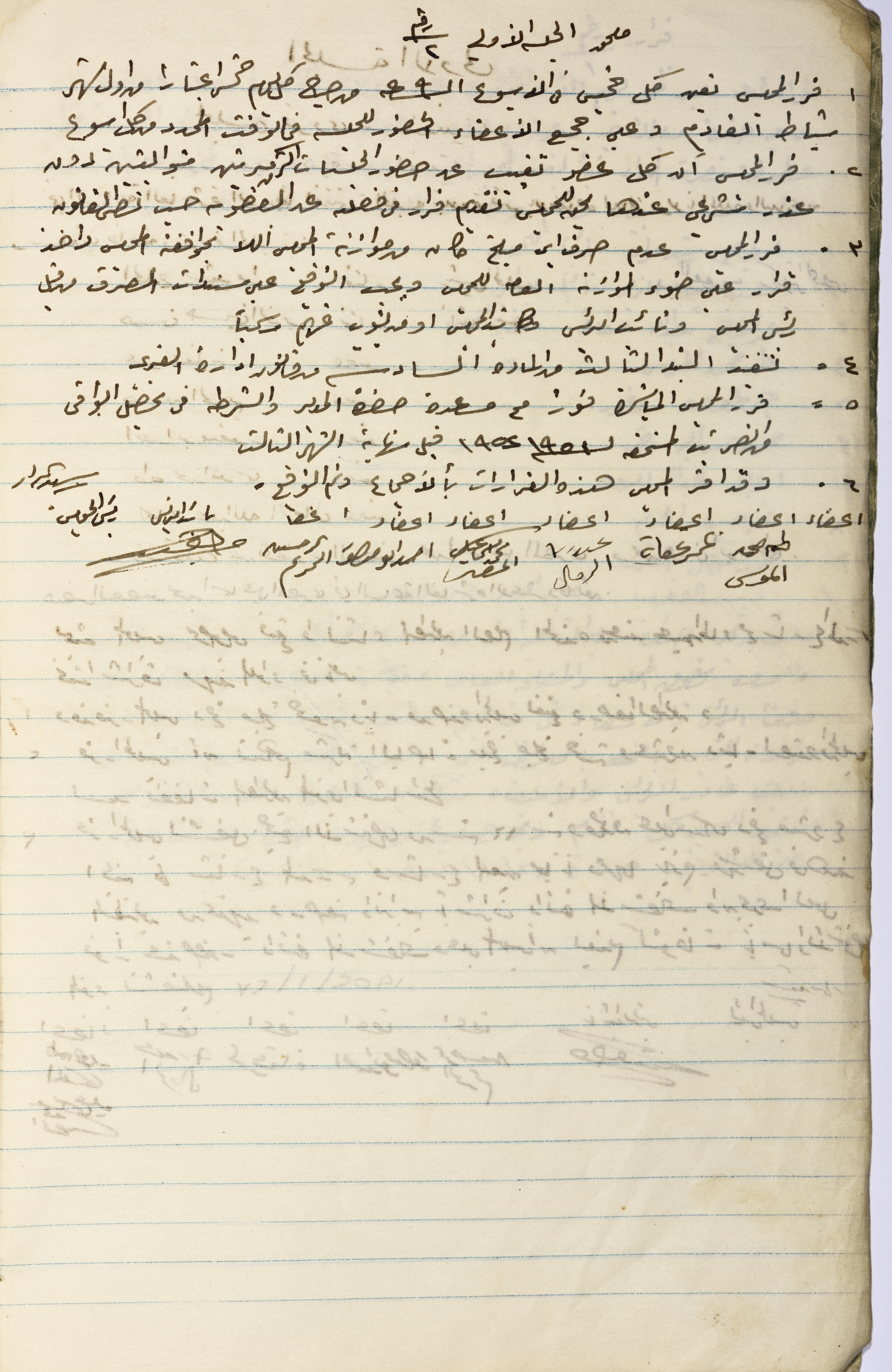 Handwritten on 27 January 1952, this document shows the annex to the minutes of session No. 1, convened by the Salfit Village Council on this date. During the session, the Council made several decisions, including that a member of the Council shall be liable to dismissal if he fails to attend two consecutive sessions, that the disbursement of the budget funds shall be conditional on the Council's approval in addition to assisting police and the District Administration in tax collection.