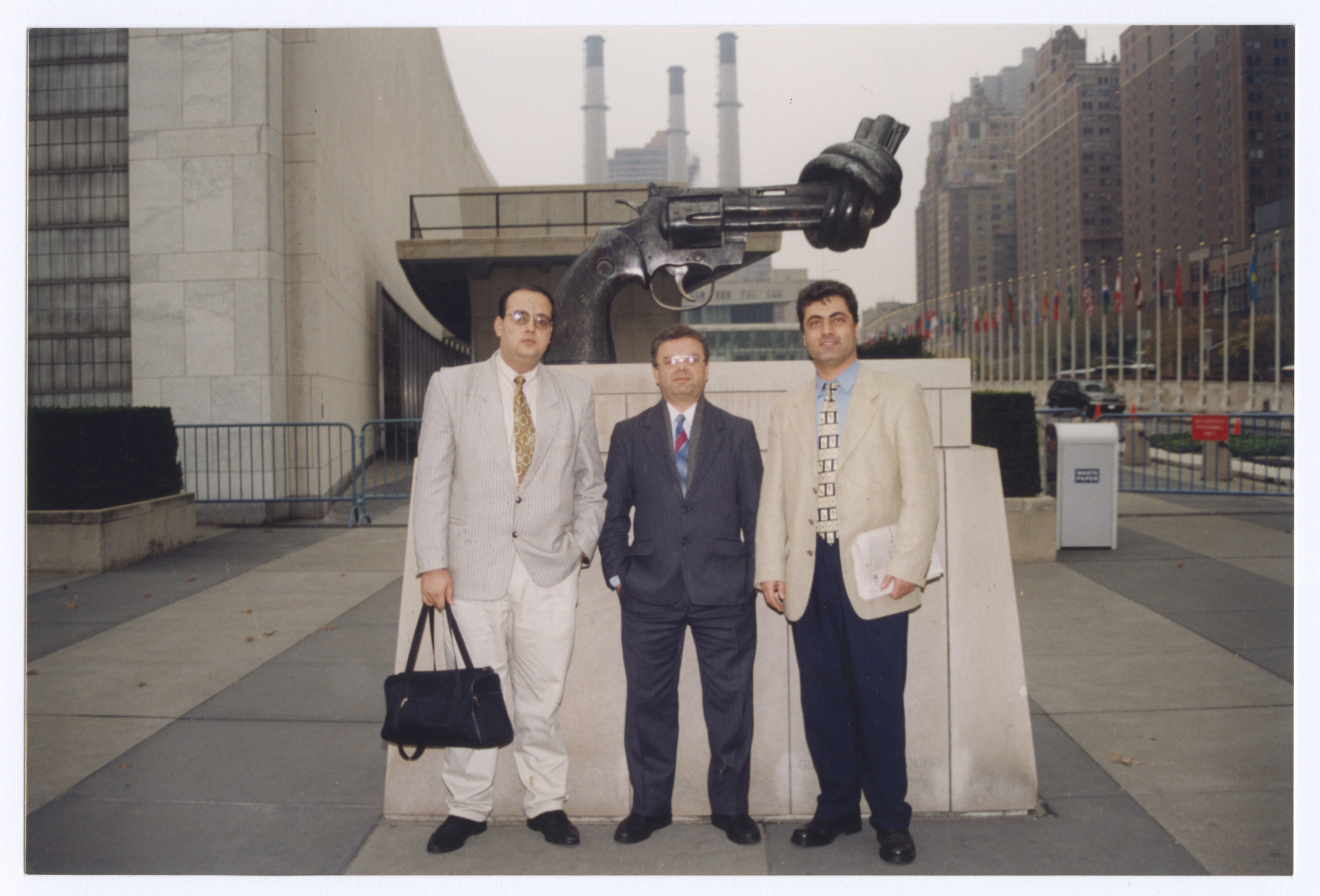 الأشخاص من اليمين: سيف الدين صحفي من " غزة" ، عدنان داغر، محمد جودة " مراسل وفا في غزة" أمام ساحة هيئة الأمم المتحدة في نيويورك