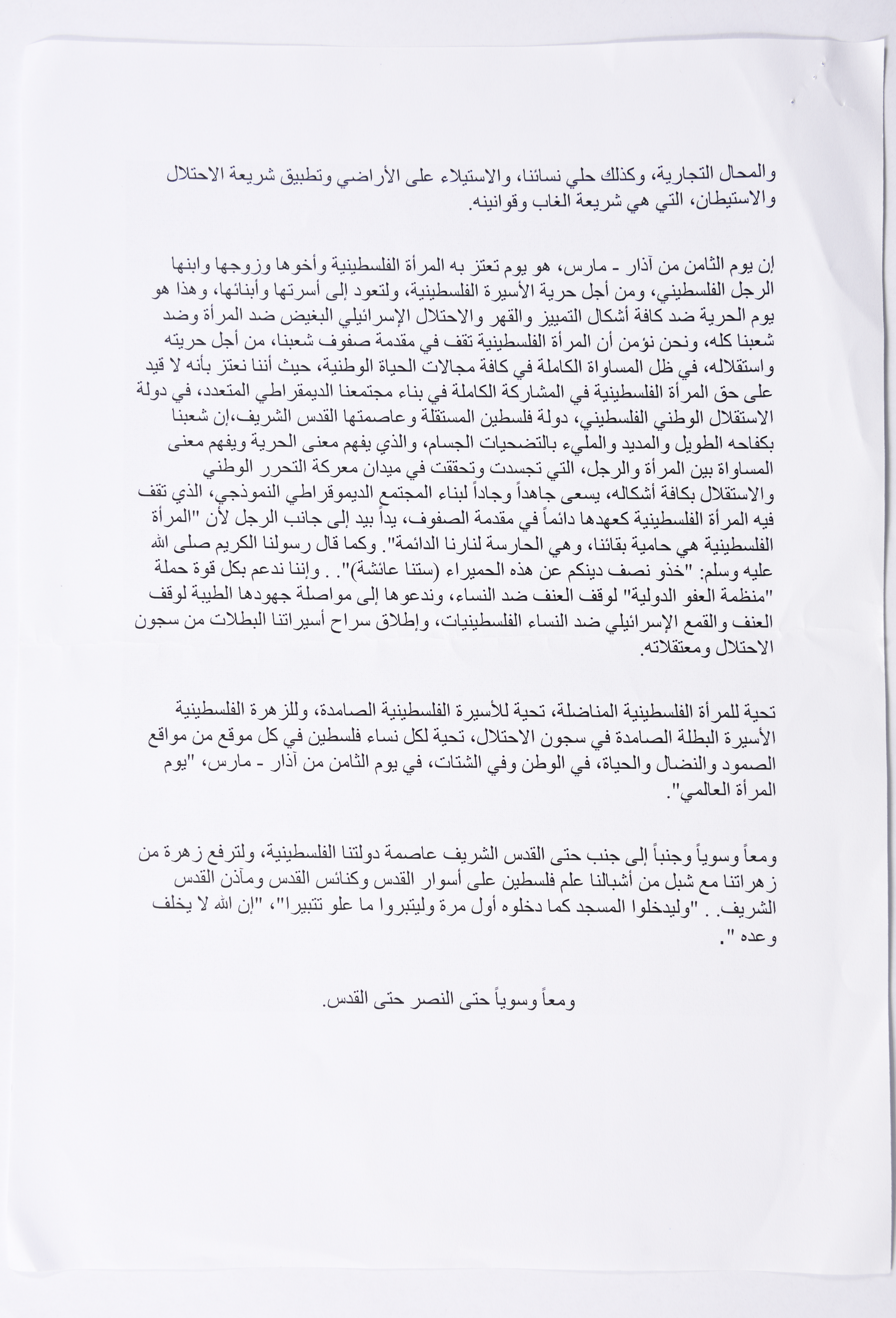 خطاب الرئيس الفلسطينيي الراحل ياسر عرفات في يوم المرأة العالمي عام 2004، والذي أكد فيه على أن المجتمع الفلسطينييرفض كل أشكال التمييز ضد المرأة وأن التمييز الوحيد الذي يقره الشعب الفلسطيني هو التمييز الإيجابي لصالح المرأة ولمشاركتها الكاملة وتمكينها من أداء دورها الأصيل في صنع المستقبل الوطني جنباً إلى جنب مع الرجل.