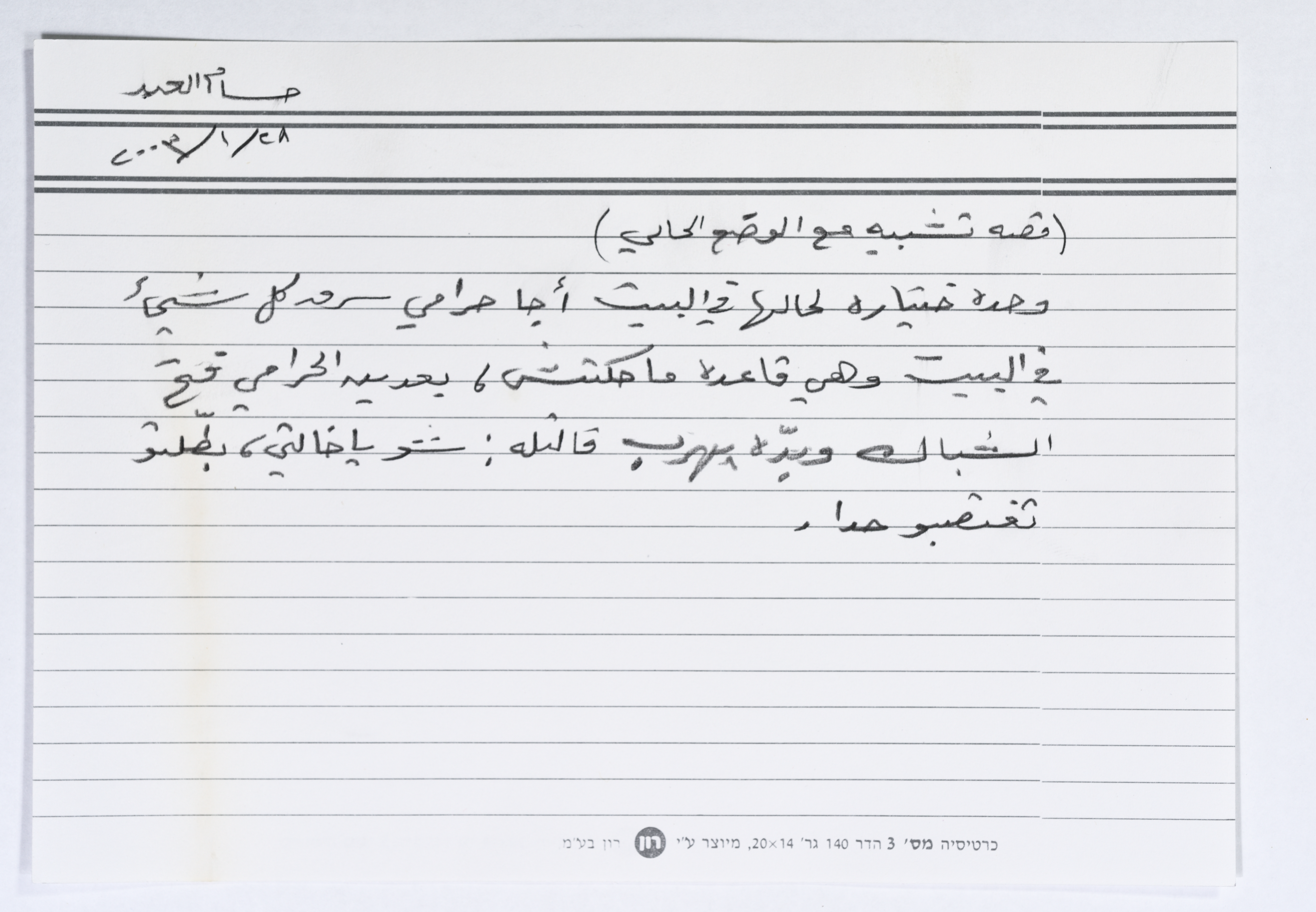 جُمعت هذه النكت من قِبل شريف كناعنة، بدأ بجمعها من أواخر الثمانينيات حتى منتصف العقد الأول من القرن الواحد العشرين. تتضمن البطاقة اسم راوي النكتة ومكان سكنه والتاريخ.
