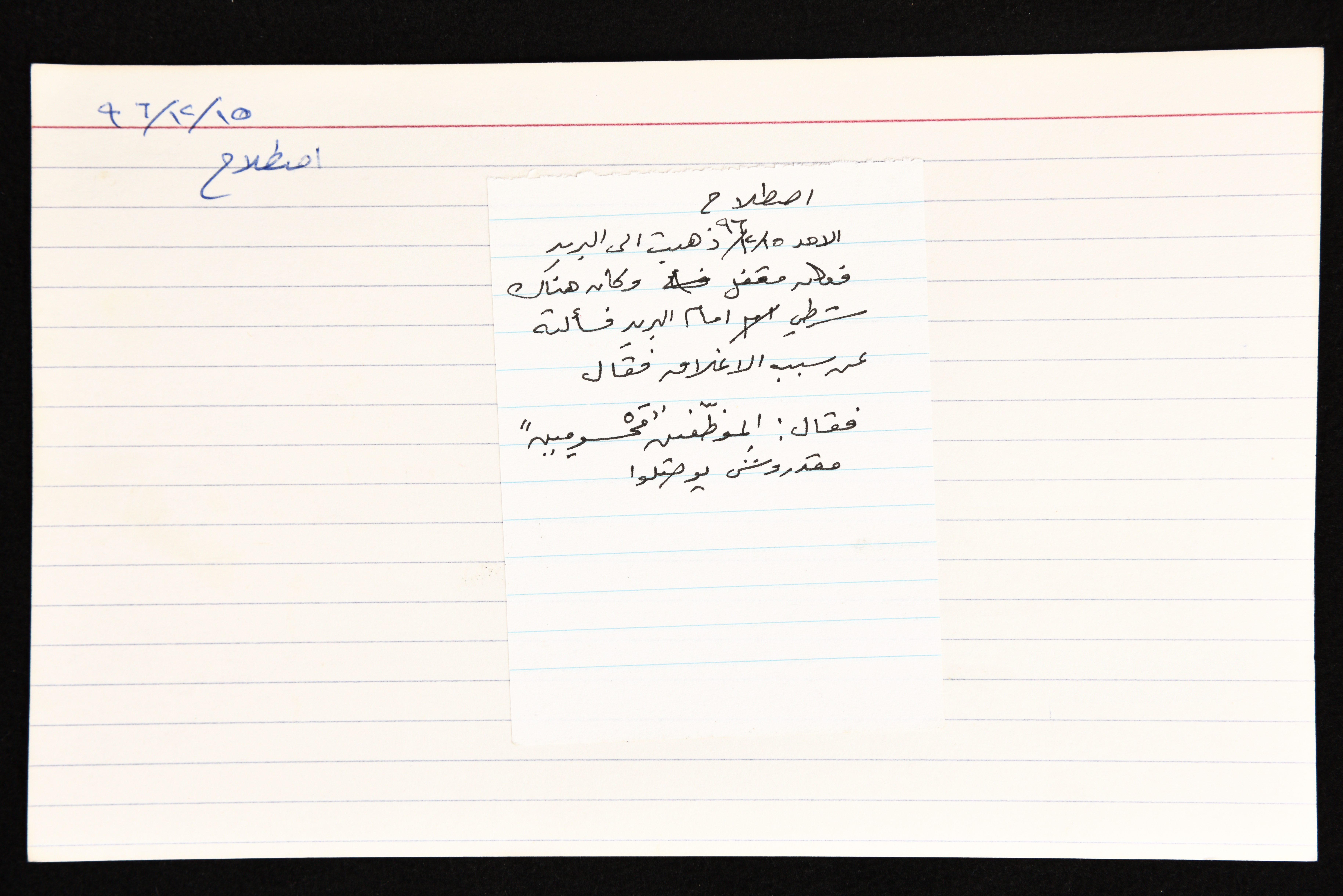 بطاقة وُثِّق عليها حكاية من الانتفاضة بعنوان "مكتب البريد مغلق"