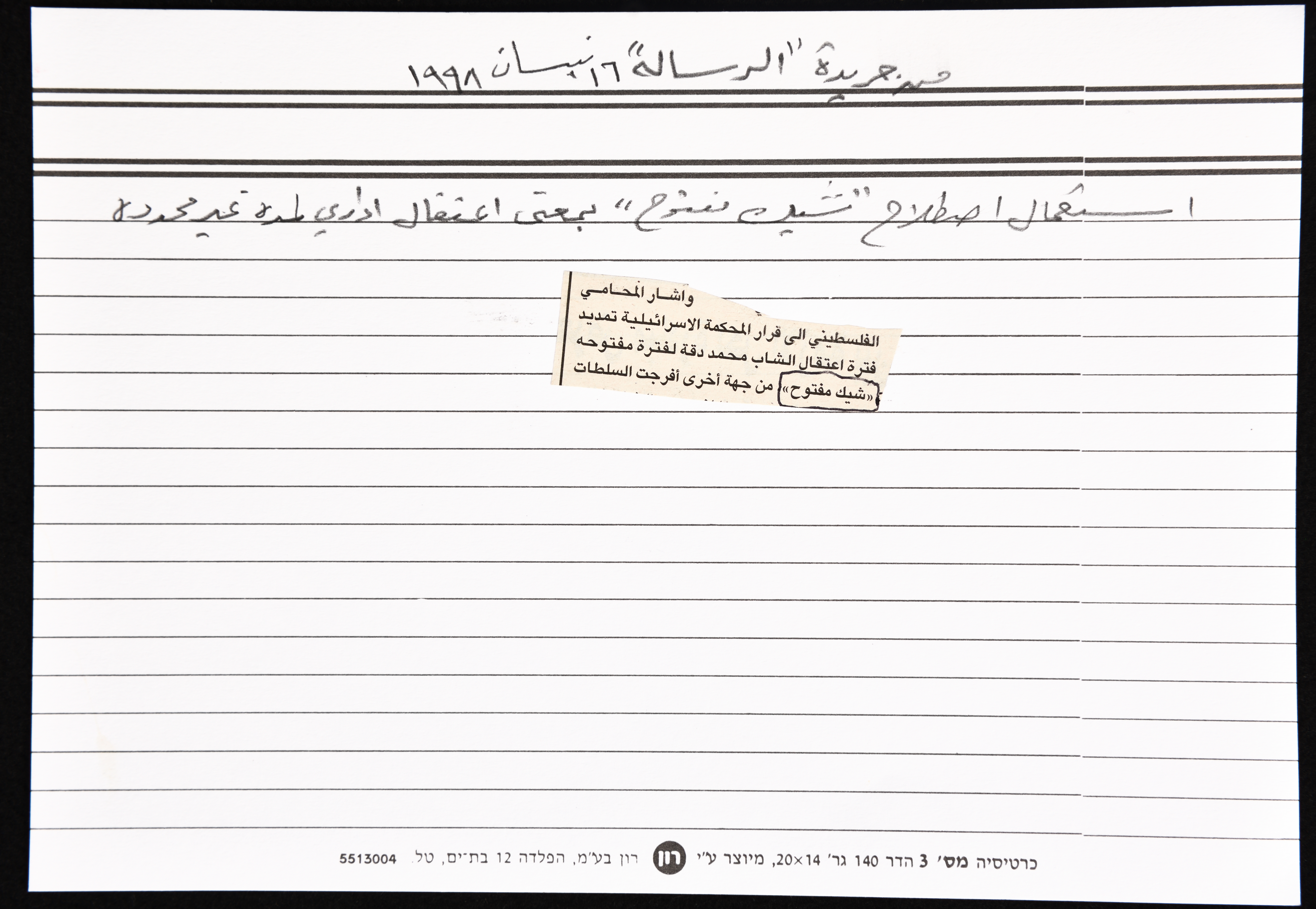 بطاقة وُثِّق عليها مصطلح "شيك مفتوح" انتشر خلال الإنتفاضة الثانية