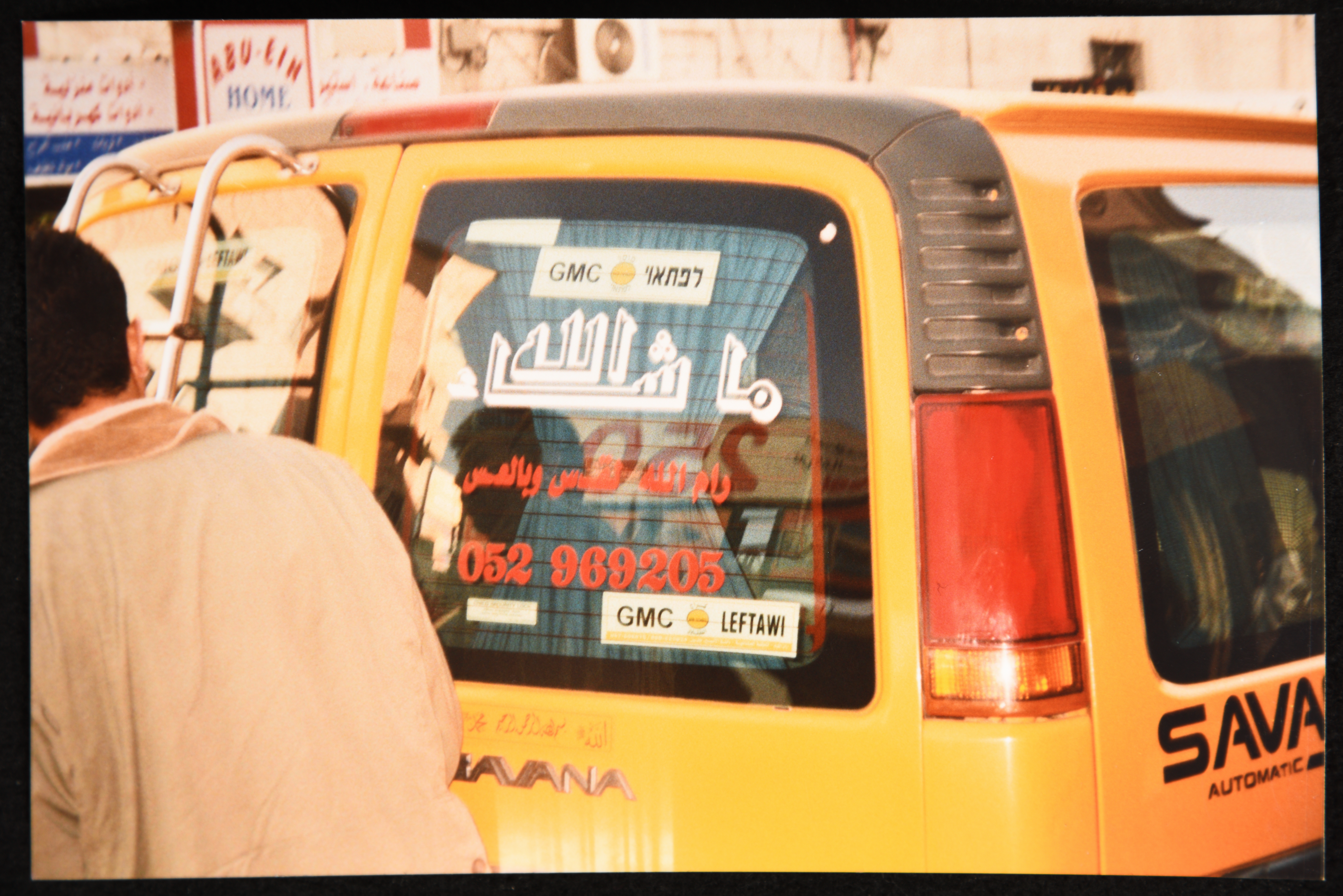 صورة ملونة لعبارات دينية مطبوعة على خلفية سيارة عمومية، طبع أيضا رقم هاتف محمول والخط الذي تسير عليه السيارة.